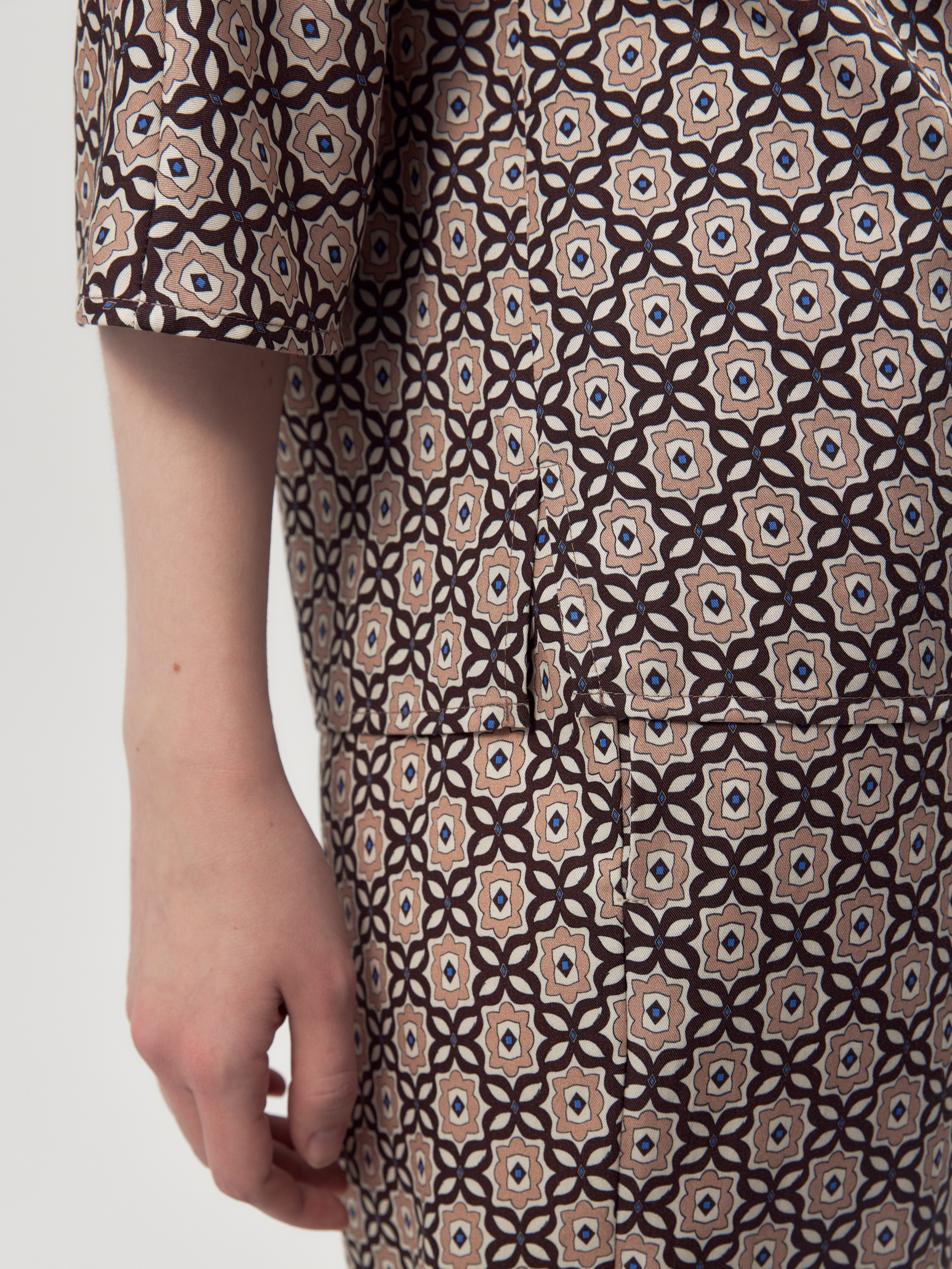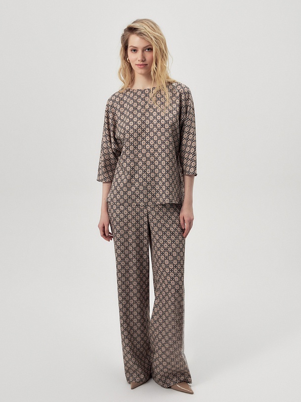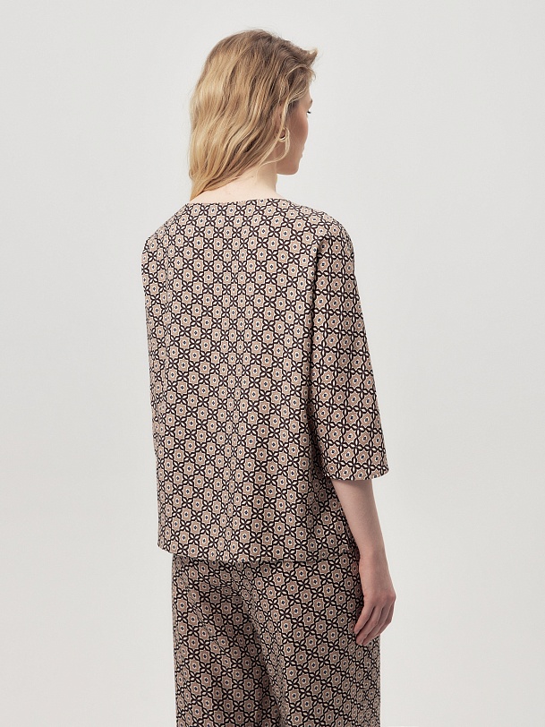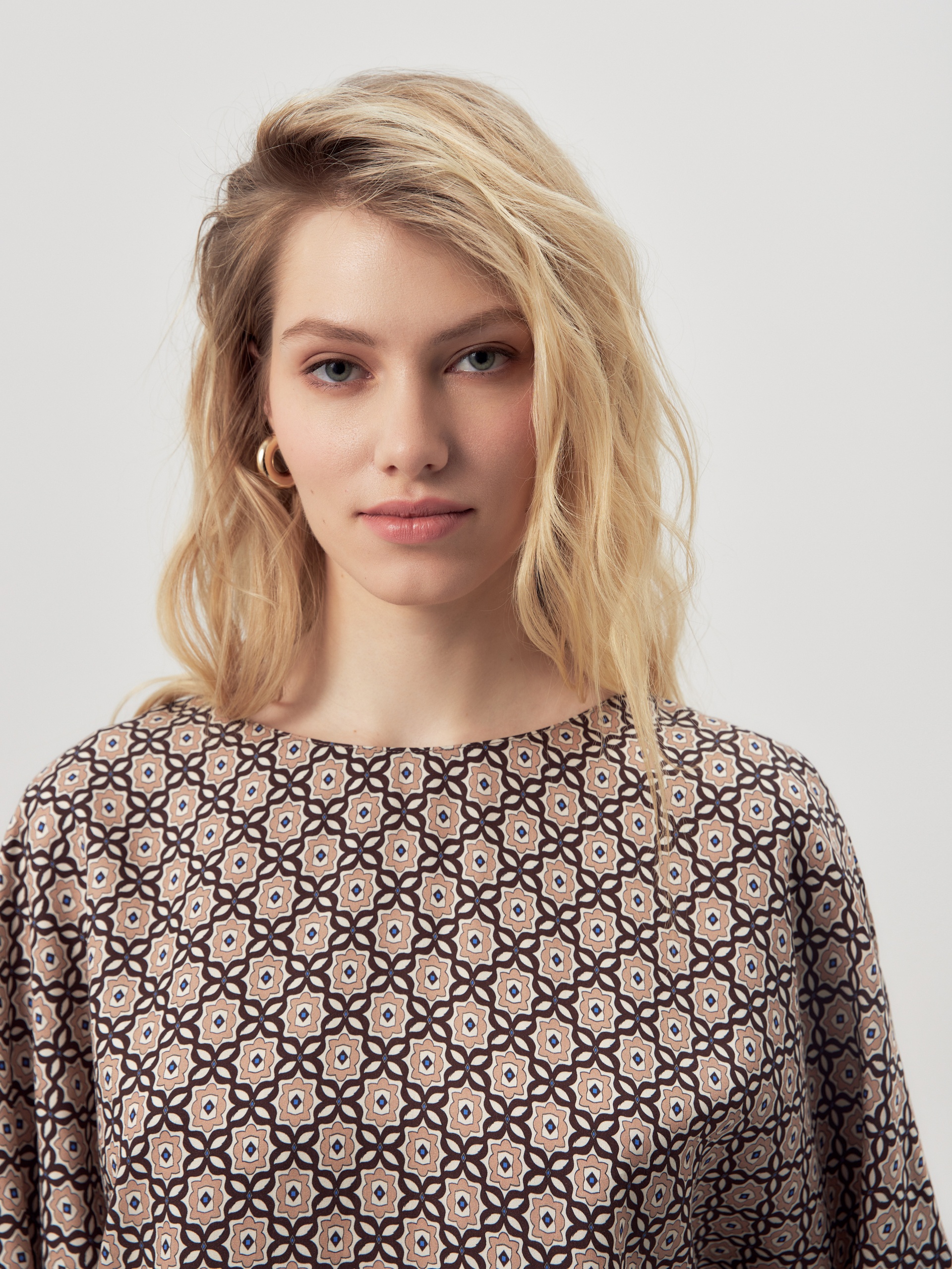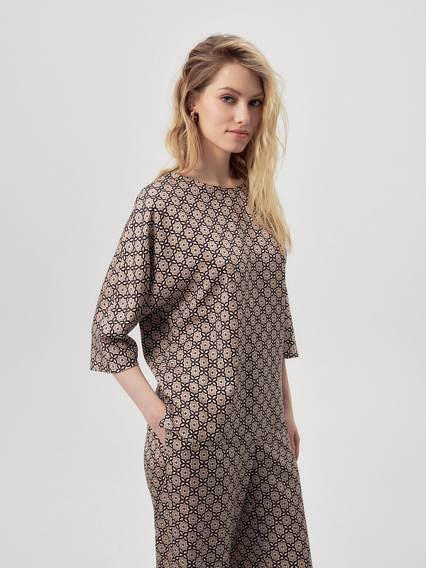 Свободная блуза под в пижамном стиле с вырезом лодочкой и рукавом 7/8. Блуза выполнена из вискозной ткани в крупном галстучном принте.