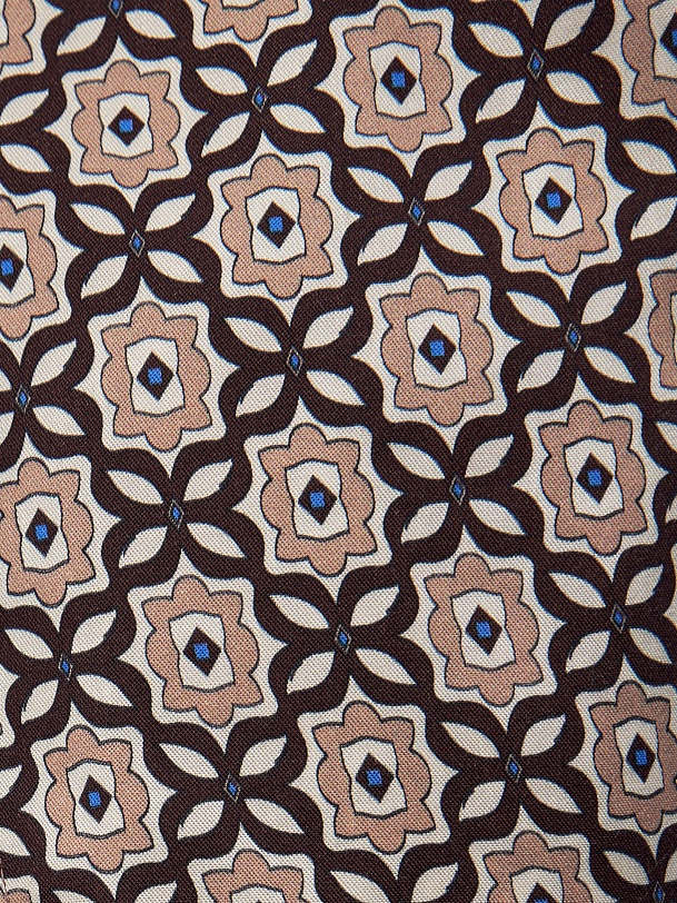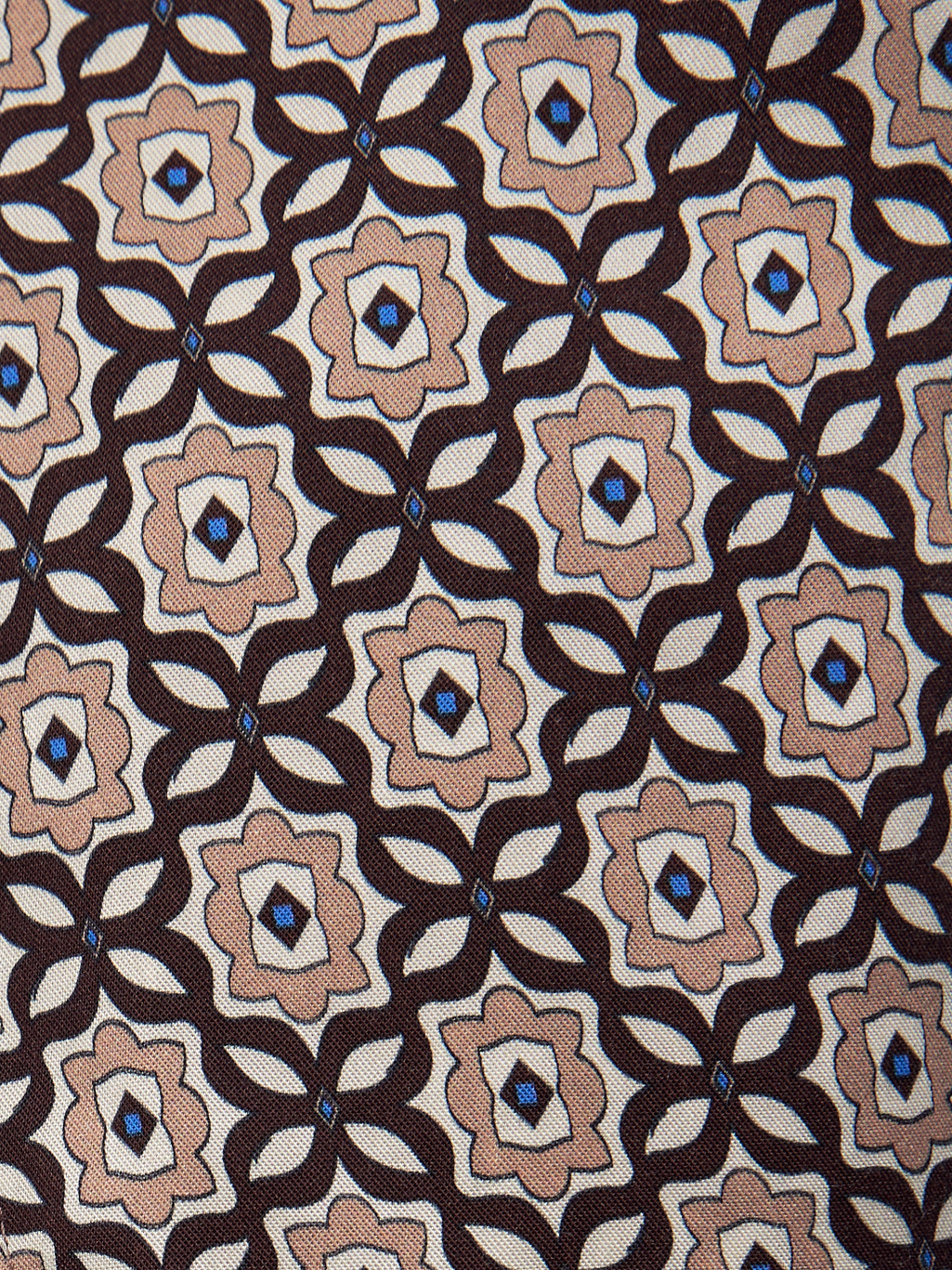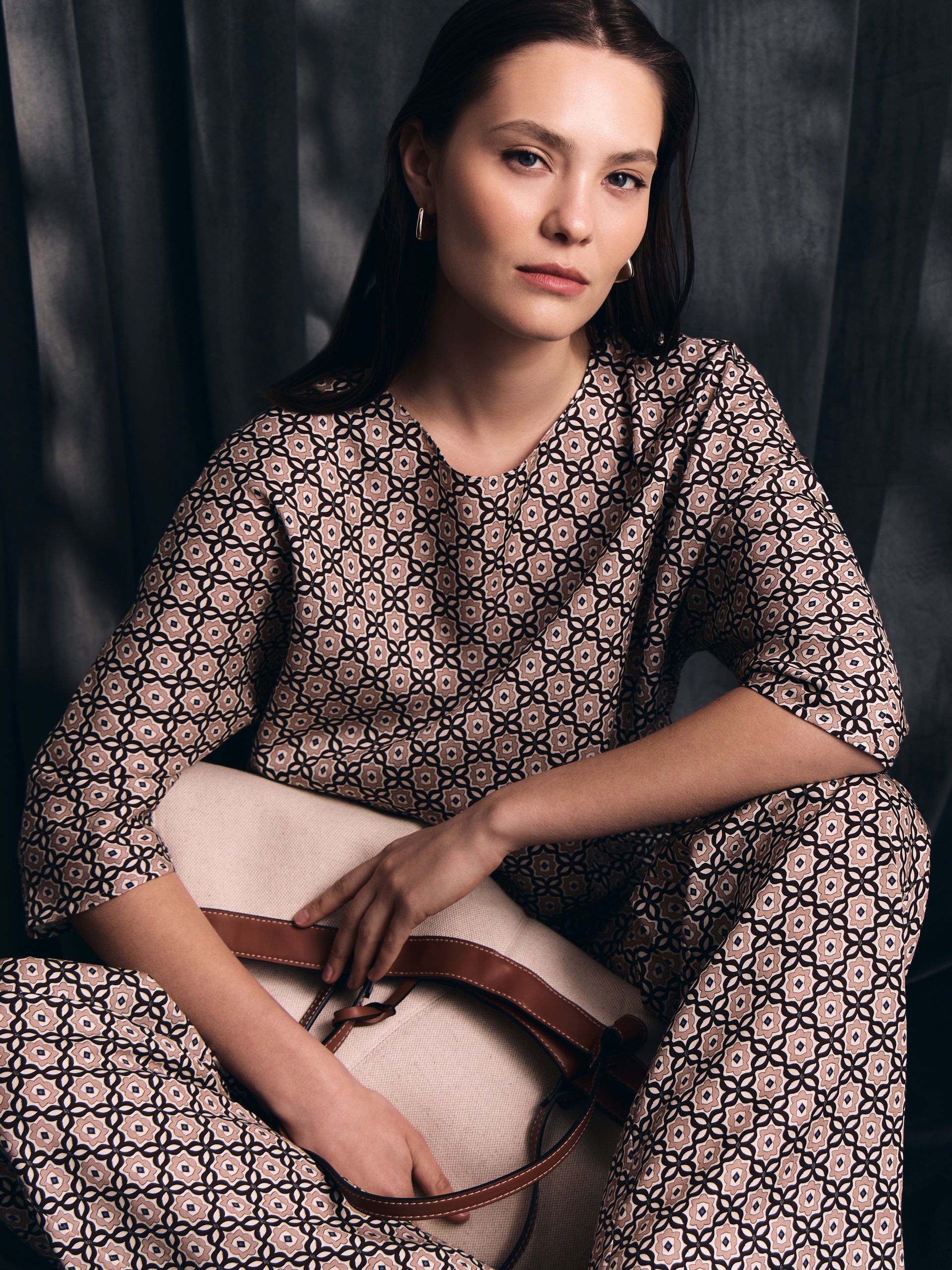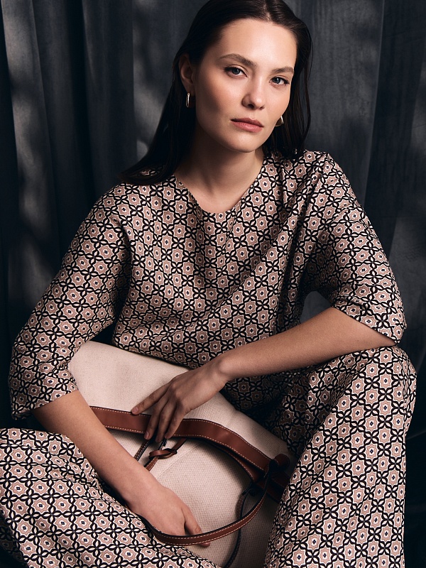 Свободная блуза под в пижамном стиле с вырезом лодочкой и рукавом 7/8. Блуза выполнена из вискозной ткани в крупном галстучном принте.