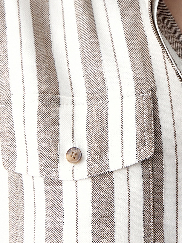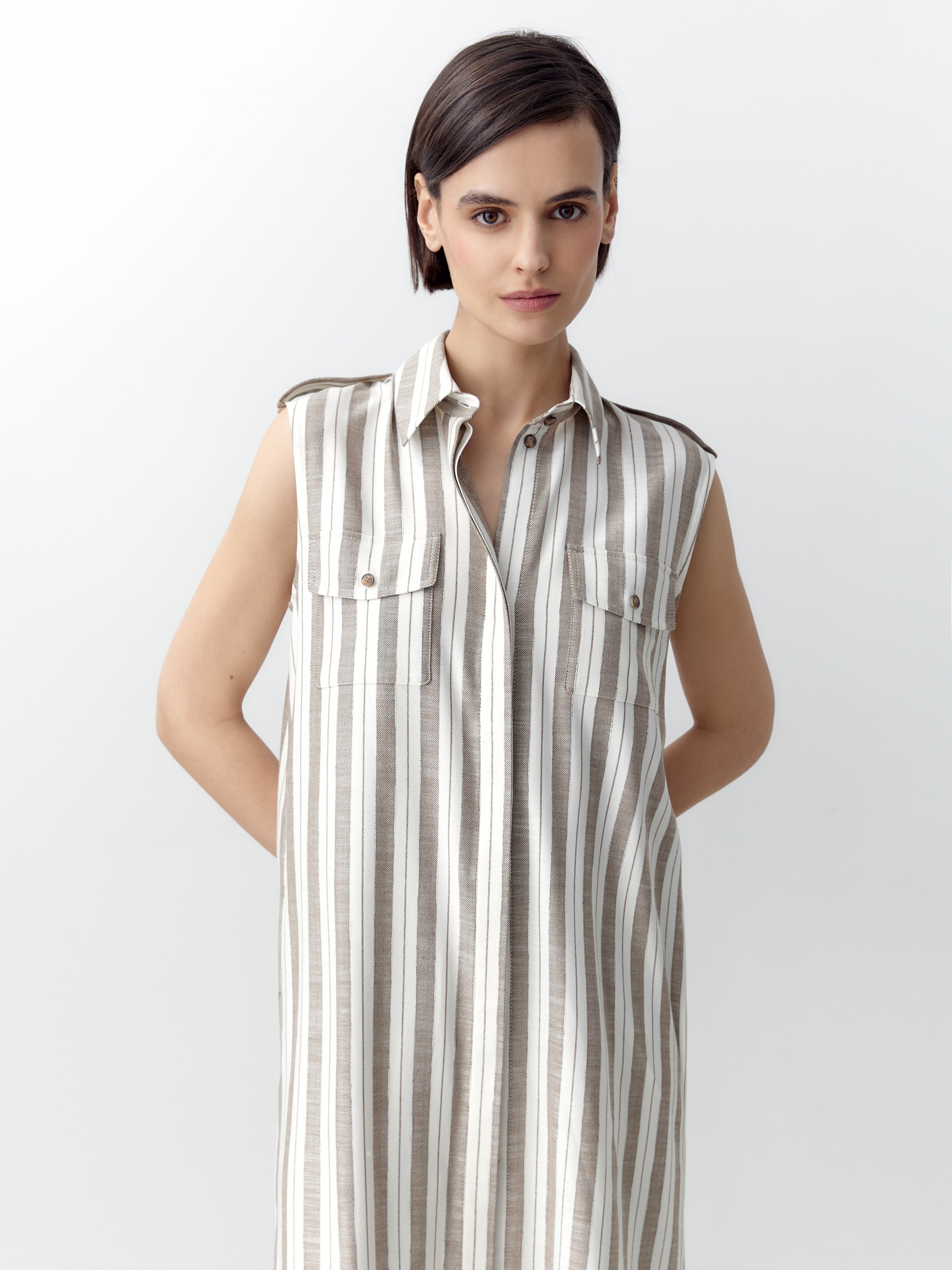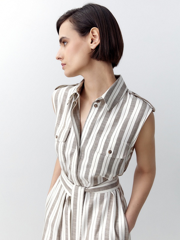 Прямое платье в стиле сафари со спущенной линией плеча и хлястиками с пуговицей по ним. Классический отложной воротник и потайная планка с пуговицами. В боковых швах есть потайные карманы и высокие разрезы. На спинке кокетка и складка, на полочке накладные карманы с клапанами. В комплект входит пояс из основной ткани.