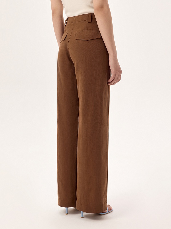Широкие прямые брюки на средней посадке с рельефами по переду, на спинке накладные клапана. Пояс подкройной со шлевками.
