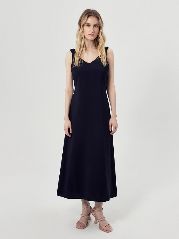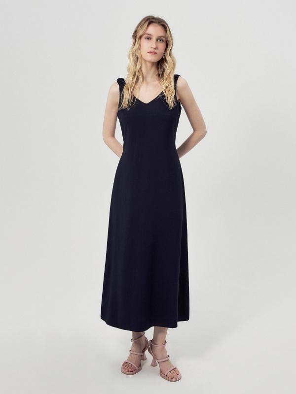 Платье в стиле smart casual выгодно подчёркивает фигуру и открывает простор для стильных сочетаний с аксессуарами. Классический V-образный вырез визуально удлиняет шею, а приталенный верх и расклешённая юбка создают женственный силуэт. Лямки изделия дополнены резинкой, благодаря чему создаётся деликатная сборка — элегантный акцент в лаконичном силуэте.