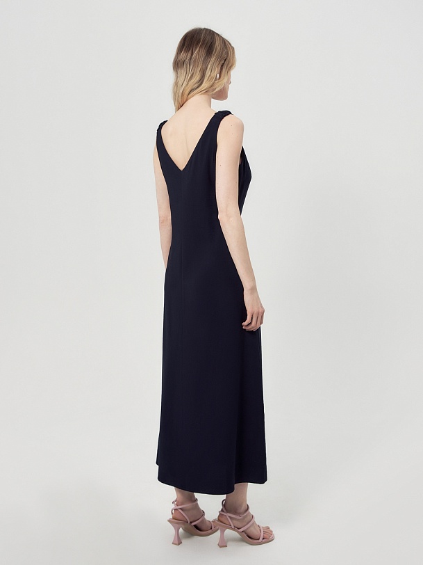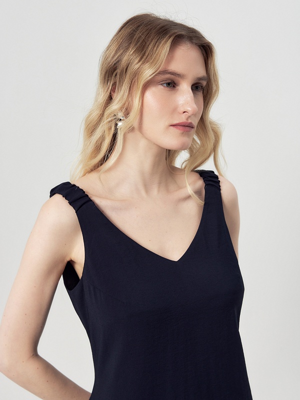 Модель выполнена из лёгкой вискозной ткани глубокого тёмно-синего оттенка. Изделие отшито без подклада. Отсутствие лишних слоёв подчеркивает летний характер модели и делает её комфортной для теплых дней.