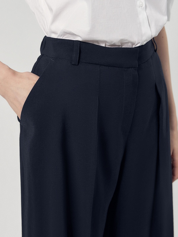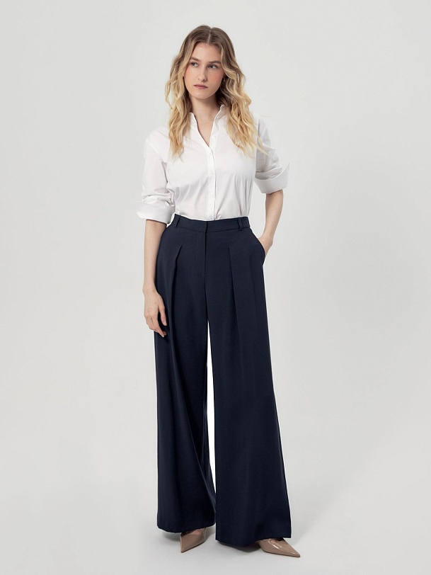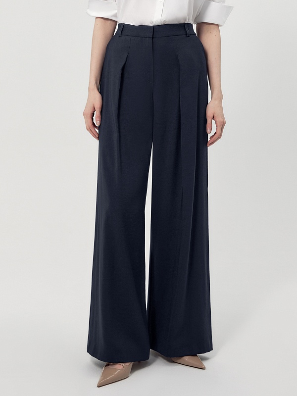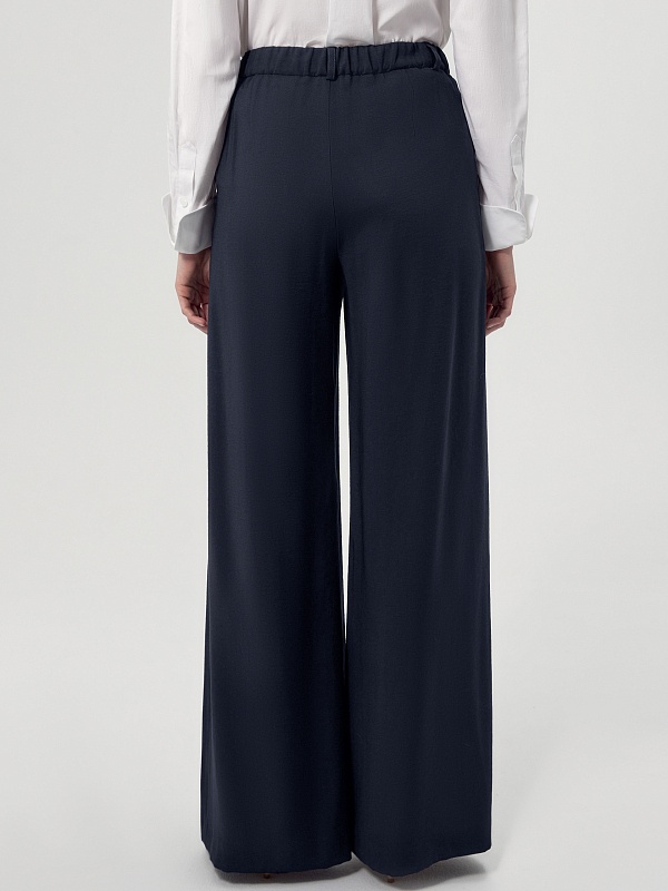 Прямые широкие брюки со складками на высокой посадке с притачным поясом. Брюки выполнены из плательной вискозной ткани темно-синего цвета. Имеют два функциональных кармана по бокам. На спинке есть резинка.