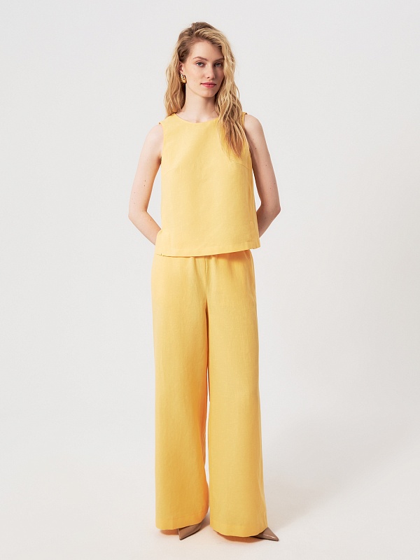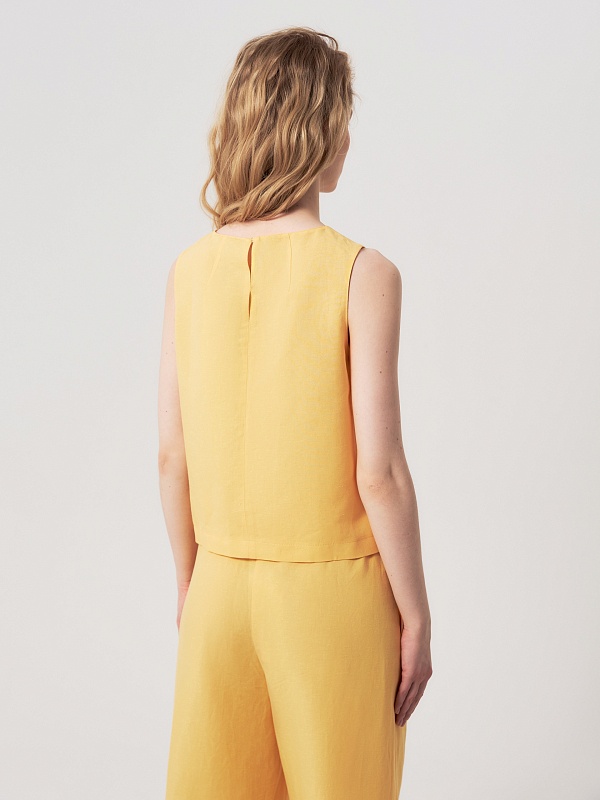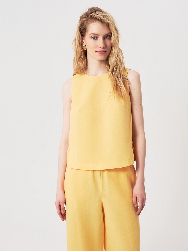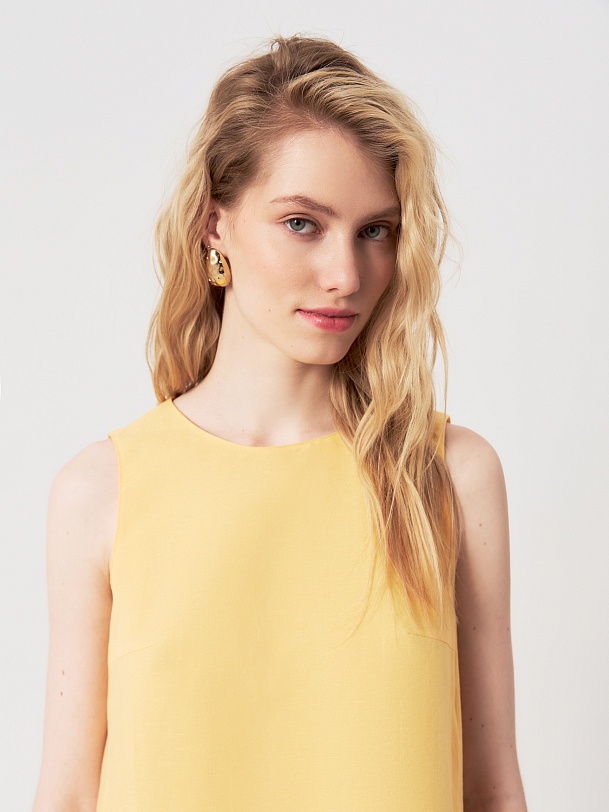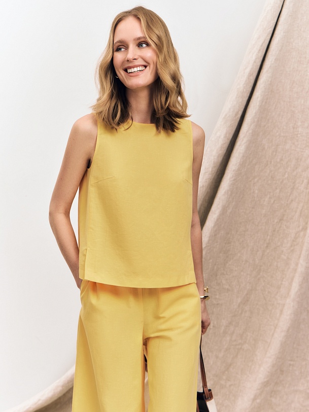 Стильная прямая блуза в солнечно-жёлтом оттенке — свежий и выразительный элемент летнего гардероба. Натуральный состав с высоким содержанием хлопка и добавлением льна позволяет коже дышать и обеспечивает комфорт в течение дня. Минималистичный крой дополнен аккуратными разрезами по линии рельефов и застежкой-капелькой на спинке.