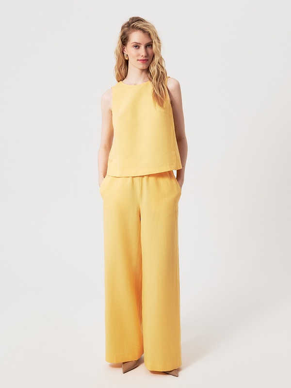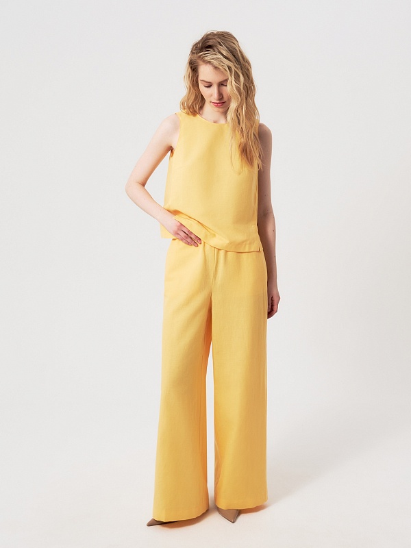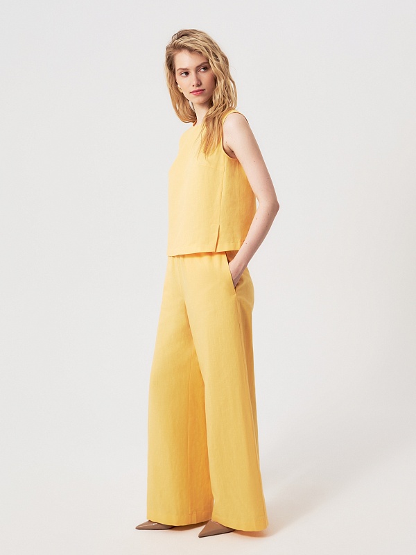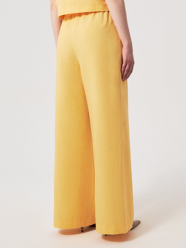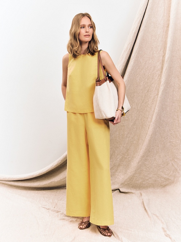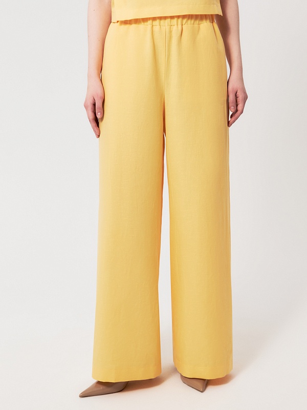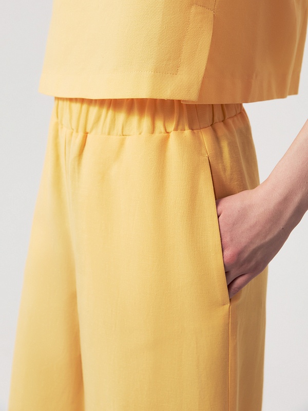 Брюки в солнечно-желтом оттенке — свежий и выразительный элемент летнего гардероба. Натуральный состав с высоким содержанием хлопка и добавлением льна позволяет коже дышать и обеспечивает комфорт в жаркую погоду.