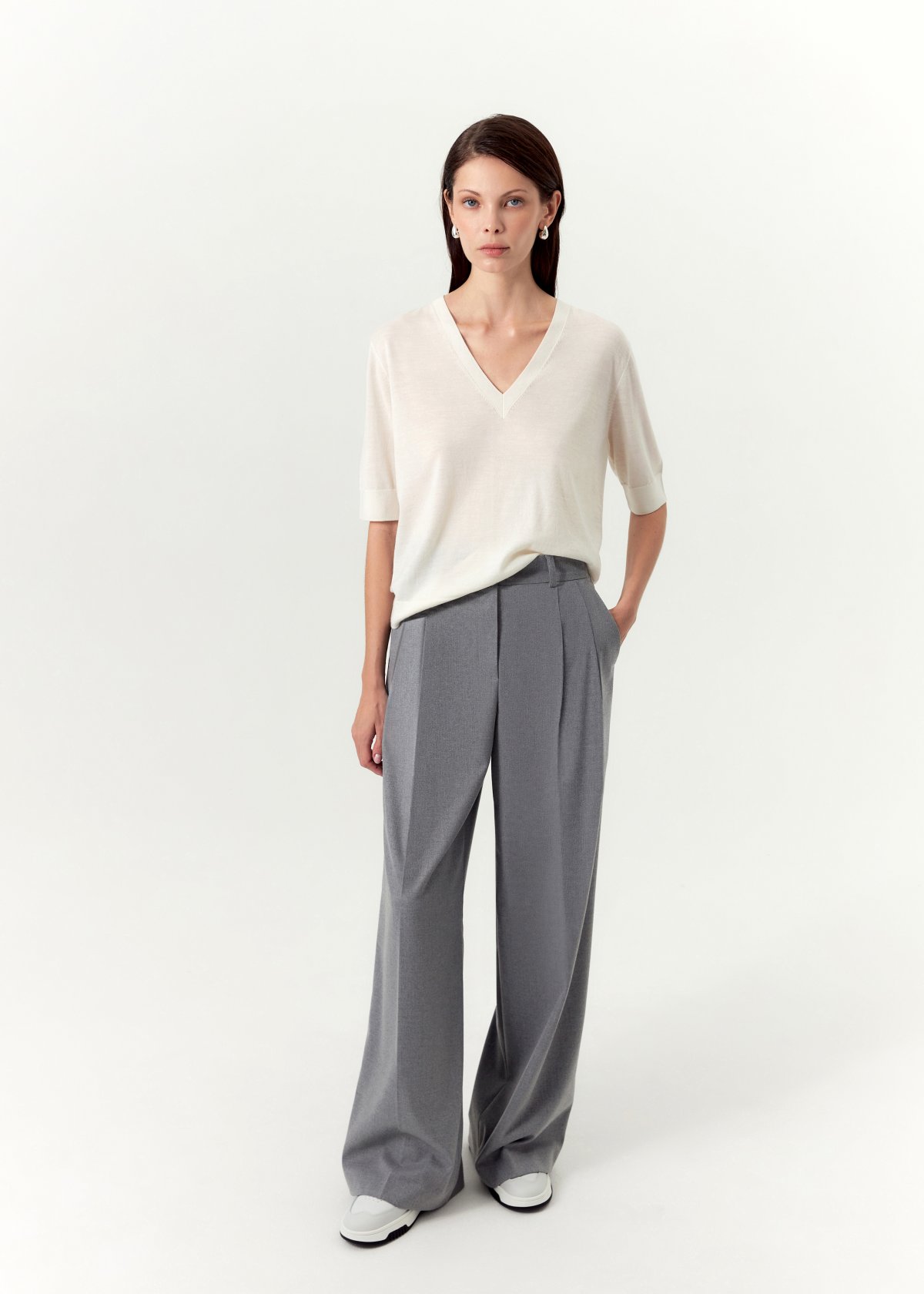 Свободный крой и мягкие складки формируют лёгкий, струящийся силуэт, подчёркивающий пластичность движений. Боковые карманы добавляют практичности, а шлевки на поясе позволяют дополнить образ ремнём. Универсальный серый цвет легко вписывается в любой гардероб и гармонично сочетается с разными образами.