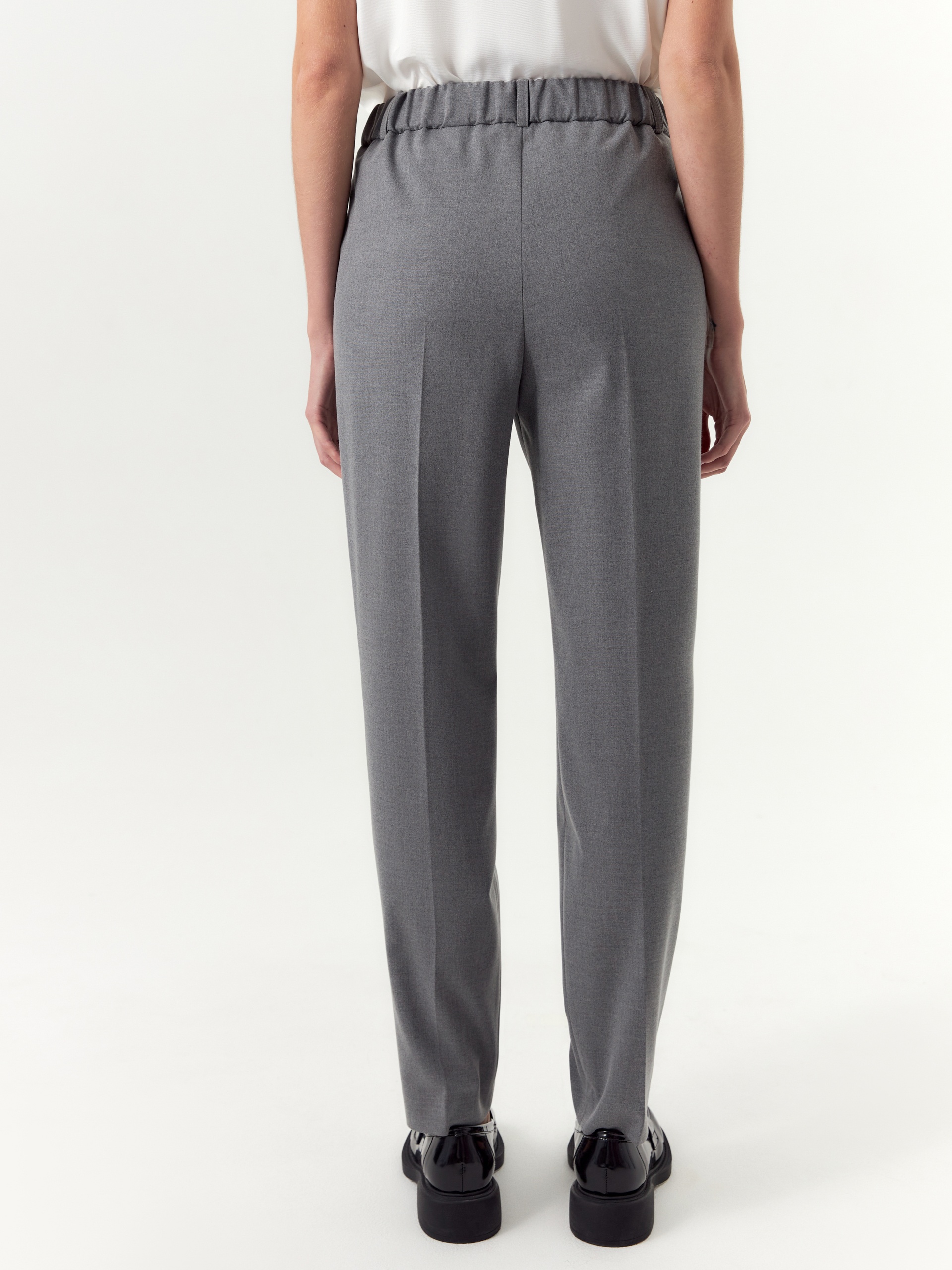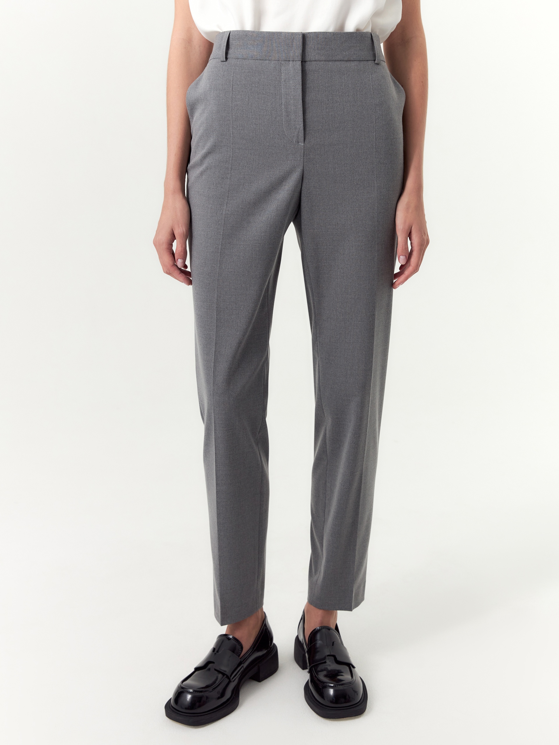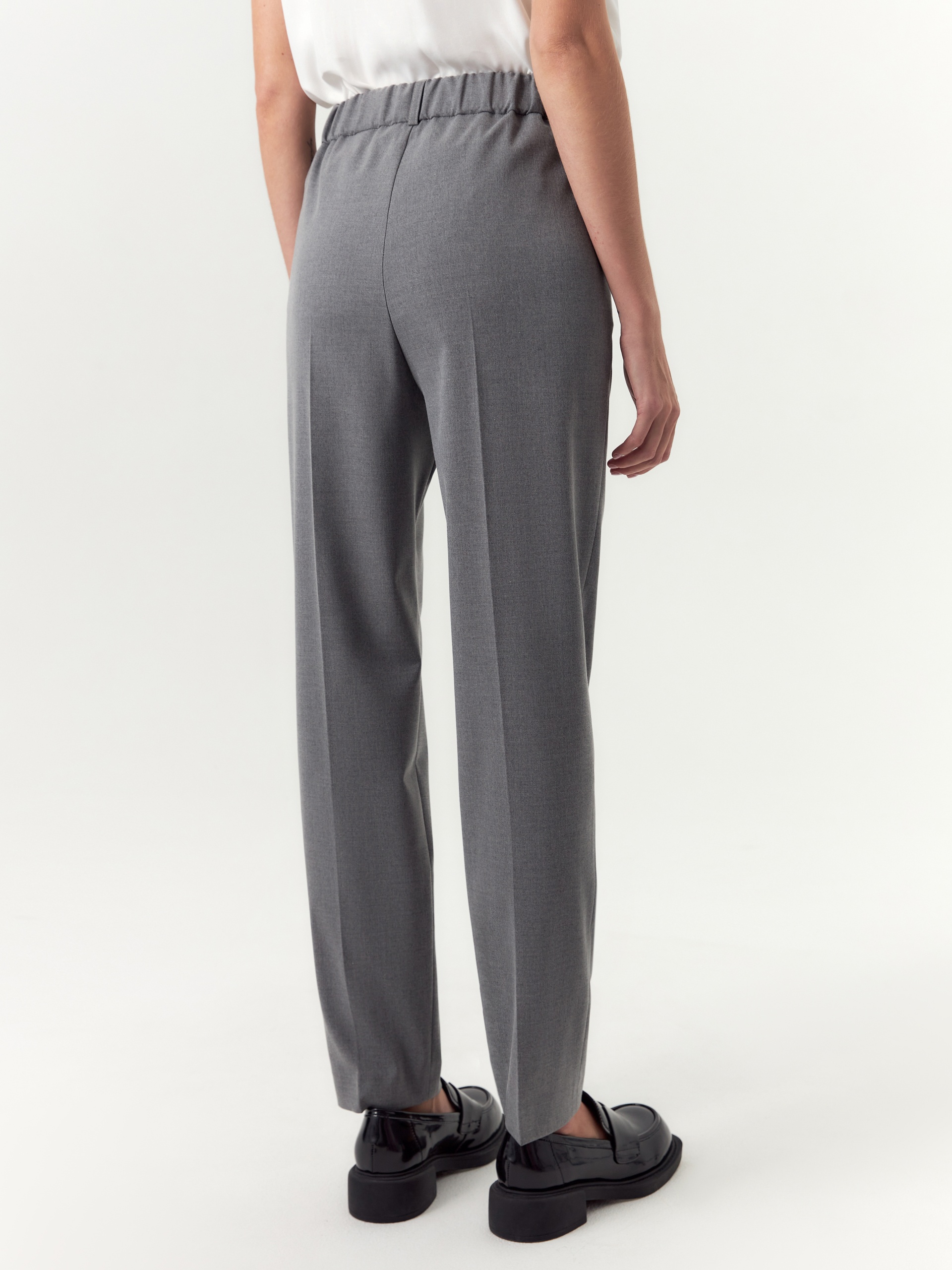 Слегка зауженный книзу силуэт, в сочетании со стрелками, визуально удлиняет ноги и добавляет образу деловую чёткость. Эластичная вставка на задней части пояса позволяет изделию адаптироваться к индивидуальным параметрам фигуры, обеспечивая надёжную и комфортную посадку. Боковые карманы добавляют практичности, а шлевки на поясе позволяют дополнить образ ремнём. Универсальный серый цвет легко вписывается в любой гардероб и гармонично сочетается с разными образами.