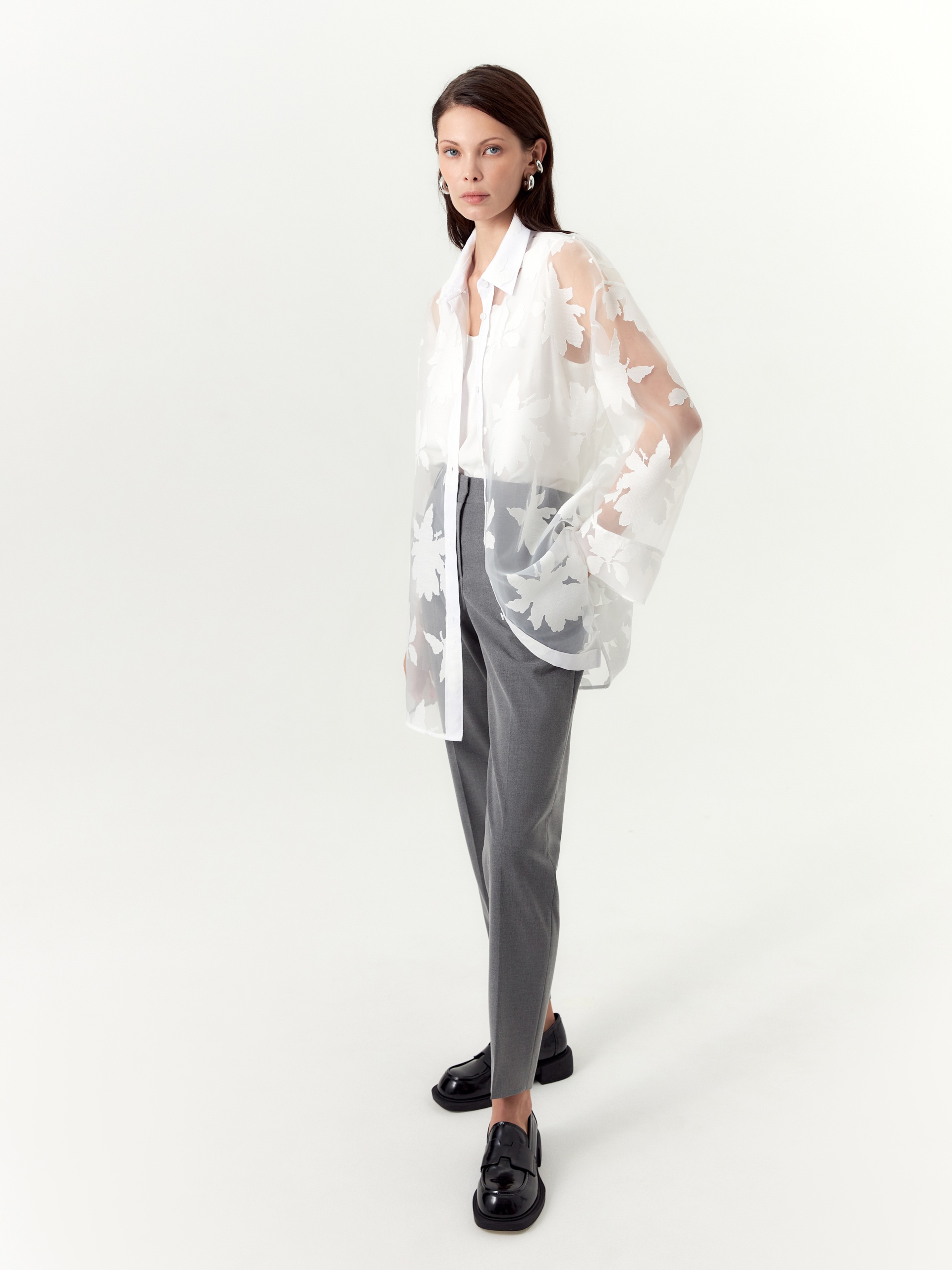 Классические брюки со стрелками выполнены из французской костюмной ткани с добавлением вискозы. Материал обладает плотной, но мягкой структурой и лёгким матовым блеском, что придаёт изделию аккуратный, благородный вид.