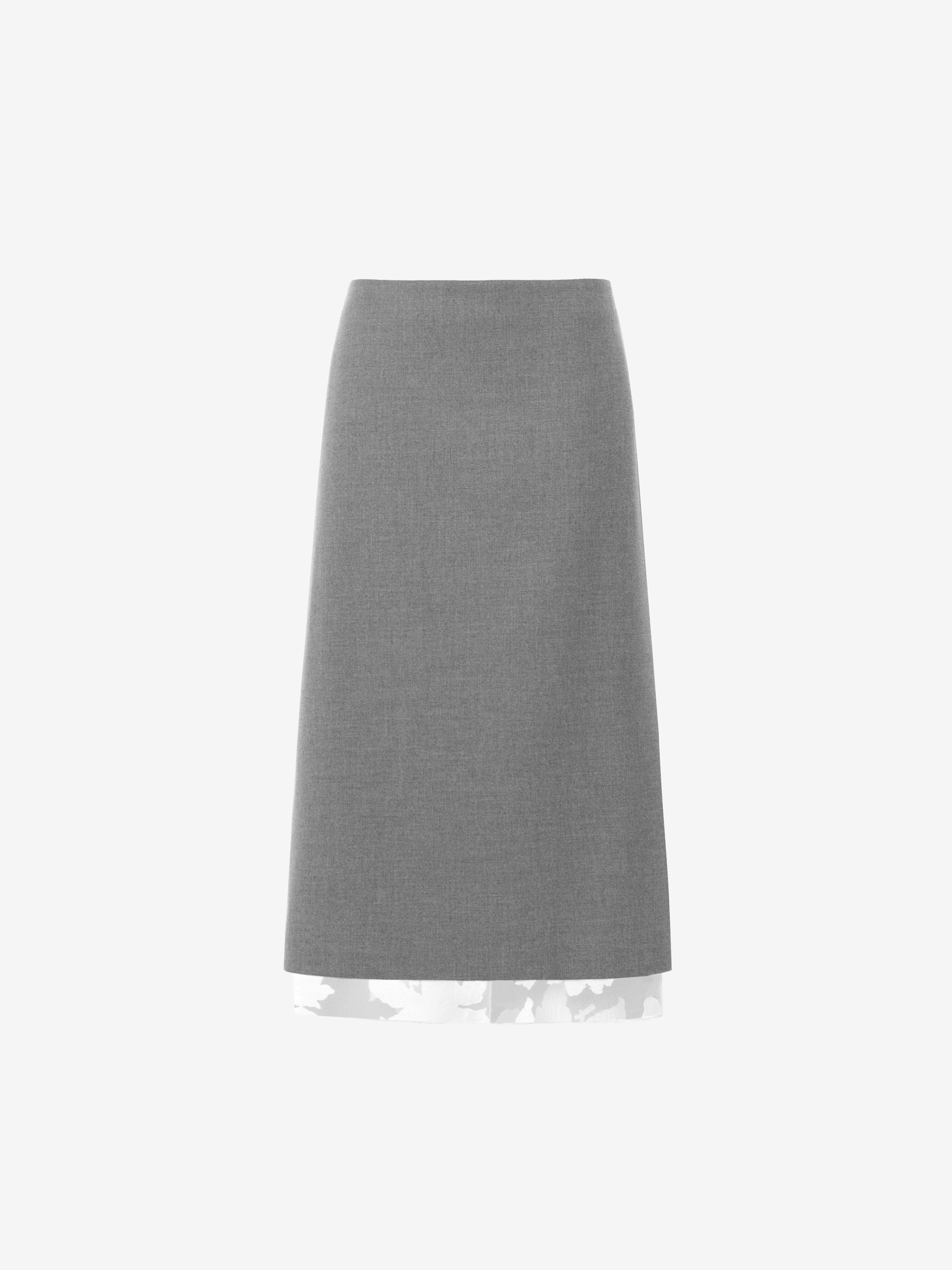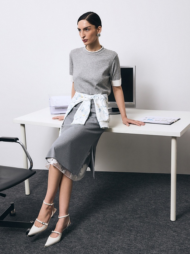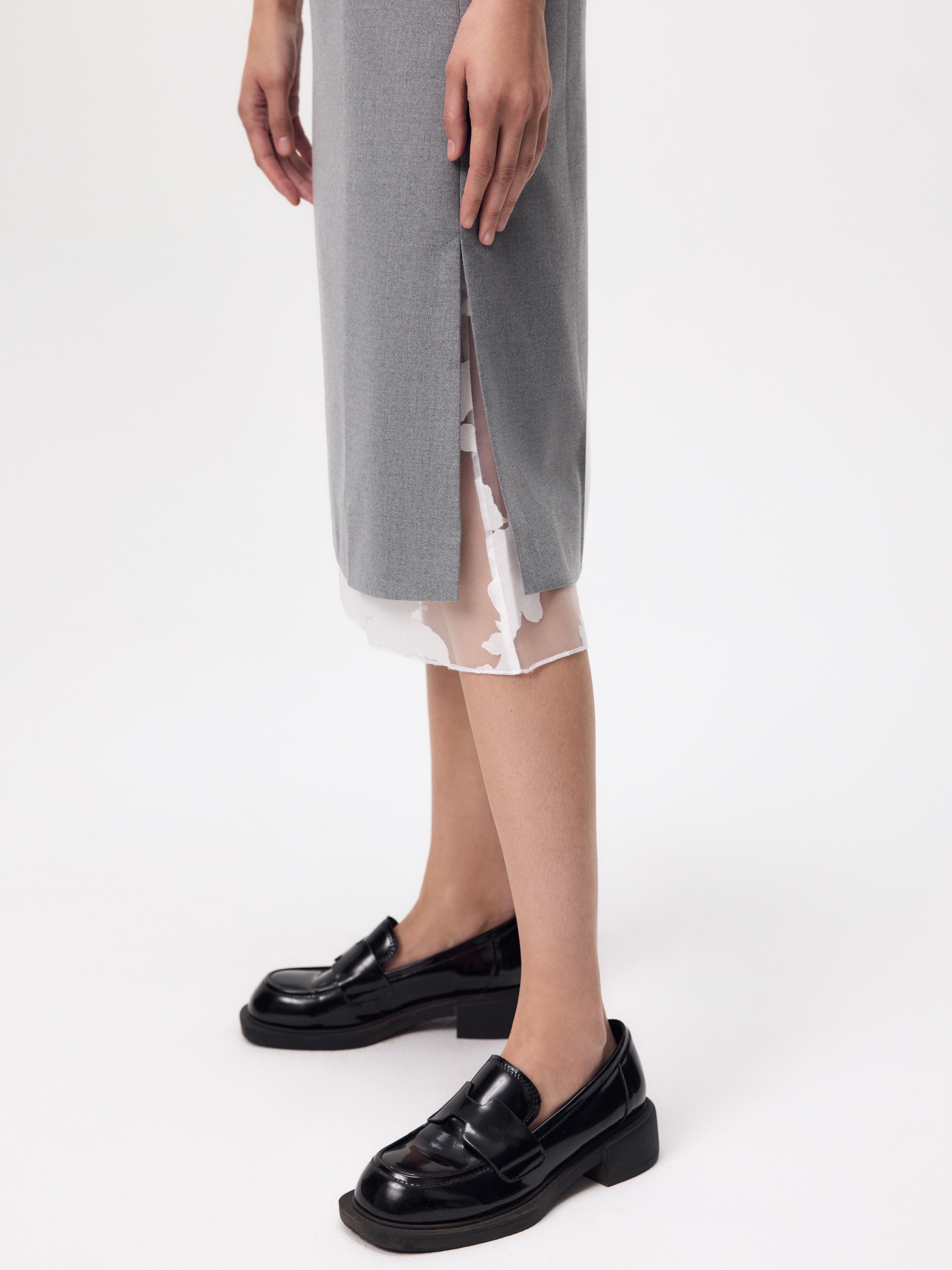 Талиевые вытачки формируют безупречную посадку, а высокие разрезы по бокам добавляют динамичности и свободы движения. Потайная молния сохраняет лаконичность образа. Особую выразительность модели придаёт разница длин основного слоя и подкладки: укороченный верхний слой открывает нижний ярус из белой органзы с набивным цветочным рисунком, создавая изящный акцент и воплощая актуальные тренды сезона — игру с многослойностью и прозрачностью.