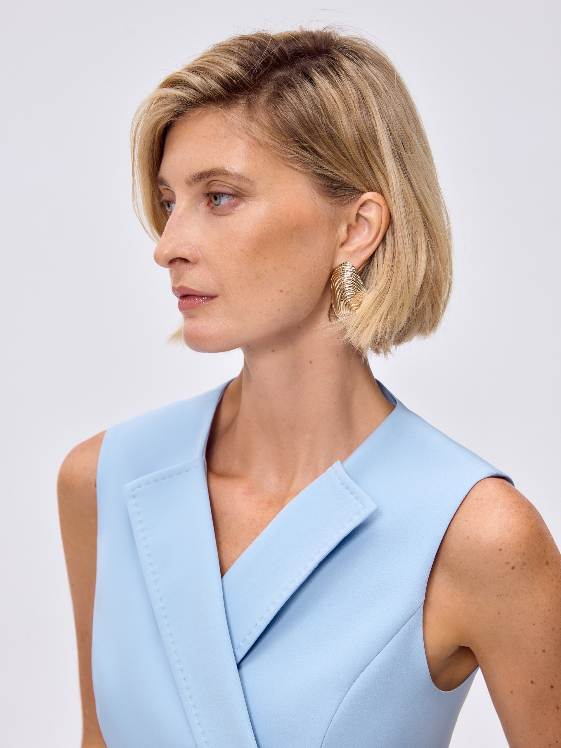Укороченный жилет в стиле smart casual выполнен из костюмной ткани в благородном голубом оттенке. Приталенный крой с акцентом на талии подчёркивает фигуру, V-образный вырез визуально вытягивает линию шеи. Лацканы жилета дополнены декоративным элементом в виде аккуратной тамбурной строчки. Завязки на спине добавляют лёгкий контраст между структурой и непринуждённостью.