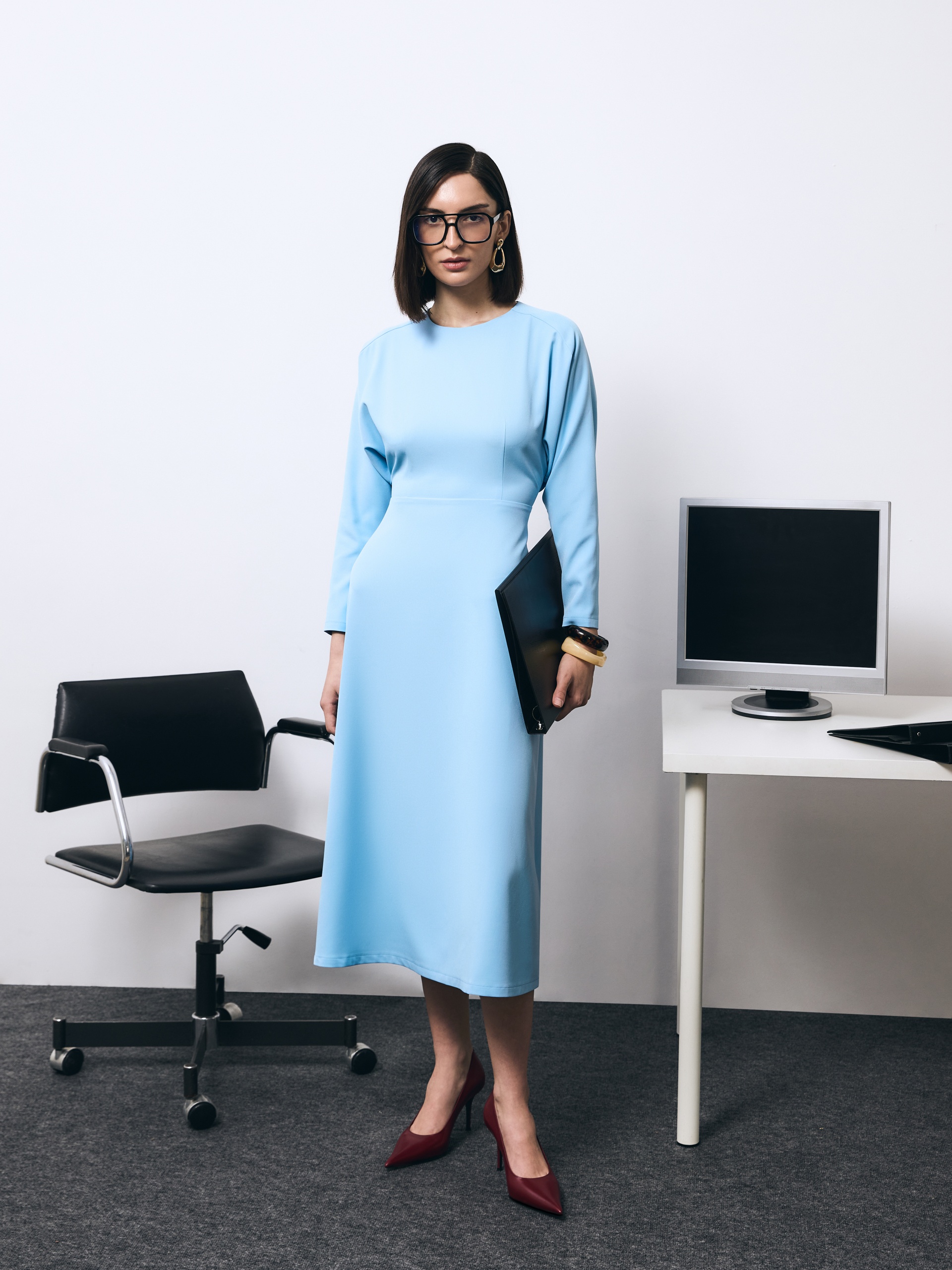Приталенное платье из костюмной ткани с добавлением вискозы выполнено в благородном голубом оттенке. Лаконичный силуэт подчёркивает талию за счёт отрезной линии, создавая утончённую, сбалансированную форму.