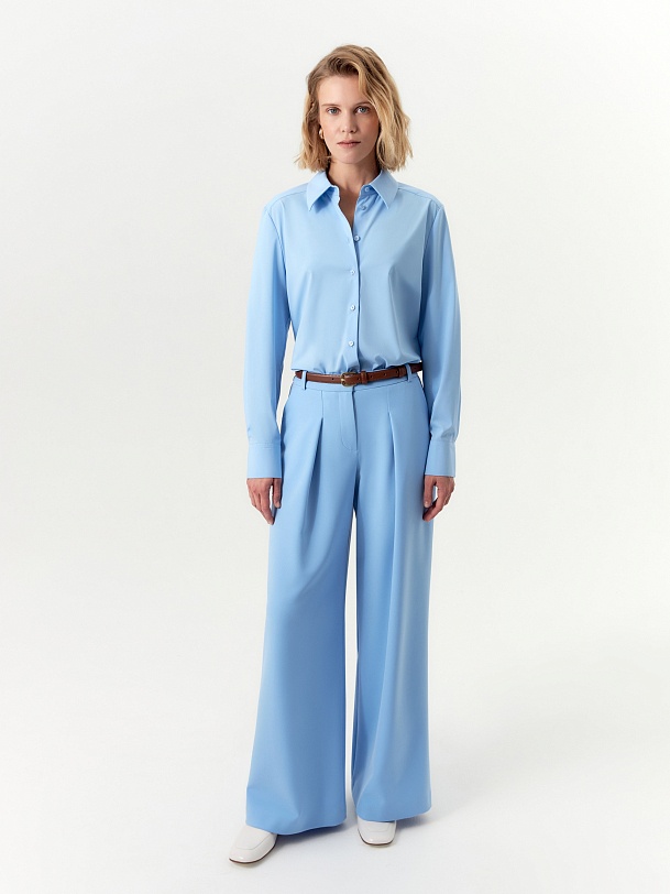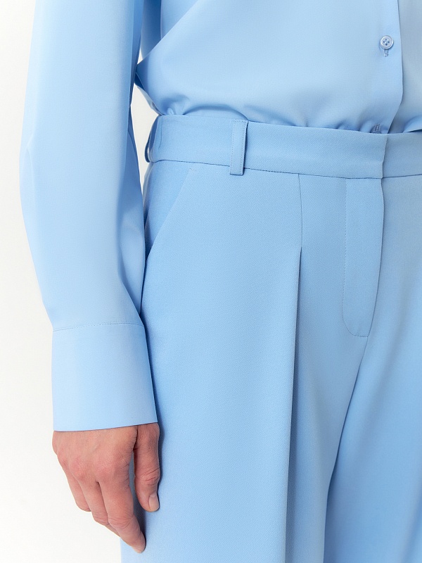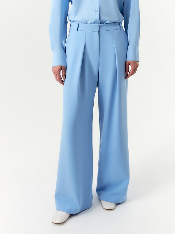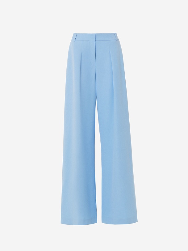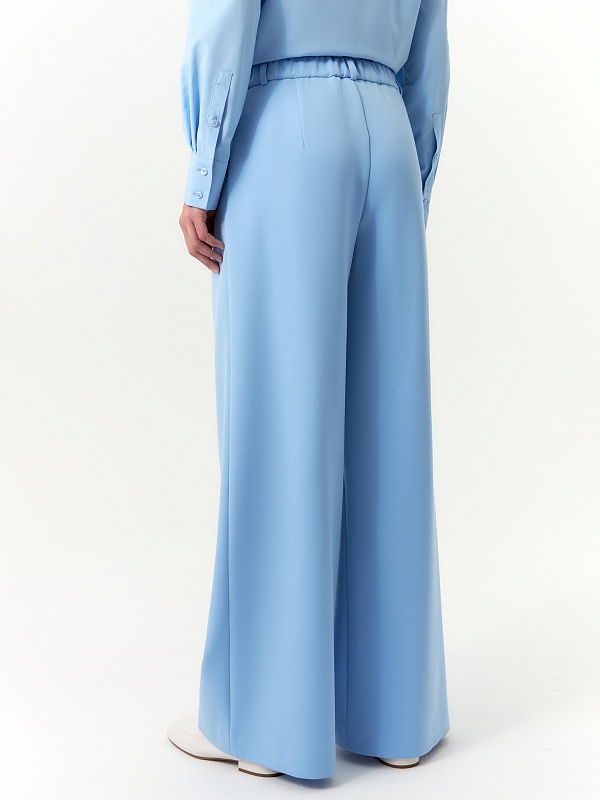 Брюки палаццо из костюмной ткани с добавлением вискозы выполнены в освежающем голубом оттенке.