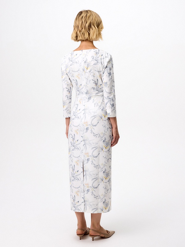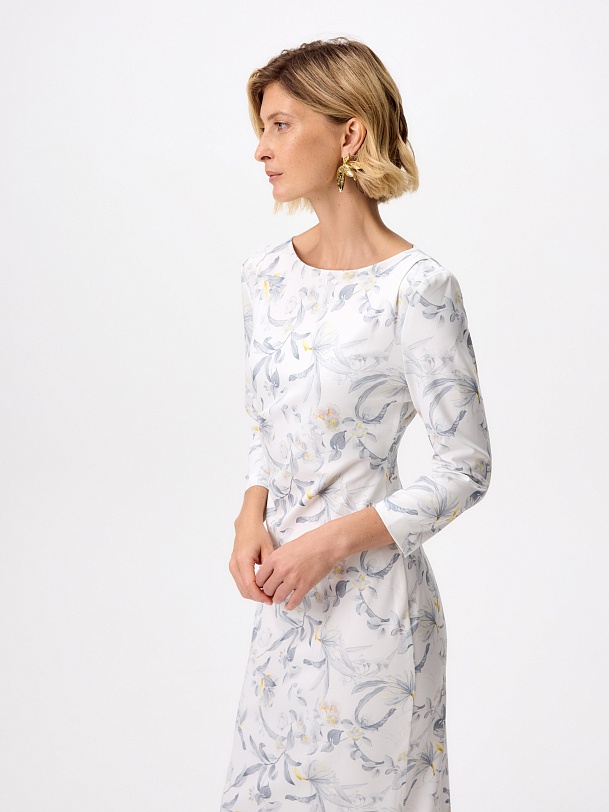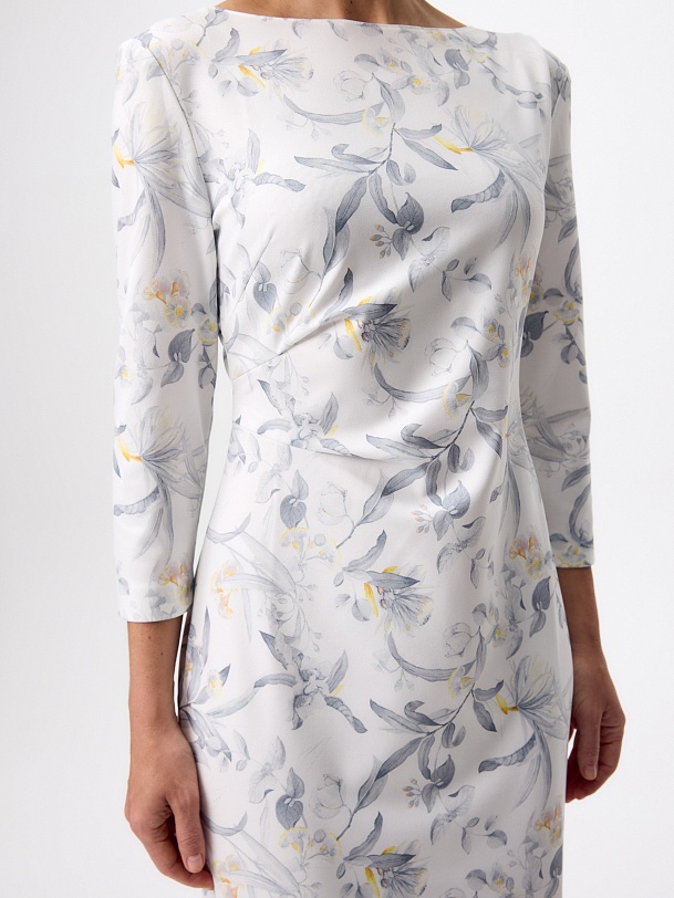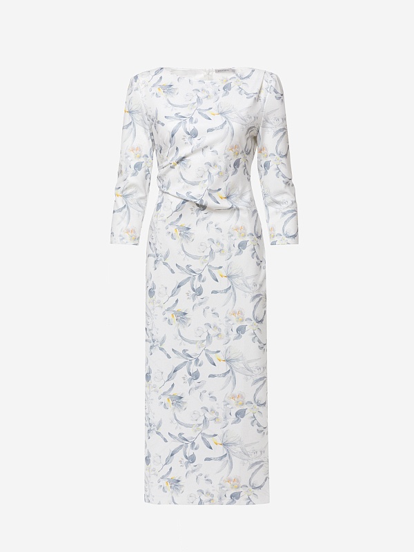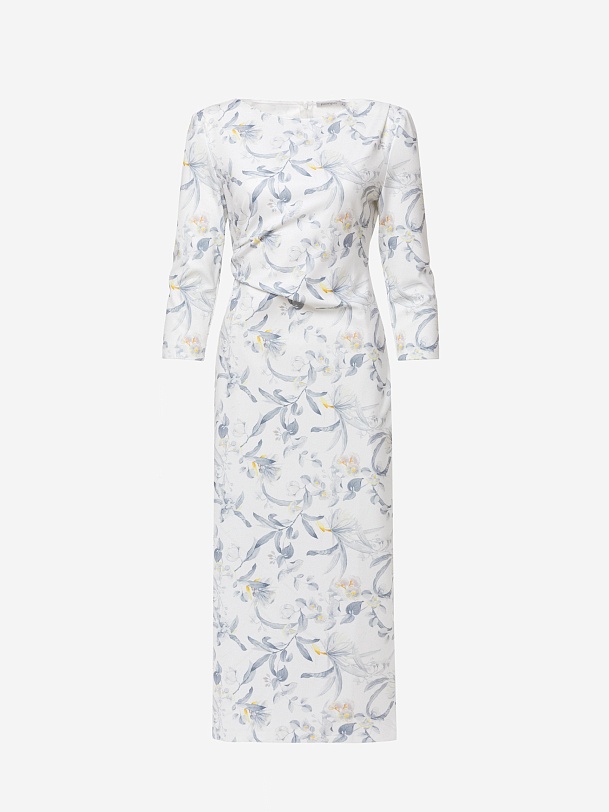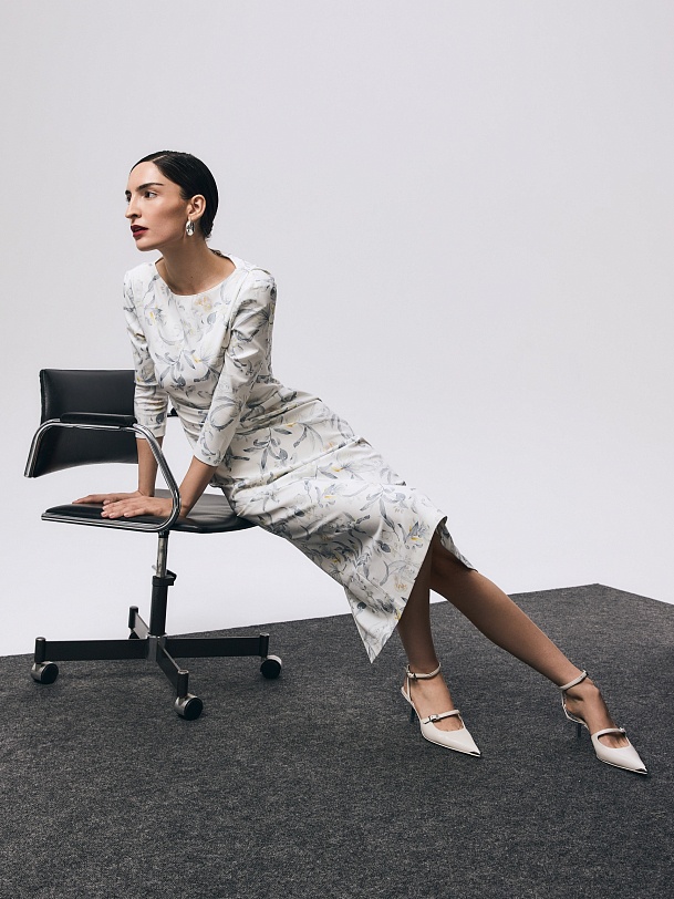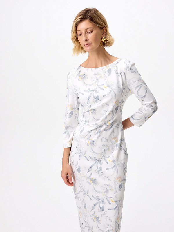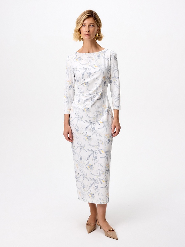 Платье миди из мягкого трикотажного полотна с изящным принтом — гармоничное сочетание комфорта и утончённого стиля. Прилегающий силуэт подчёркивает фигуру, а мягкие складки на талии и плече формируют эффектные акценты. Лаконичная горловина-лодочка изящно обрамляет линию шеи, придавая образу элегантную сдержанность. Потайная молния на спинке сохраняет лаконичность образа.