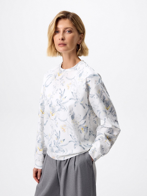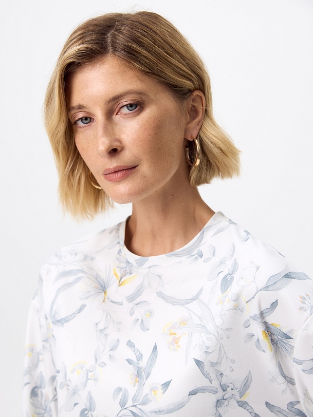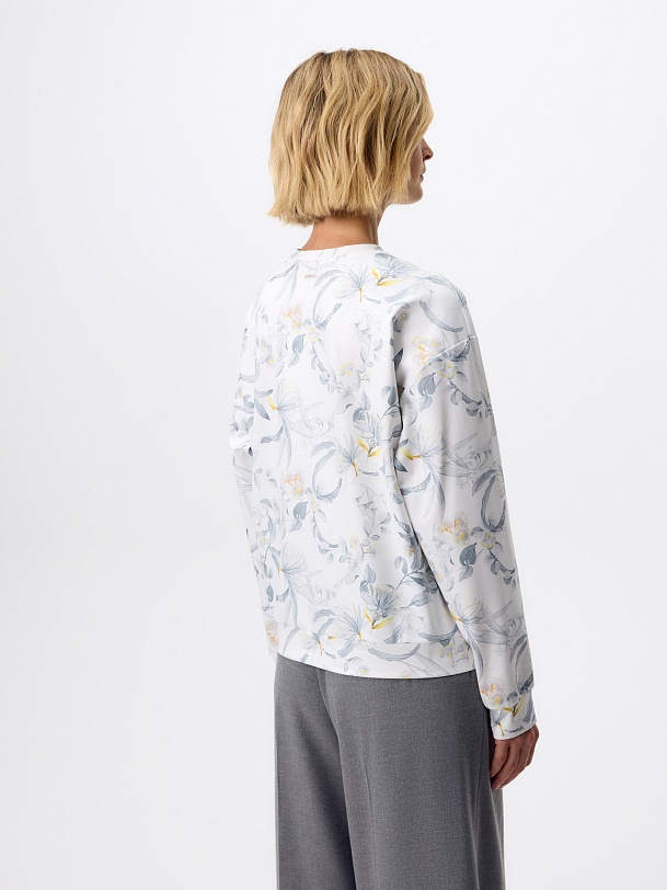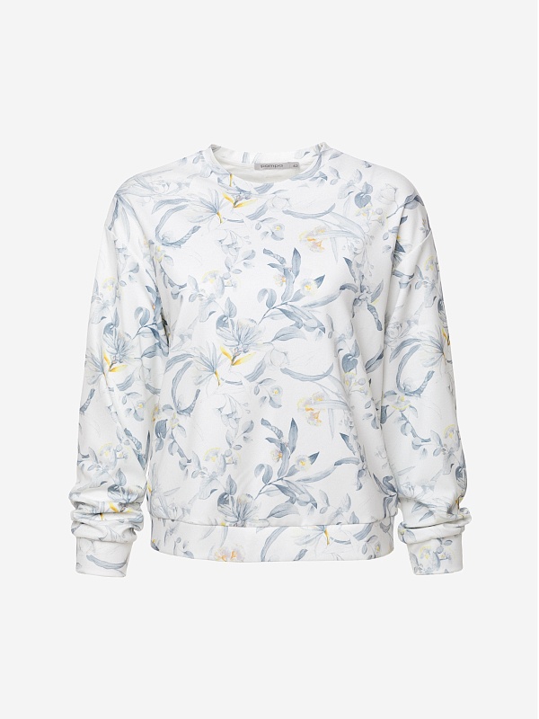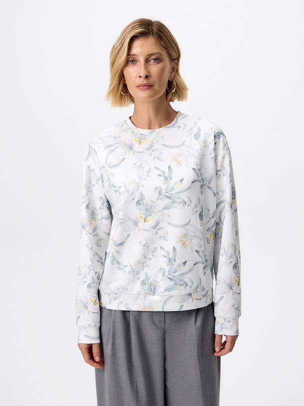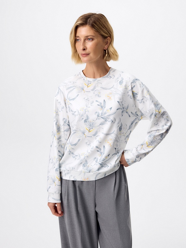 Свитшот из мягкого трикотажного полотна с изящным ботаническим принтом — комфортная и элегантная база для повседневного гардероба. Нежный акварельный рисунок в серо-голубых и светло-жёлтых оттенках придаёт модели лёгкость и свежесть, подчёркивая ее женственный характер.