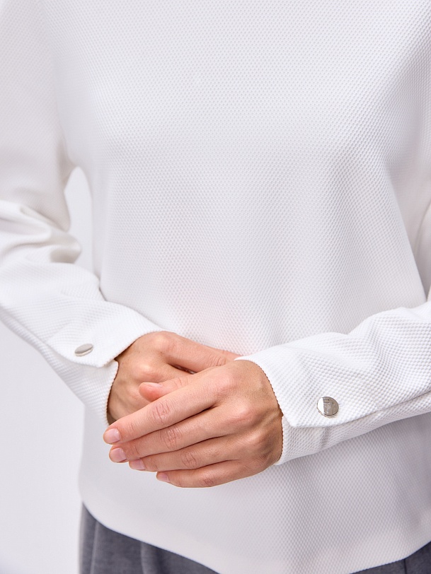 Джемпер из фактурного трикотажа — воплощение комфорта и стиля. Классическая форма втачного рукава со спущенной линией проймы полной длины с серебряными пуговицами и шлицей по низу придают дизайну современный, непринужденный вид.