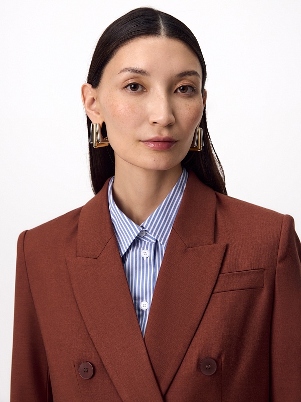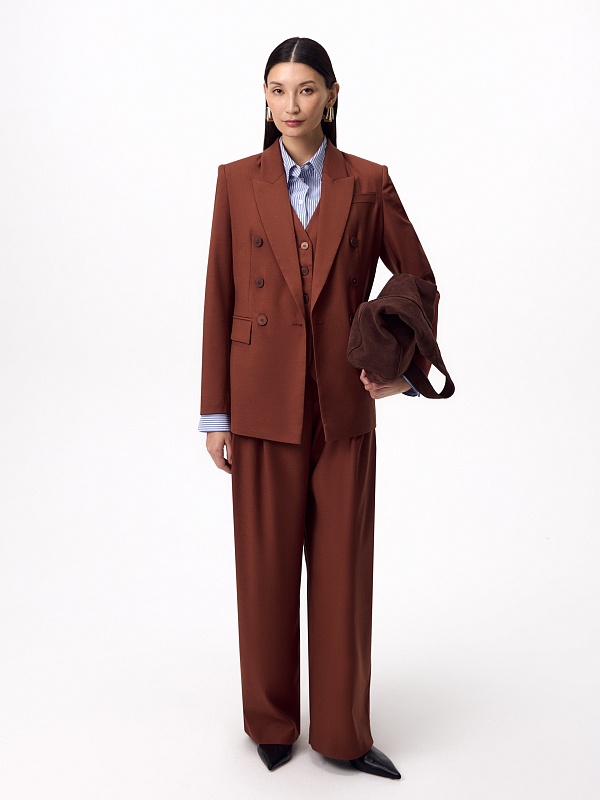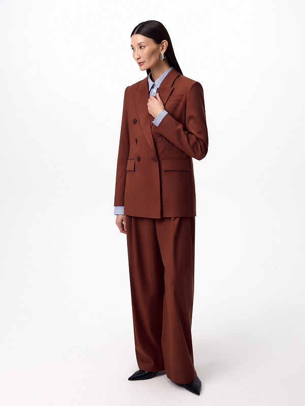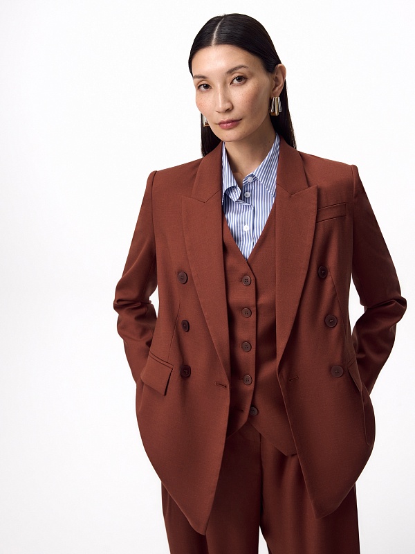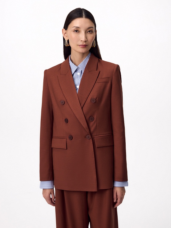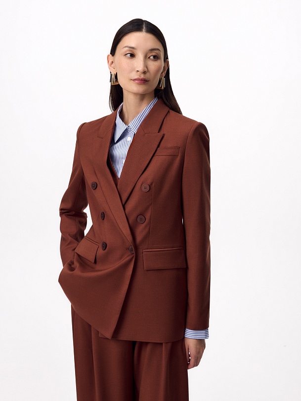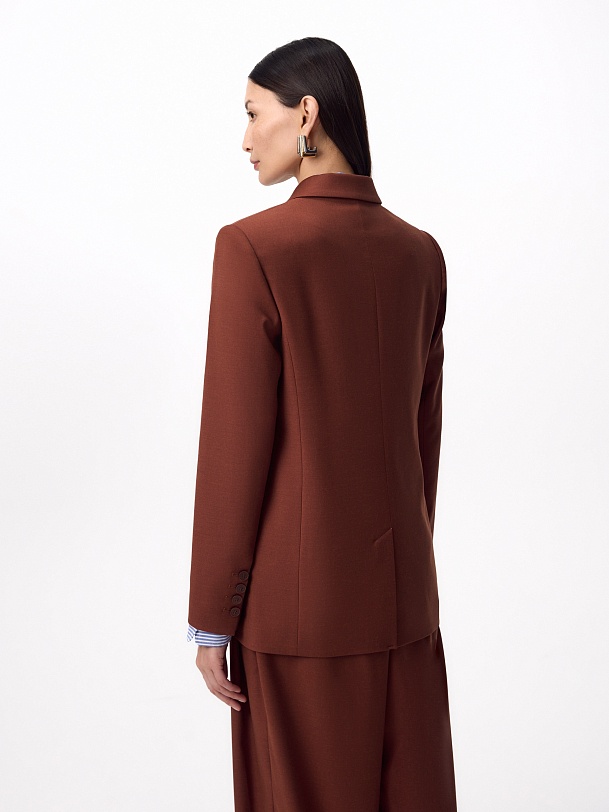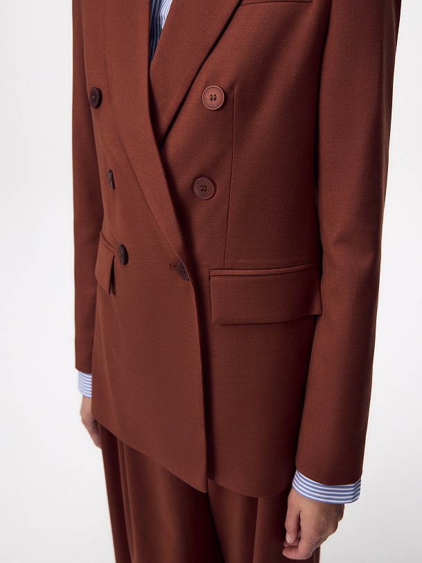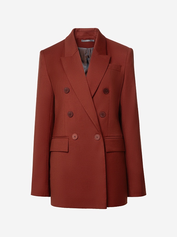 Прямой классический двубортный жакет на 6 пуговиц из костюмной ткани в благородном цвете красного дерева, классический английский воротник, листочка на груди, карманы прорезные с клапанами. Рукав классический с пуговицами. Жакет на подкладке. Составит идеальный осенний комплект с брюками из одной ткани.