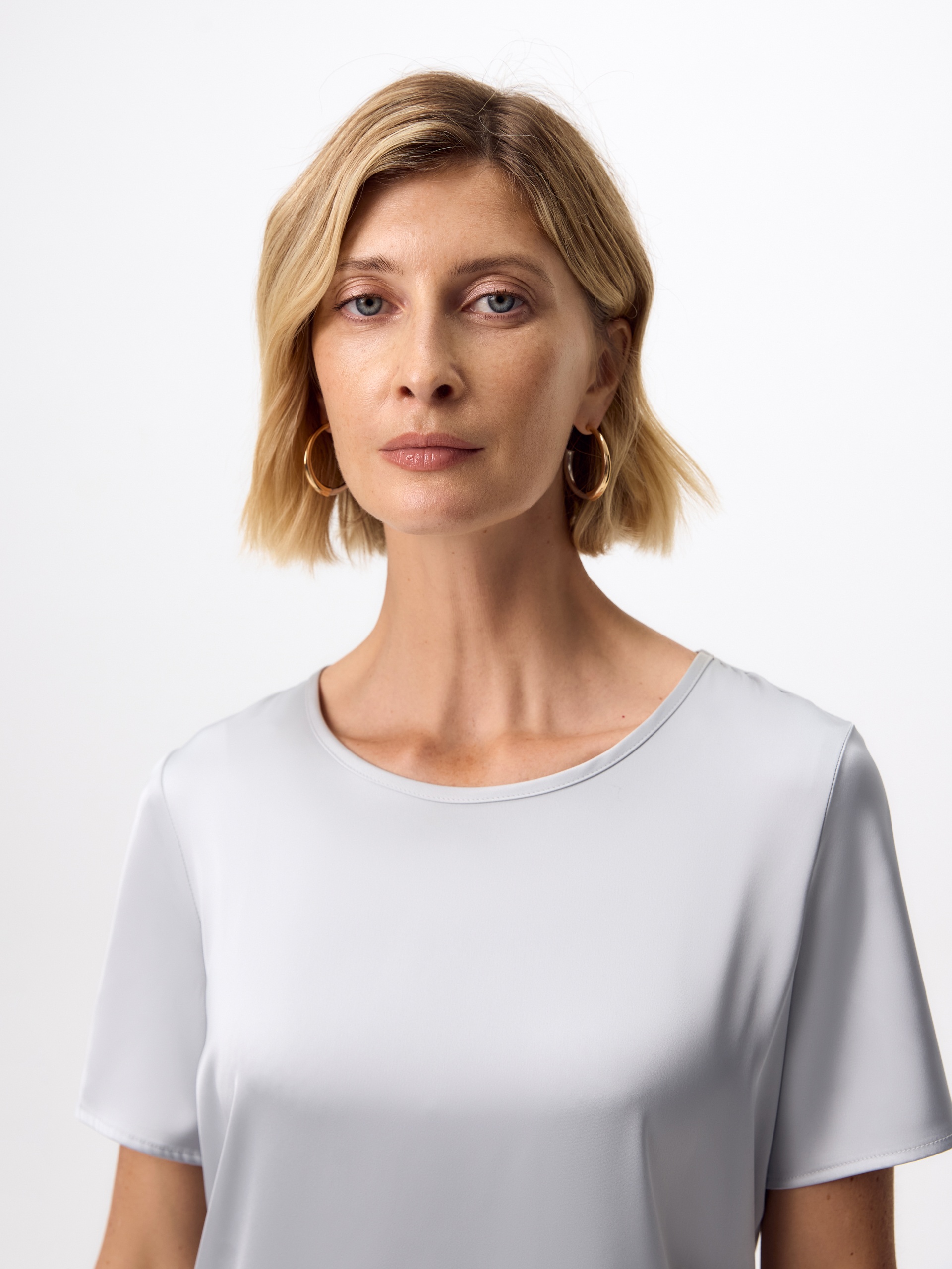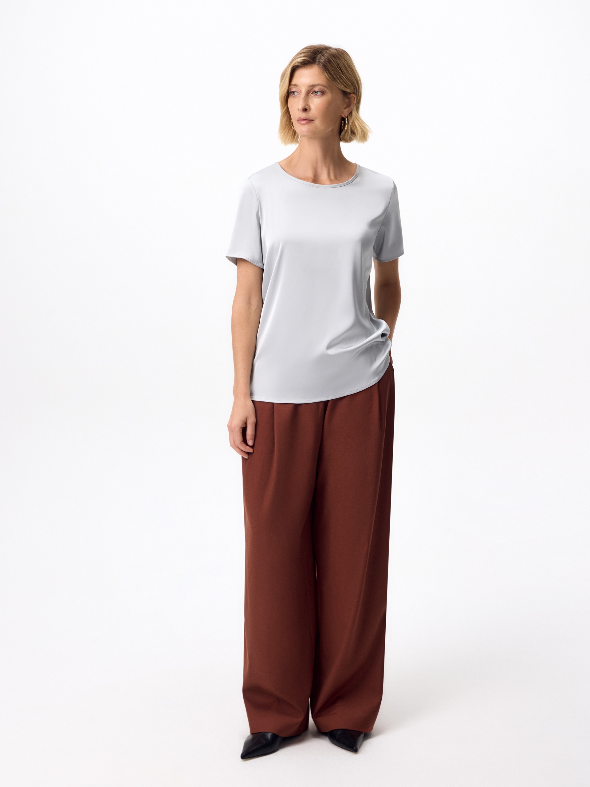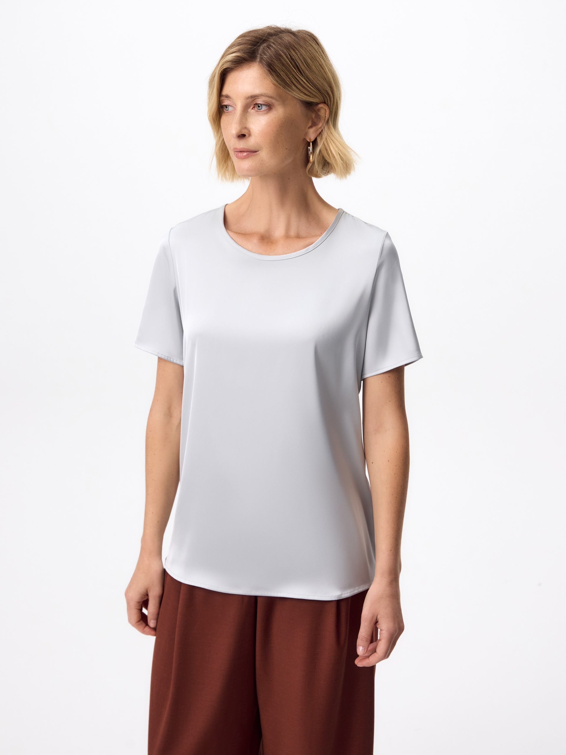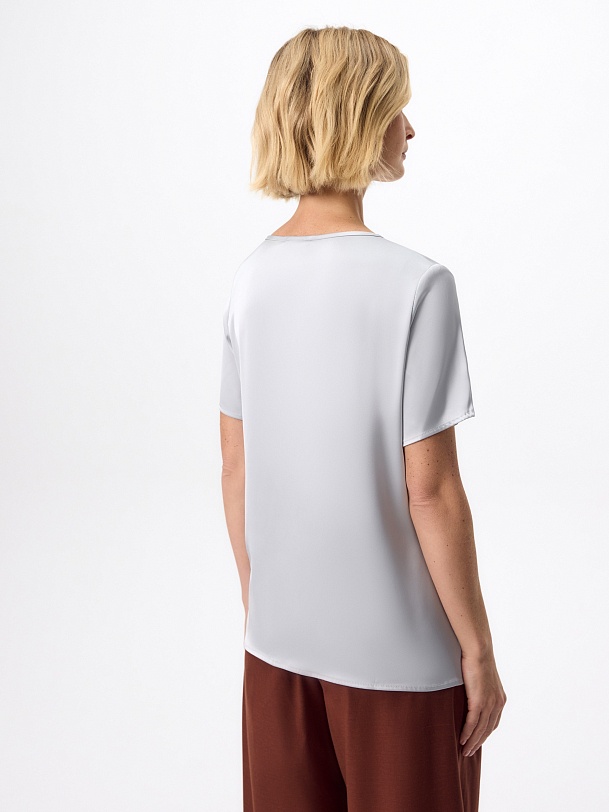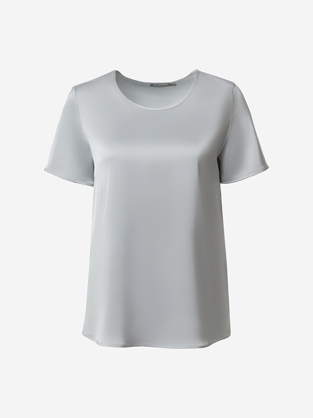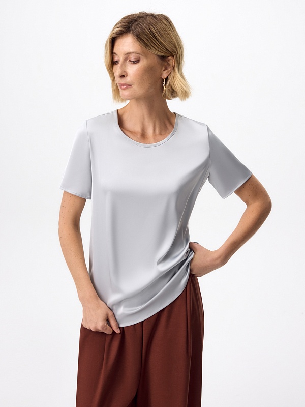 Прямая блуза из атласной ткани серого цвета прямого силуэта с круглой горловиной и короткими втачными рукавами.