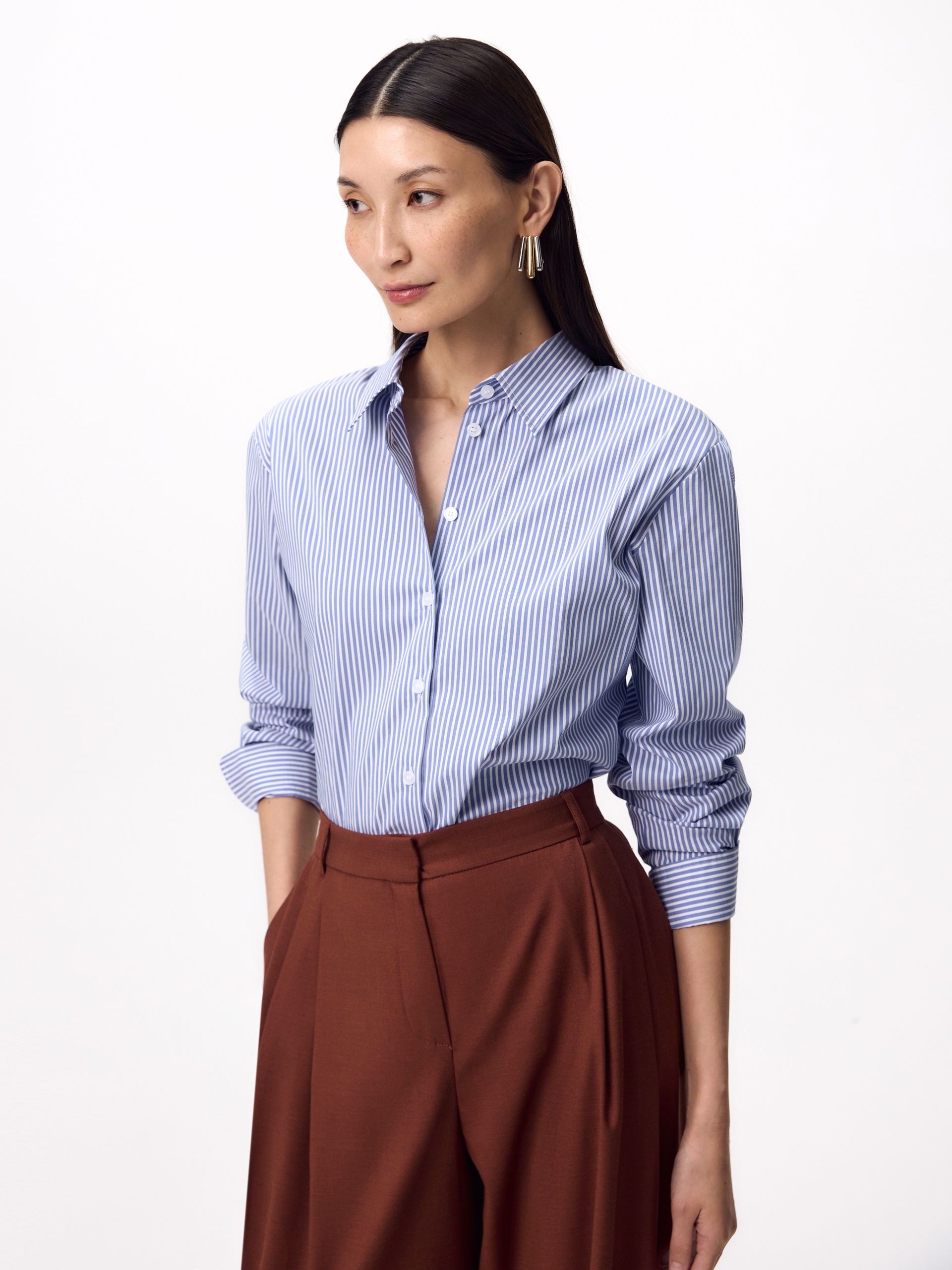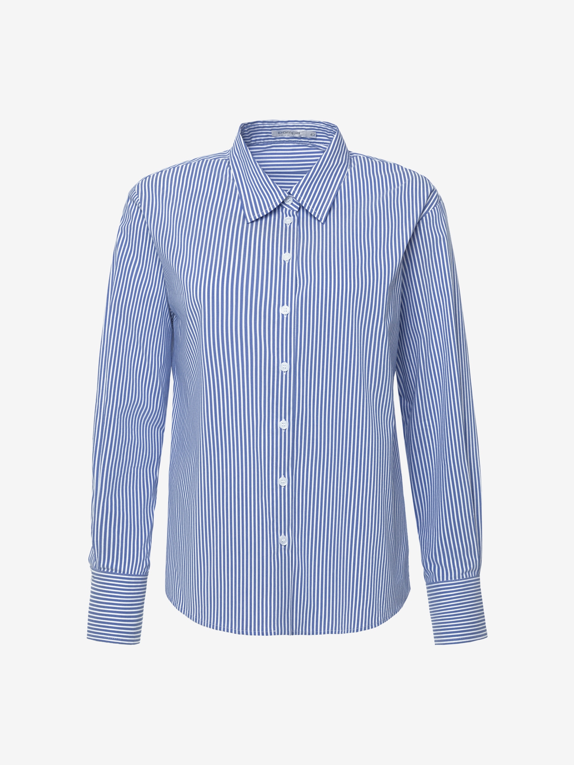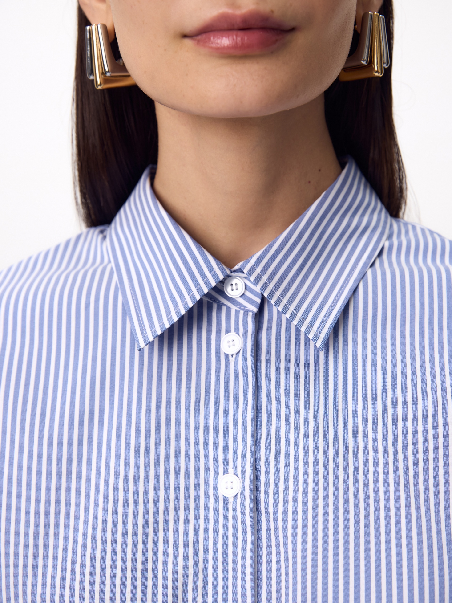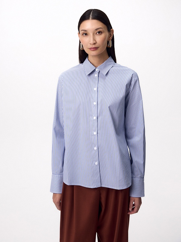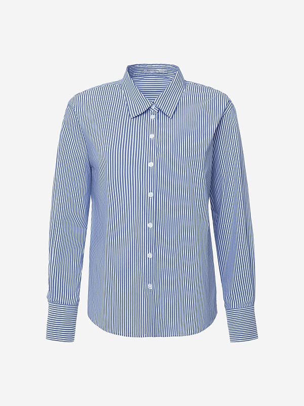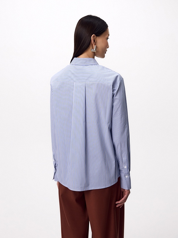 Прямая удлиненная блуза из хлопковой ткани в тонкую голубую полоску с классическим отложным воротником. Рубашечный широкий рукав на узком манжете с фигурным срезом манжета. Спинка удлиненная, с кокеткой и складкой.