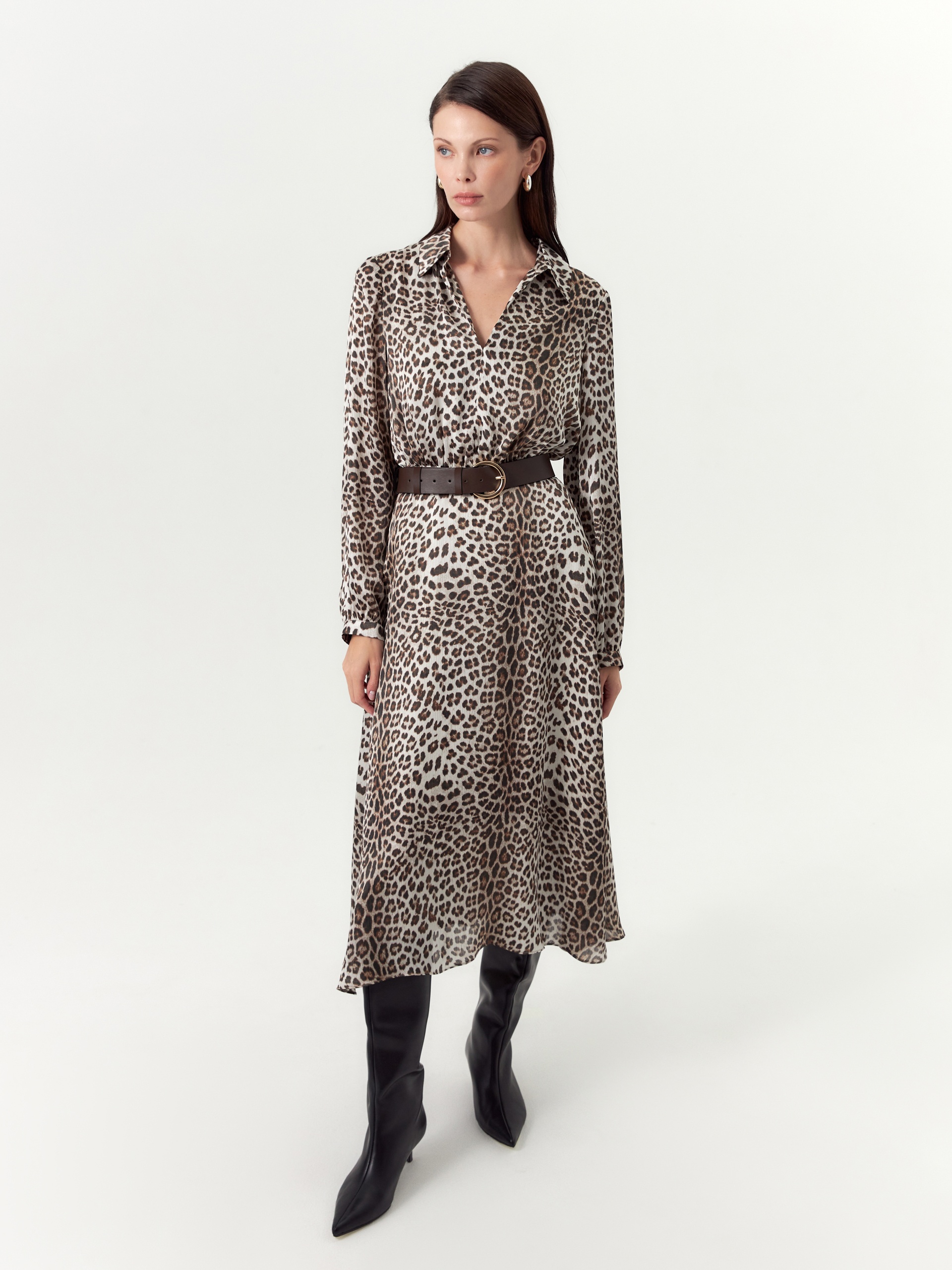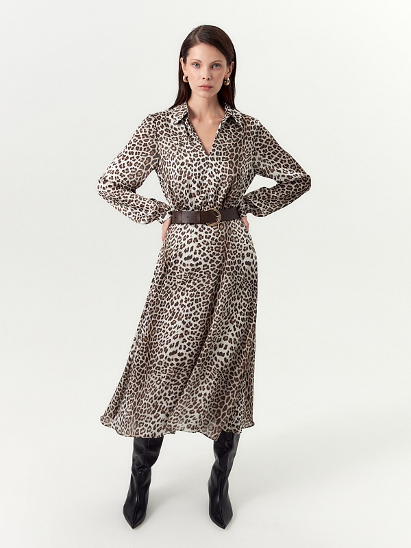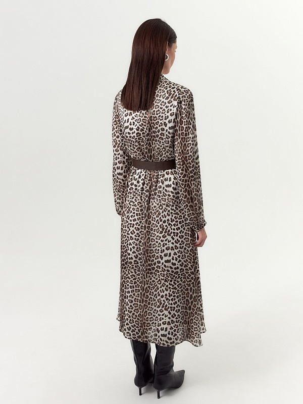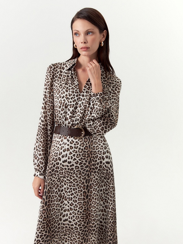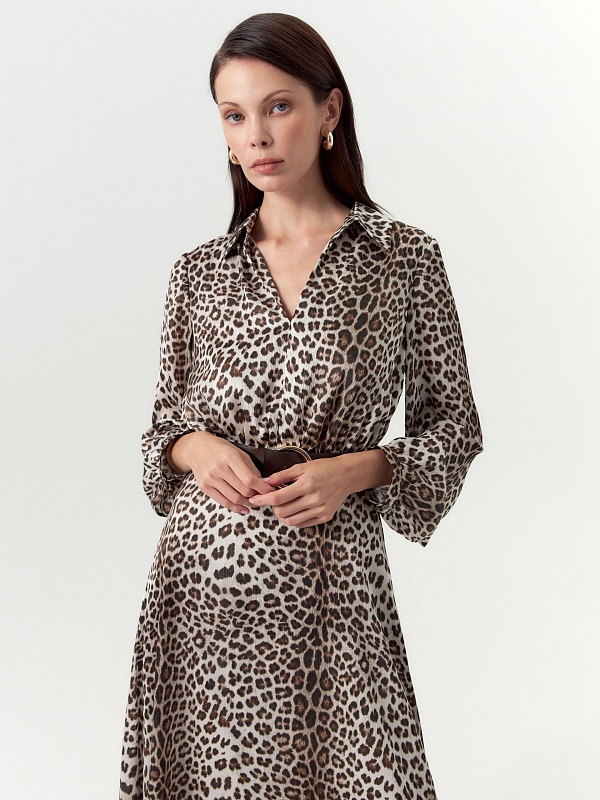 Платье полуприлегающего силуэта отрезное по линии талии с V-образным вырезом и классическим отложным воротником. Рукав втачной на небольшом манжете и сборкой по низу рукава. Платье выполнено из крешированной атласной ткани с анималистичным принтом. В комплект входит ремень из эко кожи.