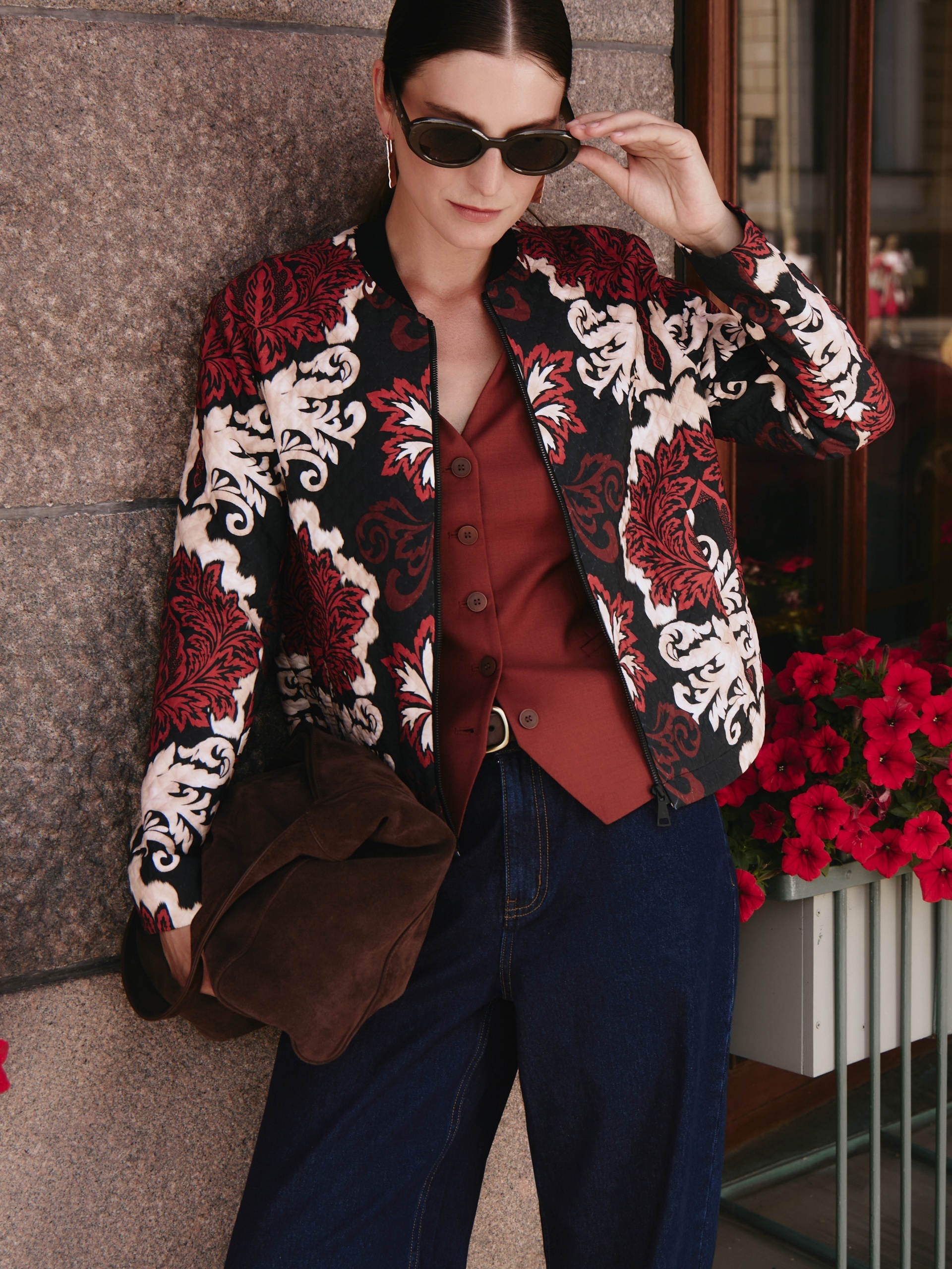 Жакет на молнии в принтованной ткани с лазерной стежкой с воротником-стойкой из кошкорсе. Жакет со спущенным плечом и прорезными карманами-листочками по борту. Длина переда и спинки на разном уровне.