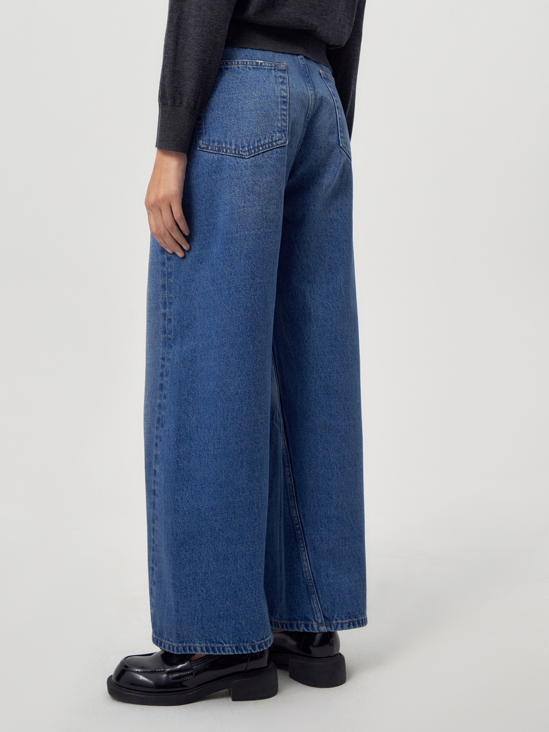 Прямые широкие джинсы, изготовленные из 100% натурального хлопка, на средней посадке в голубом цвете, с перенесенным боковым швом. Джинсы на данной посадке должны свободно лежать на бедрах. Данная модель представляет собой актуальный тренд для осеннего сезона.