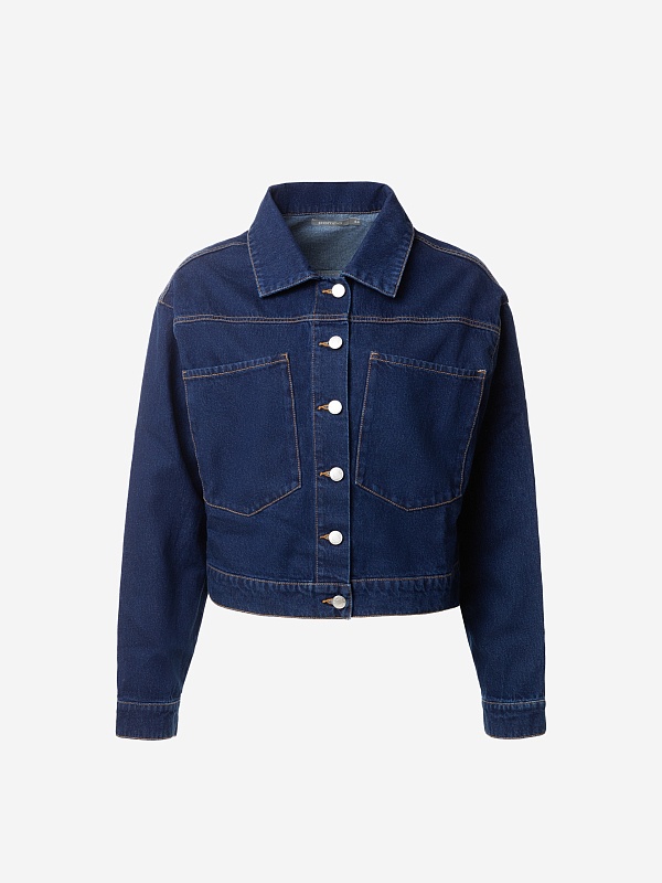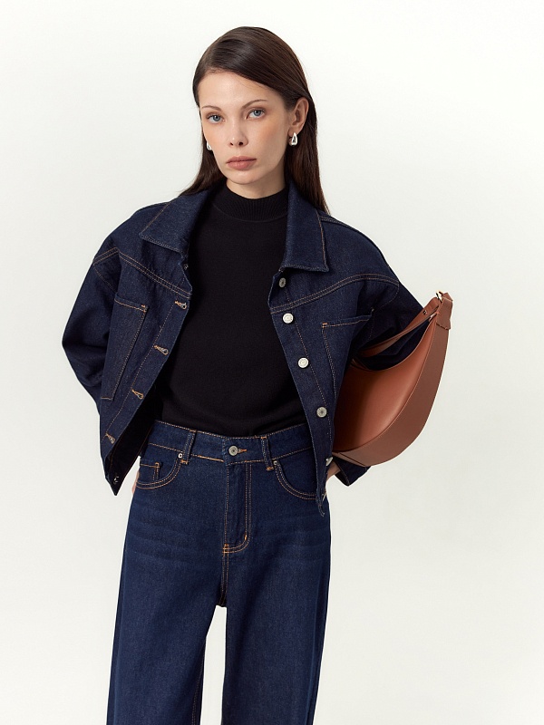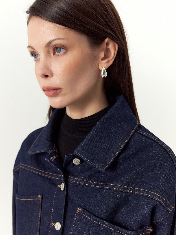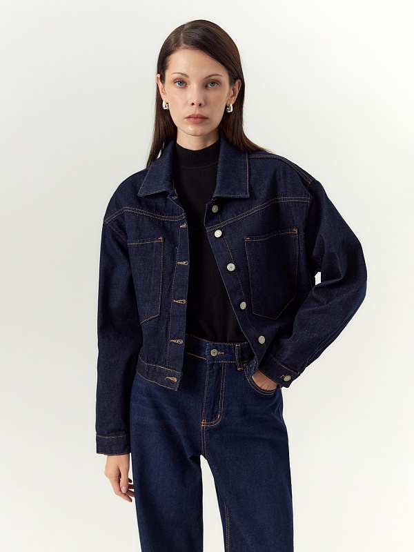 Укороченная свободная джинсовая куртка из 100% хлопка темно-синего цвета, рукав втачной со спущенной линией плеча, классический отложной воротник. На груди накладные карманы. На спинке есть хлястики для регулировки объема.