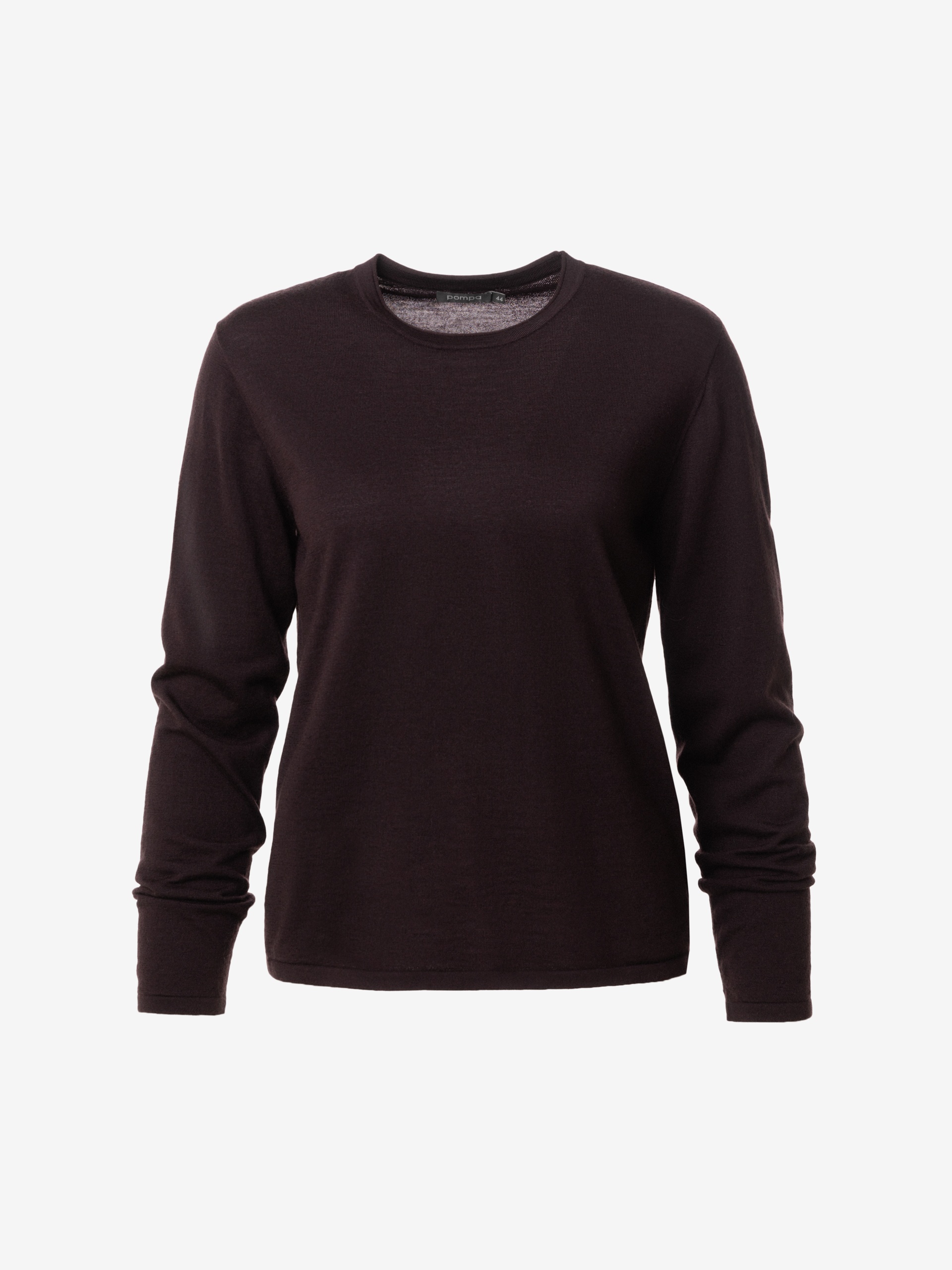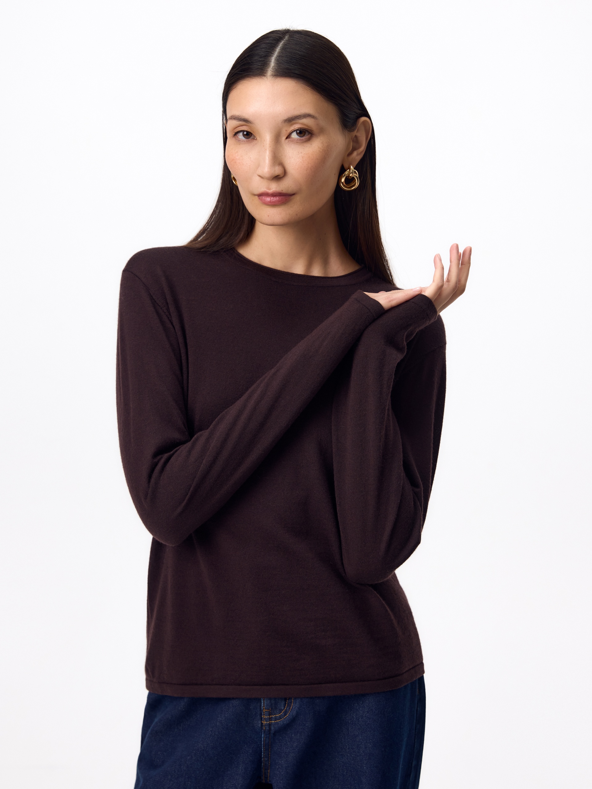 Каштановый джемпер полуприлегающего силуэта. Тонкая и легкая шерсть мериноса абсолютно не колется, что позволяет ей стать прекрасной базой как первый слой под жакеты в осенний период. Мериносовая пряжа и кашемир отличаются тонкостью и мягкостью волокна, высокой прочностью, влагопоглощением, а также особыми теплоизоляционными характеристиками.