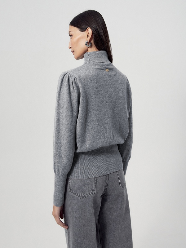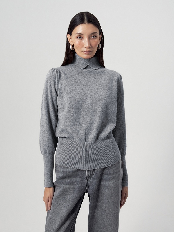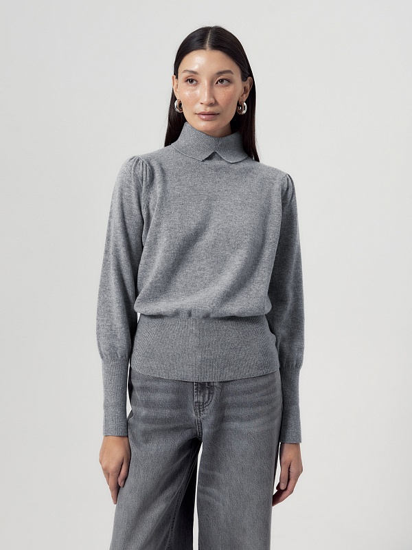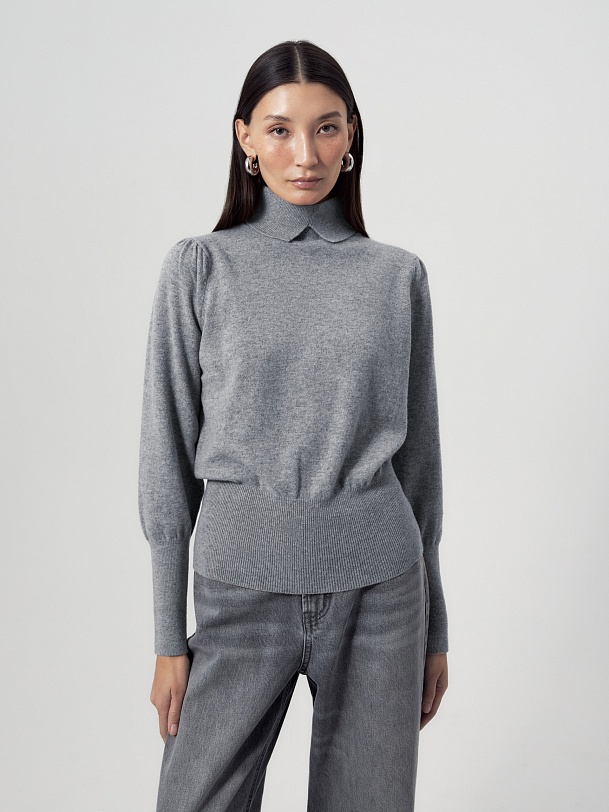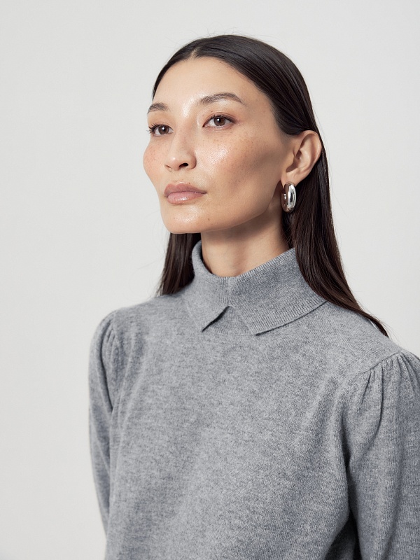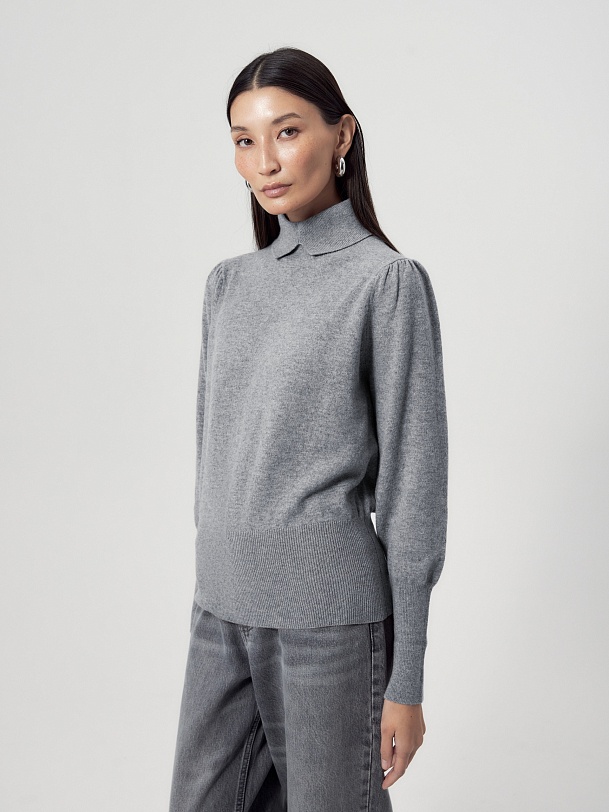 Мягкий и нежный на ощупь джемпер из пряжи шерсти мериноса с добавлением кашемира, выполнен в изысканном оттенке серый меланж. Высокая горловина с имитацией отложного воротника. Рукав полной длины со сборкой по плечевому шву. По низу джемпера и низу рукава широкая резинка. Тонкая и легкая шерсть мериноса абсолютно не колется, что позволяет ей стать прекрасной базой как первый слой под жакеты в осенний период. Мериносовая пряжа и кашемир отличаются тонкостью и мягкостью волокна, высокой прочностью, влагопоглощением, а также особыми теплоизоляционными характеристиками.