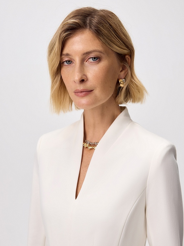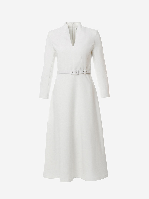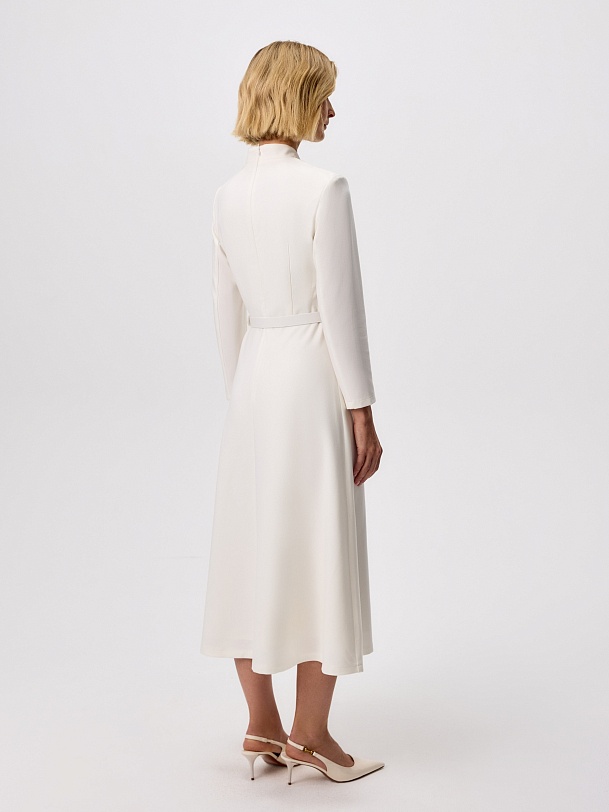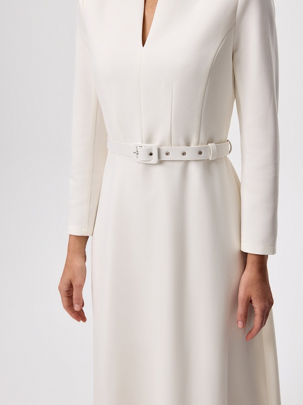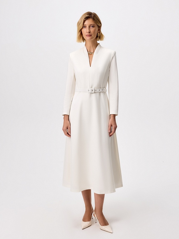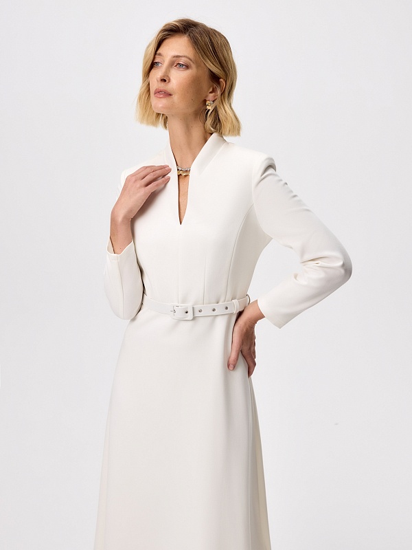 Приталенное платье с расклешенной юбкой из костюмной ткани молочного цвета. Платье с имитацией запаха, отрезное по линии талии, вырез горловины V-образный с цельнокроеным воротником стойкой. Рукав классический втачной, на спинке потайная застежка молния. В комплект входит ремень обтяжной основной тканью.