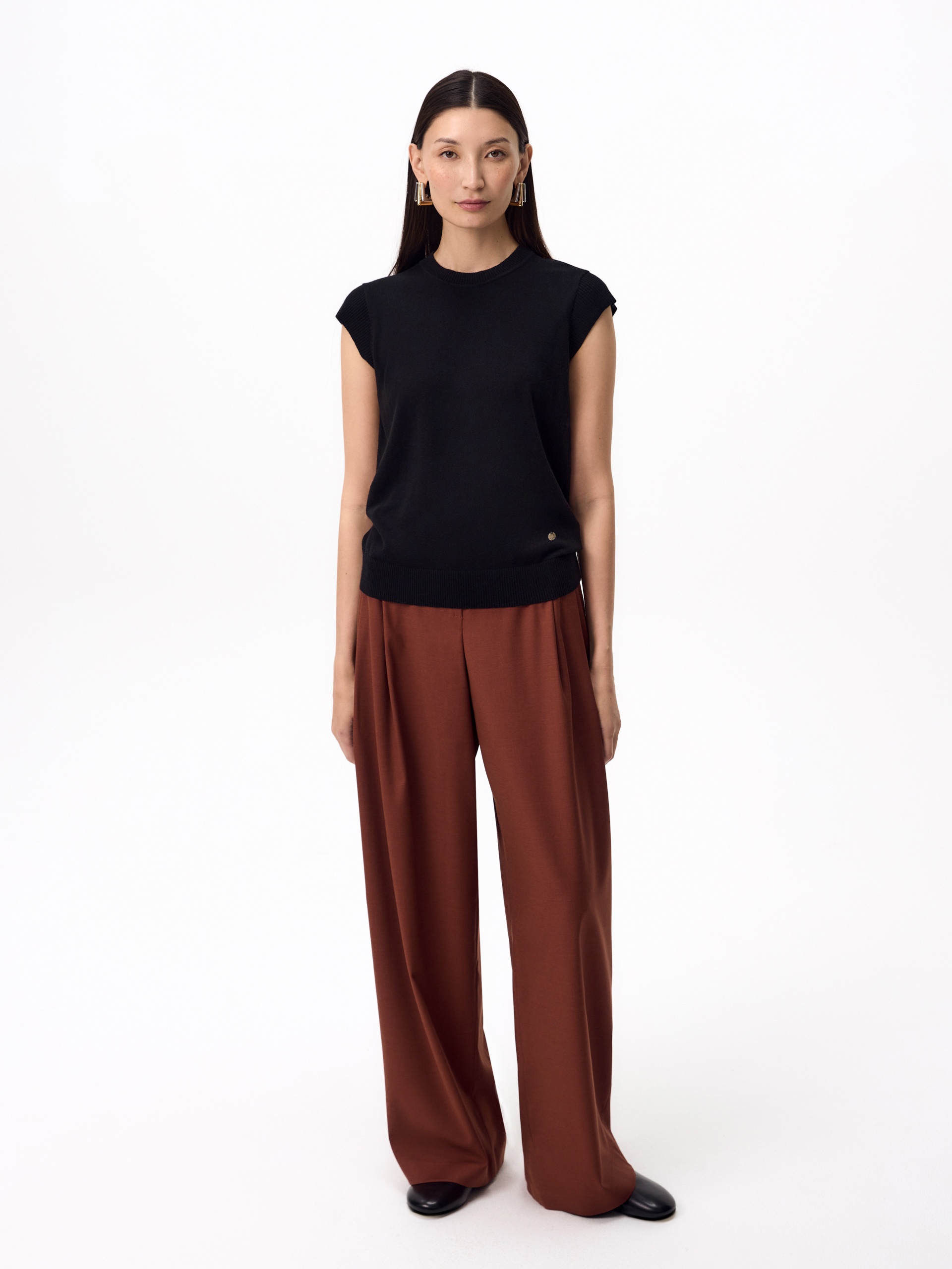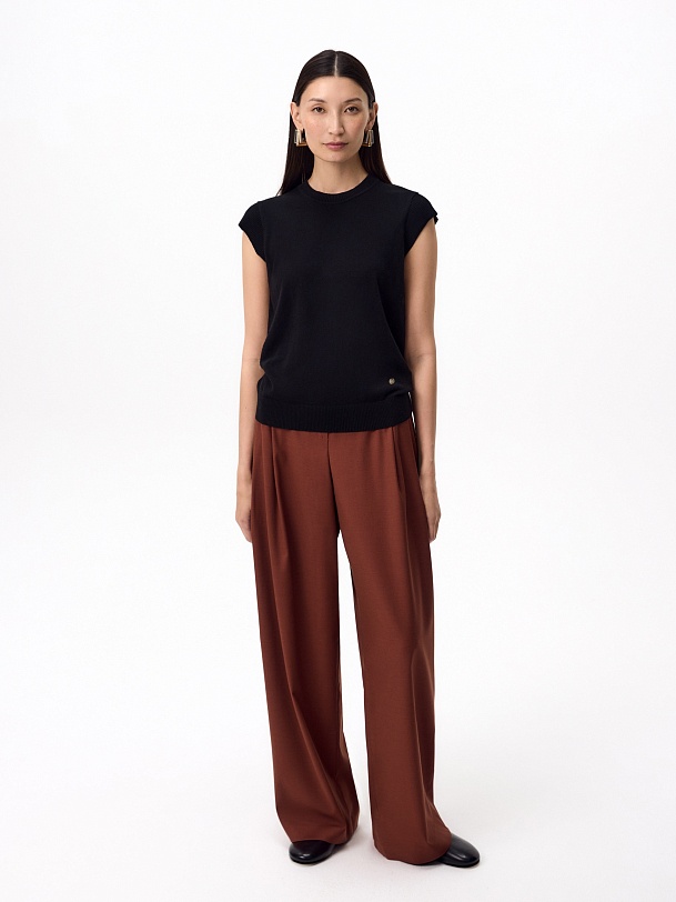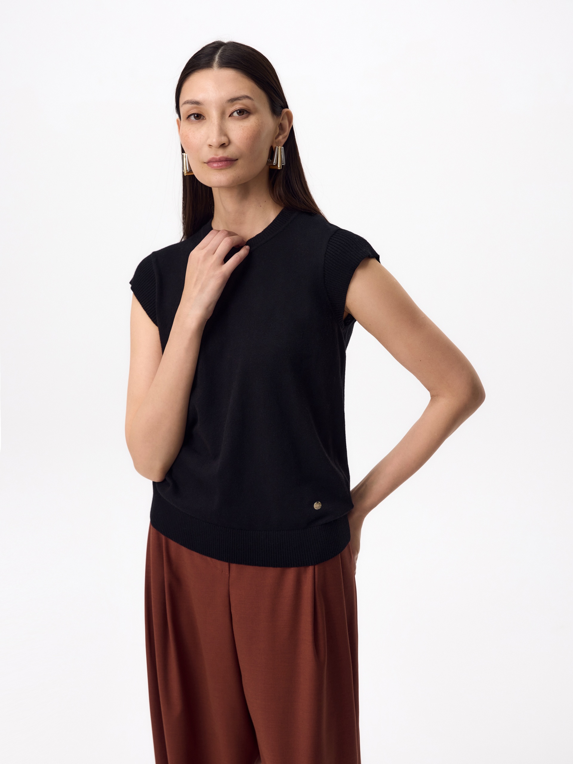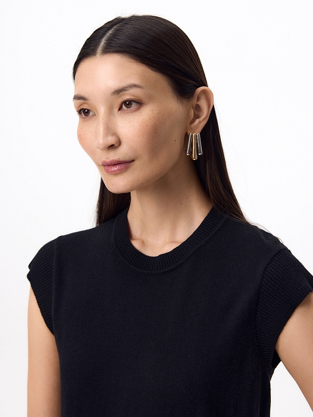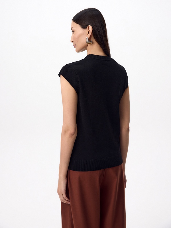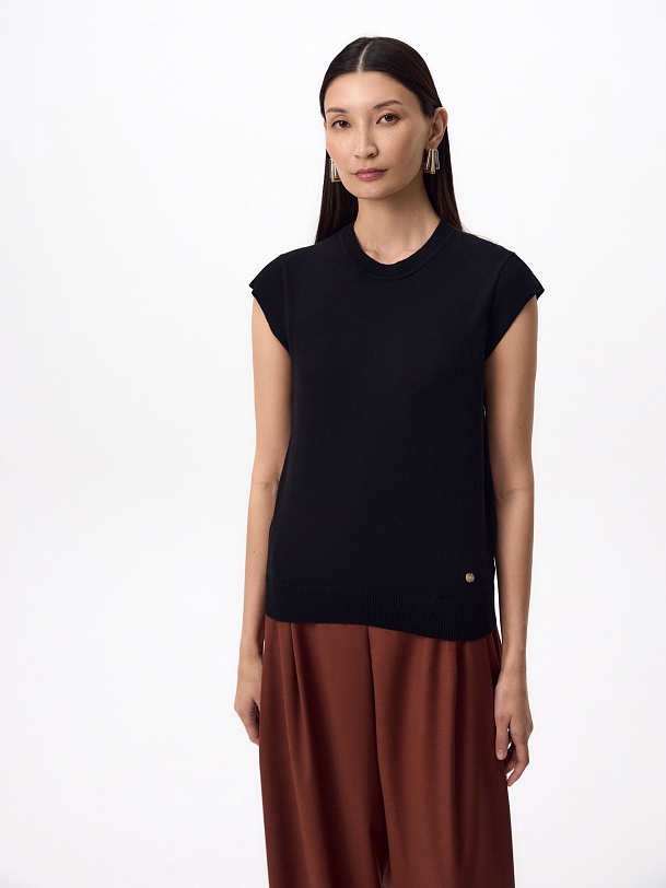 Прямой жилет в черном цвете. У жилета круглая горловина, втачной короткий рукав. Спереди слева круглый металлический декор.