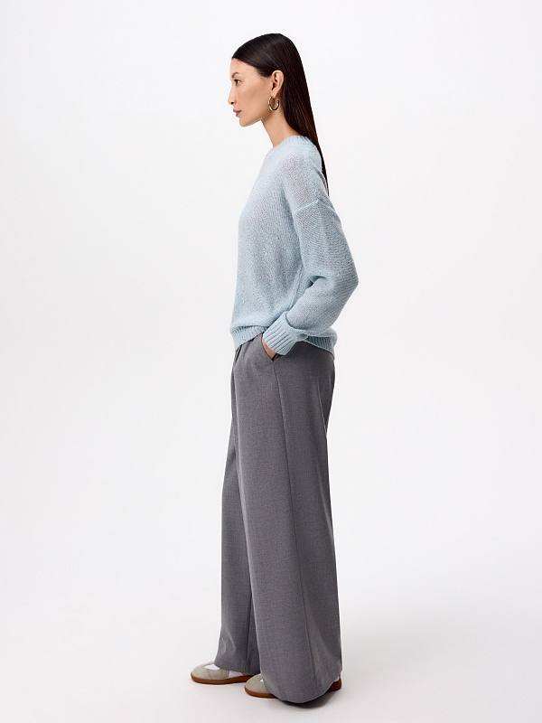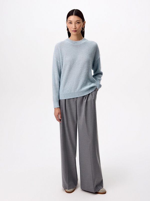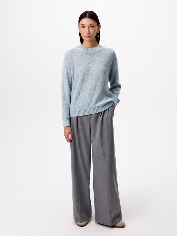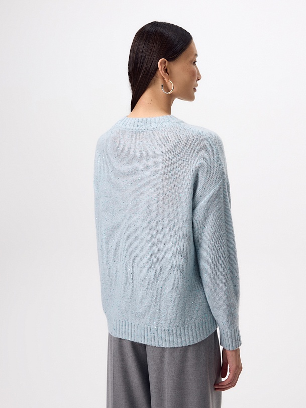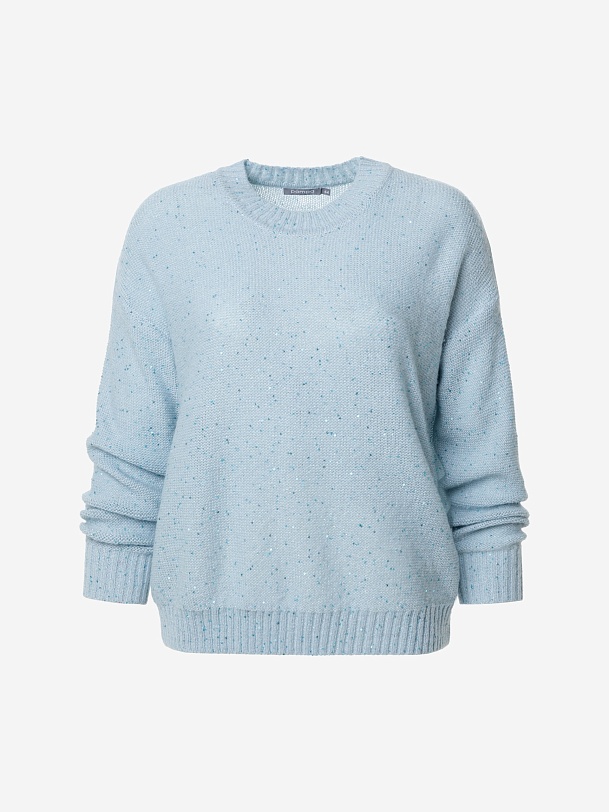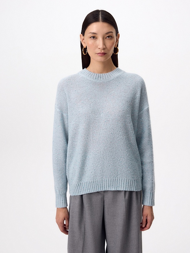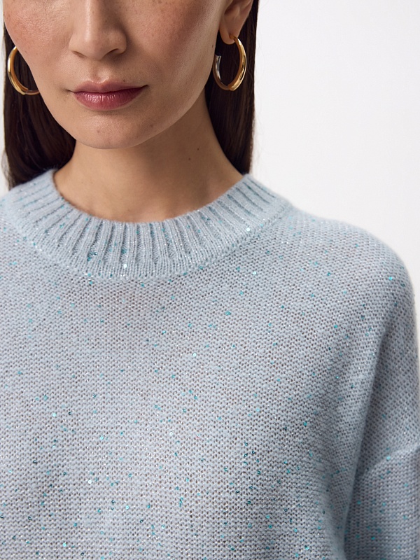Романтичный джемпер из вязаного трикотажа с вкраплениями мелких пайеток и люрекса, которые создают элегантный и ненавязчивый блеск пряжи. Смесовый состав пряжи с содержанием шерсть мериноса даёт дополнительную мягкость и теплоту изделию.