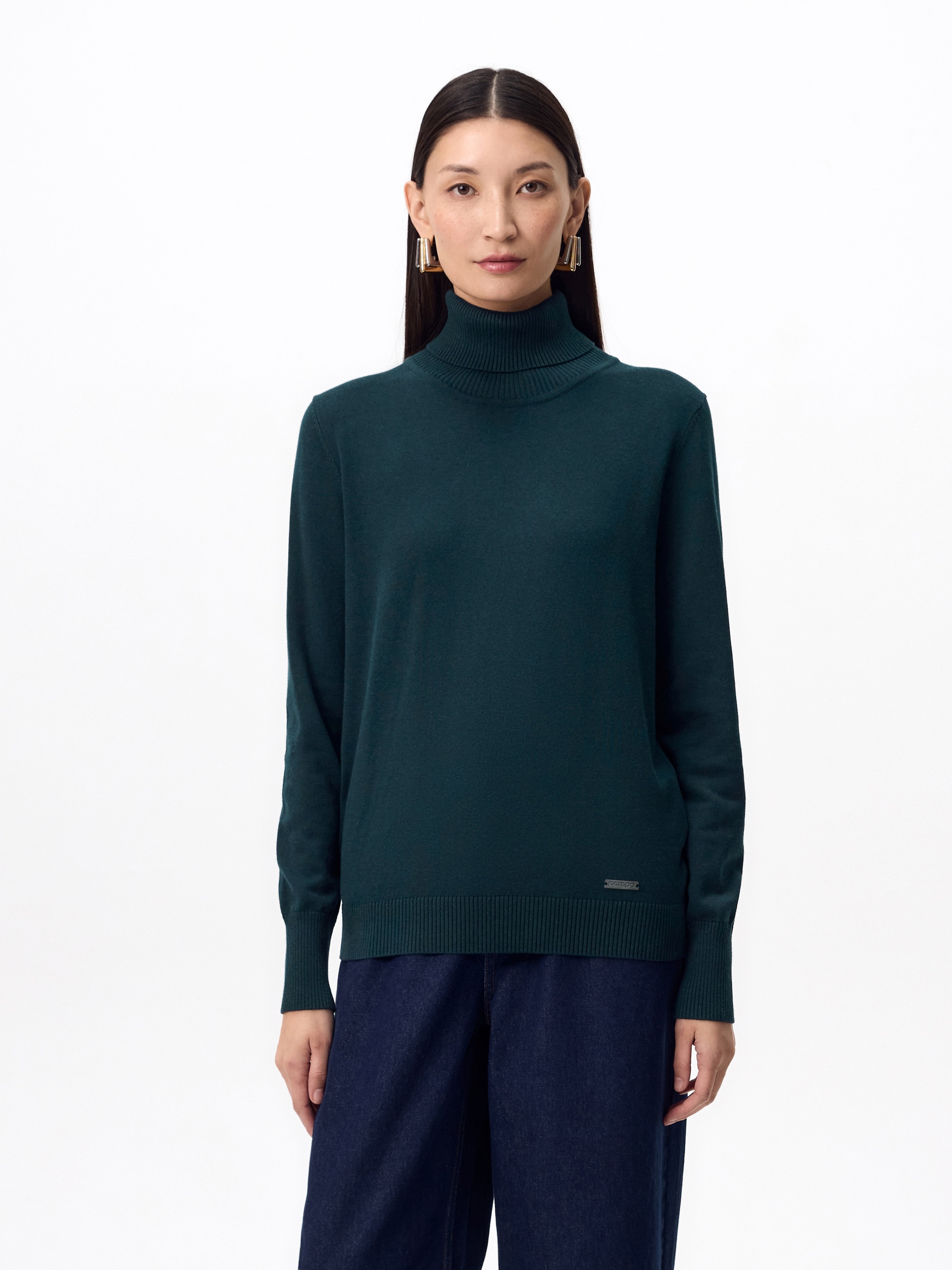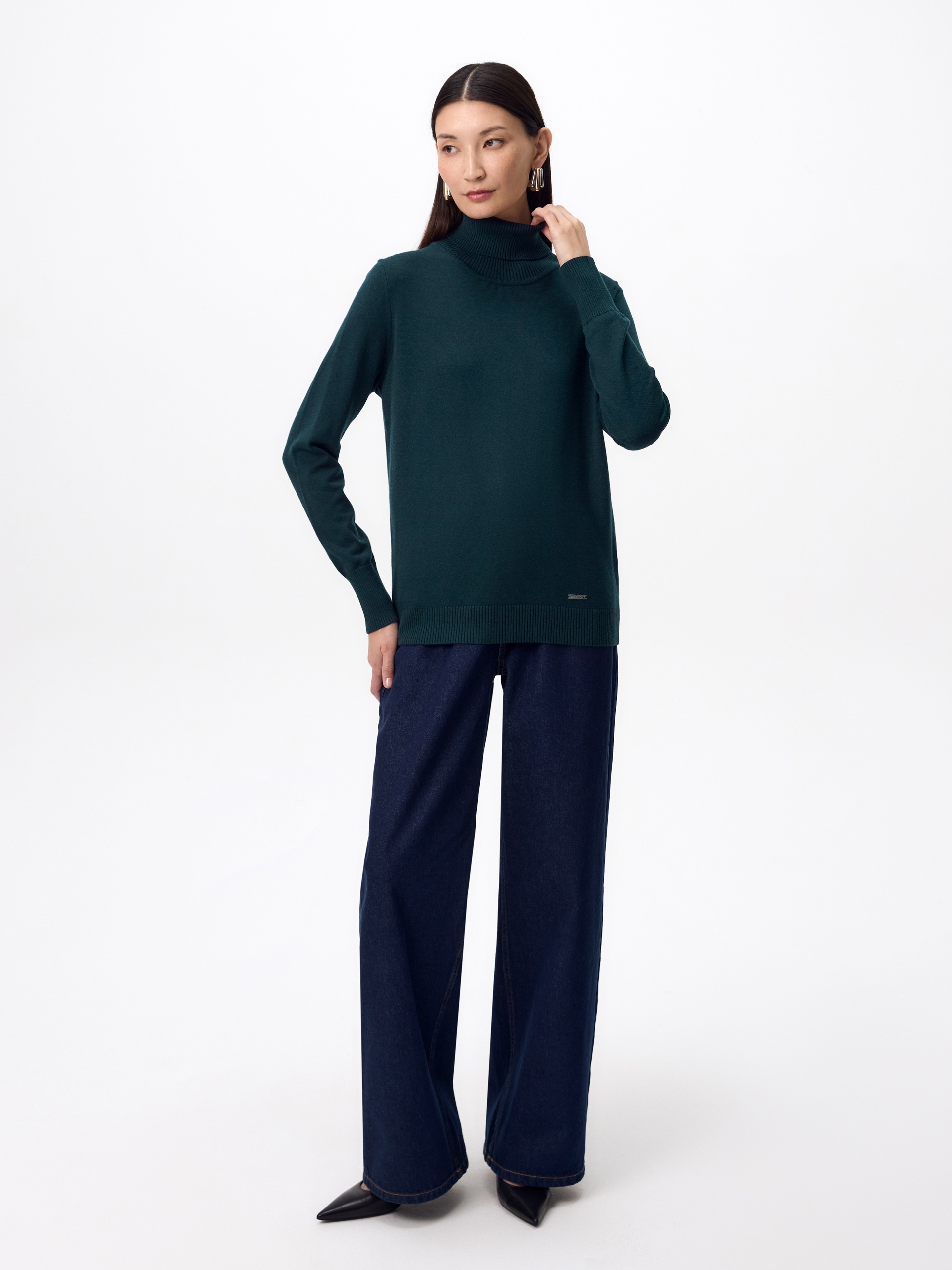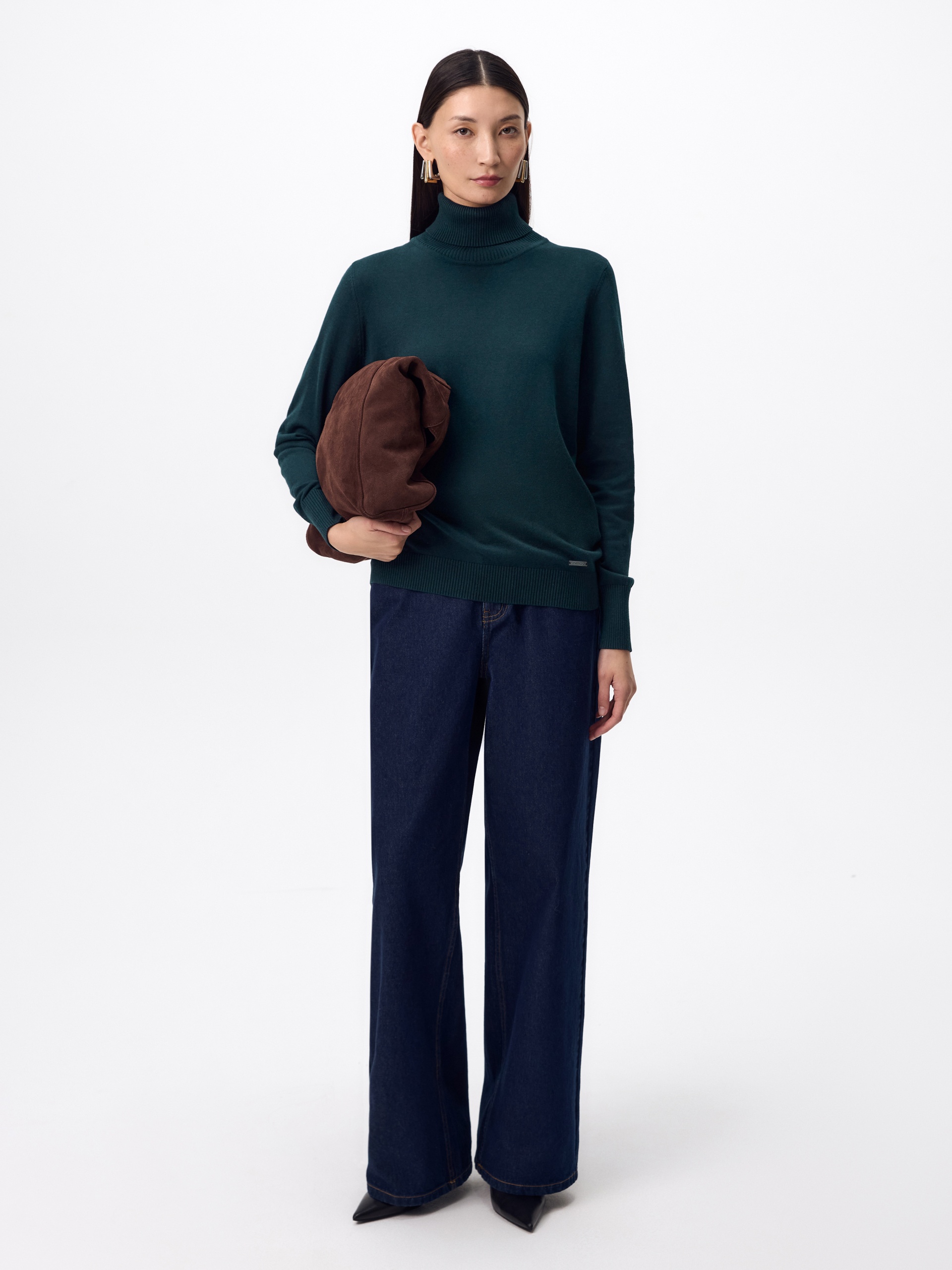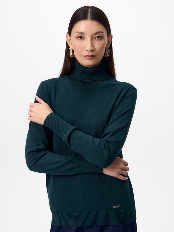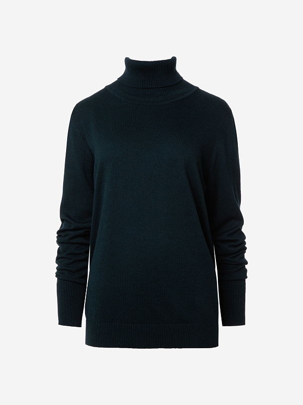 Базовый джемпер благородного темно-зеленого цвета свободного кроя. Отлично сочетается с кардиганами, рубашками, жакетами.