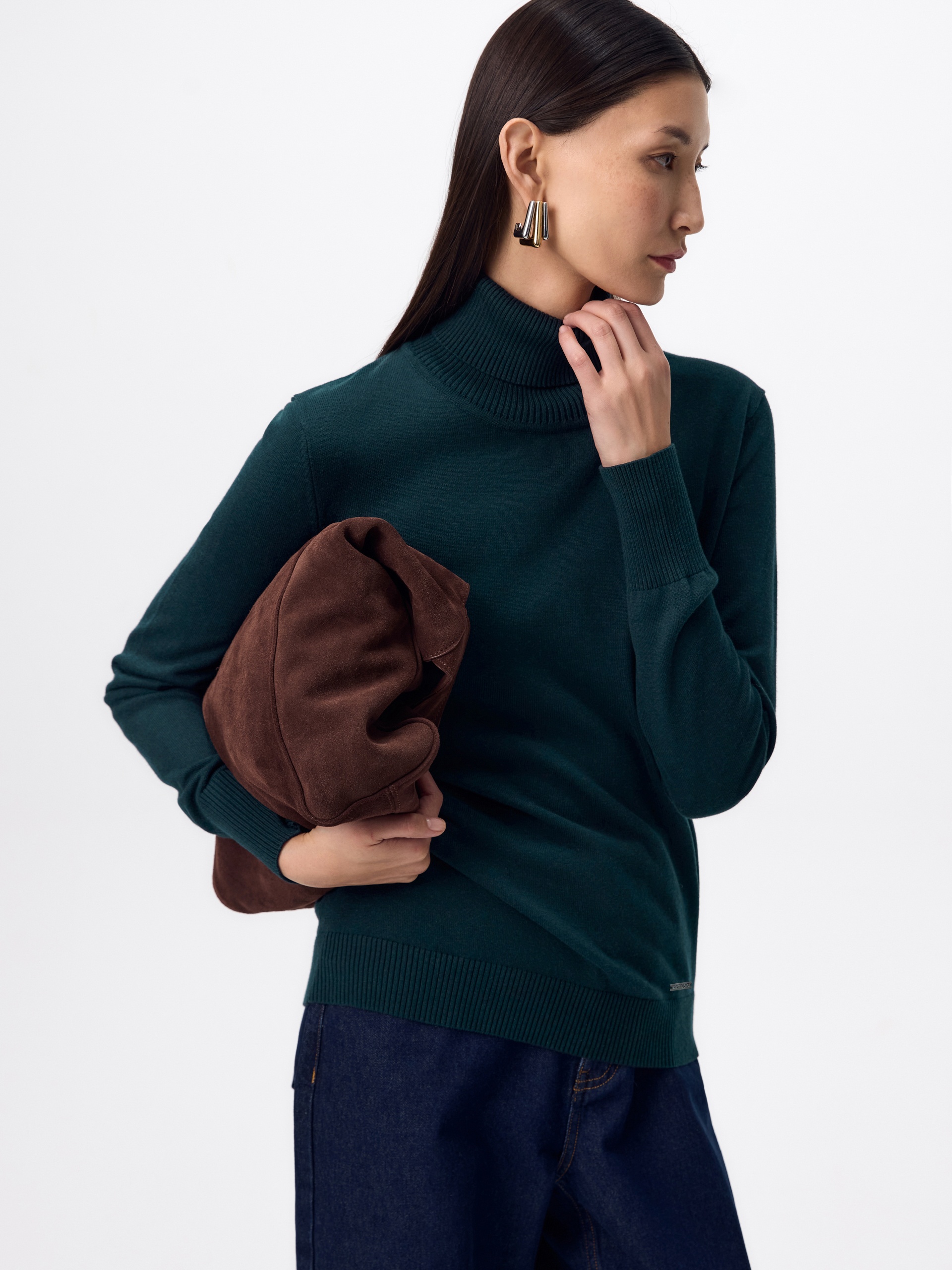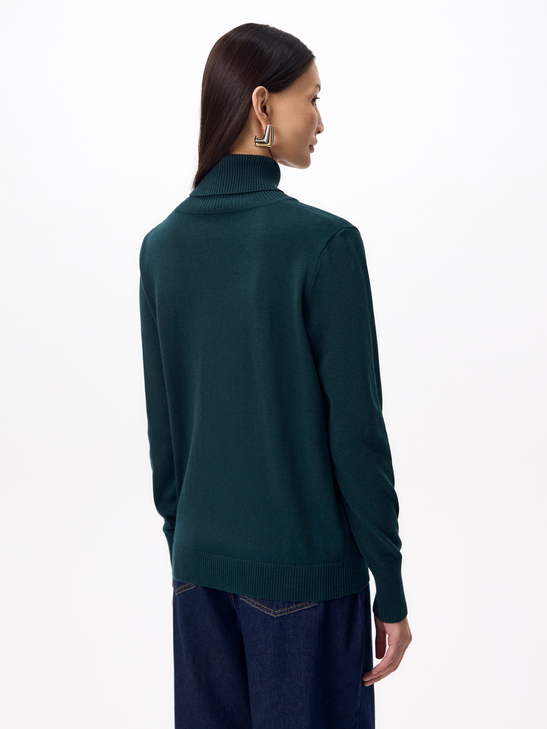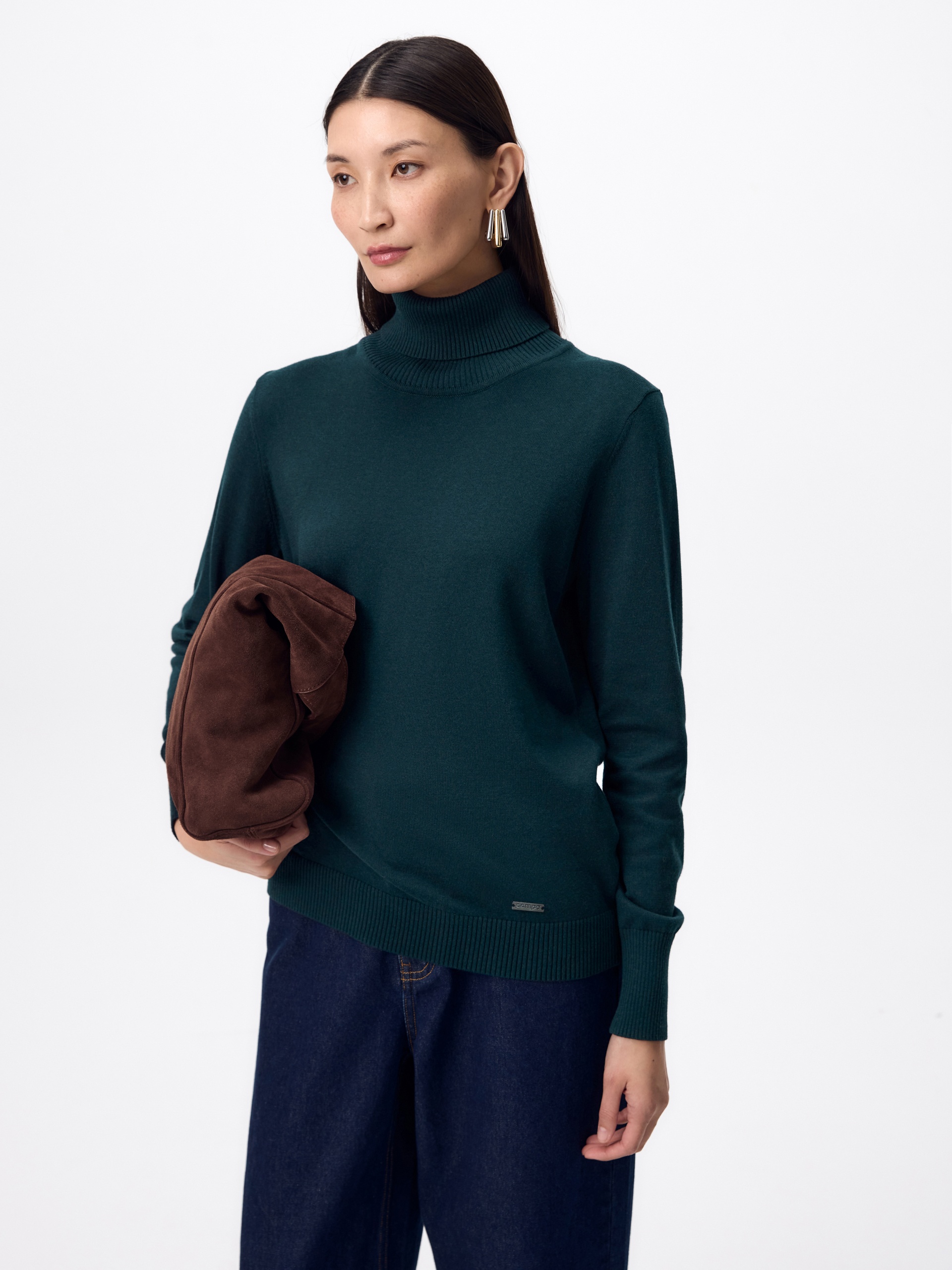 Базовый джемпер благородного темно-зеленого цвета свободного кроя. Отлично сочетается с кардиганами, рубашками, жакетами.