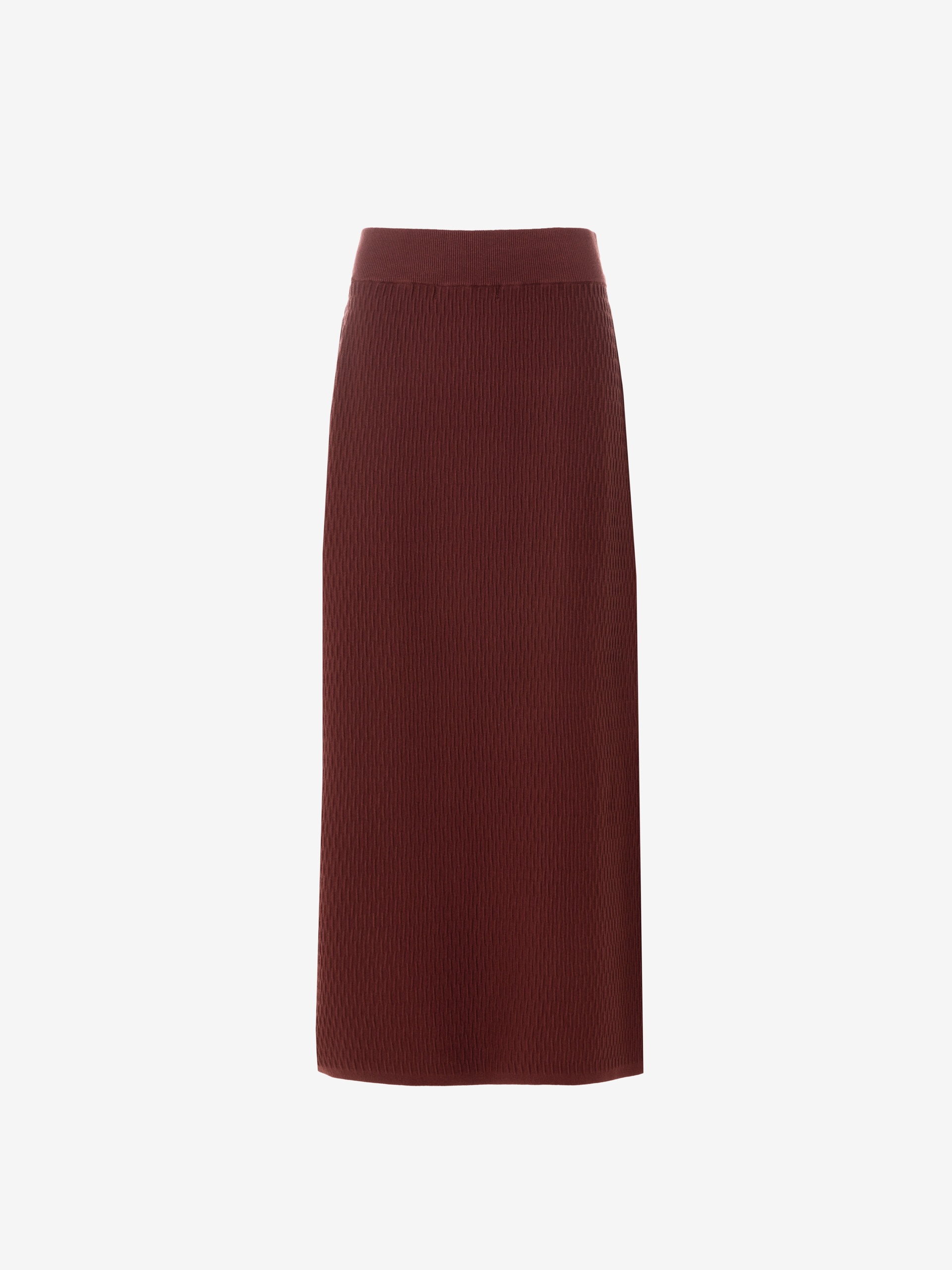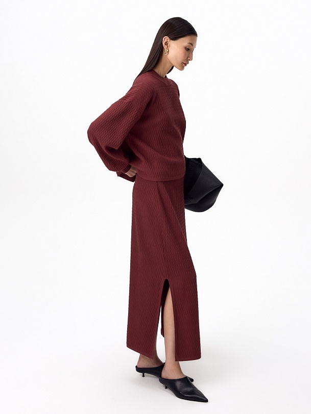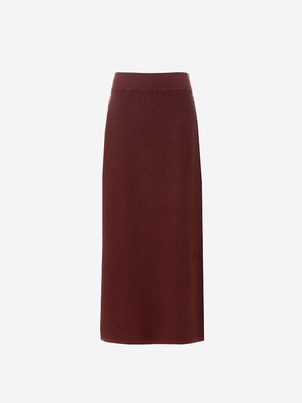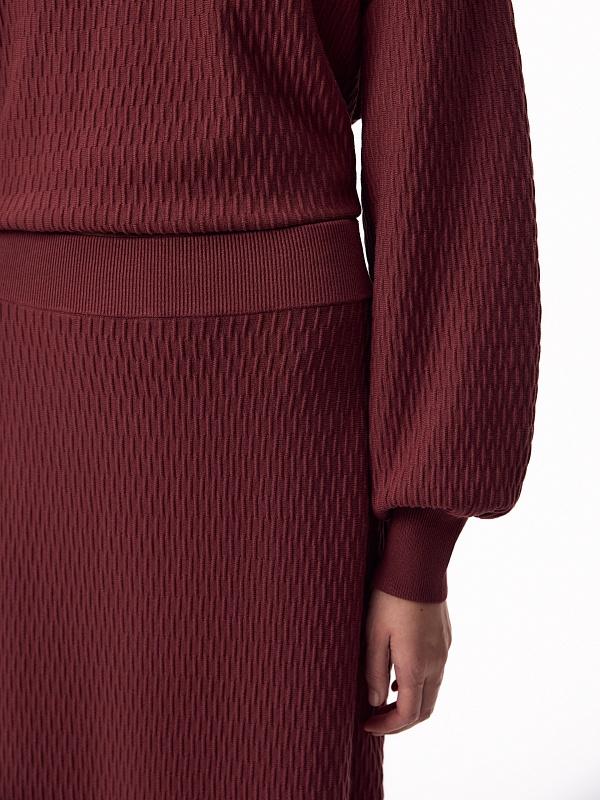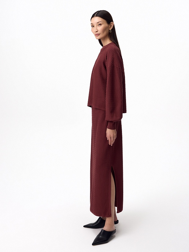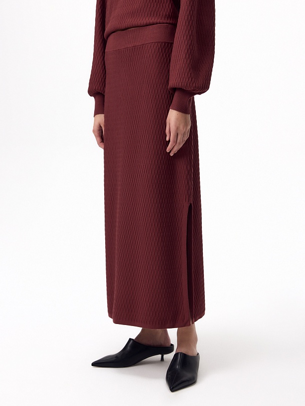 Фактурная вязаная юбка в бордовом цвете.Юбка прямого силуэта, с высоким разрезом сбоку. Отлично смотрится с джемпером из такой же фактурной вязки.