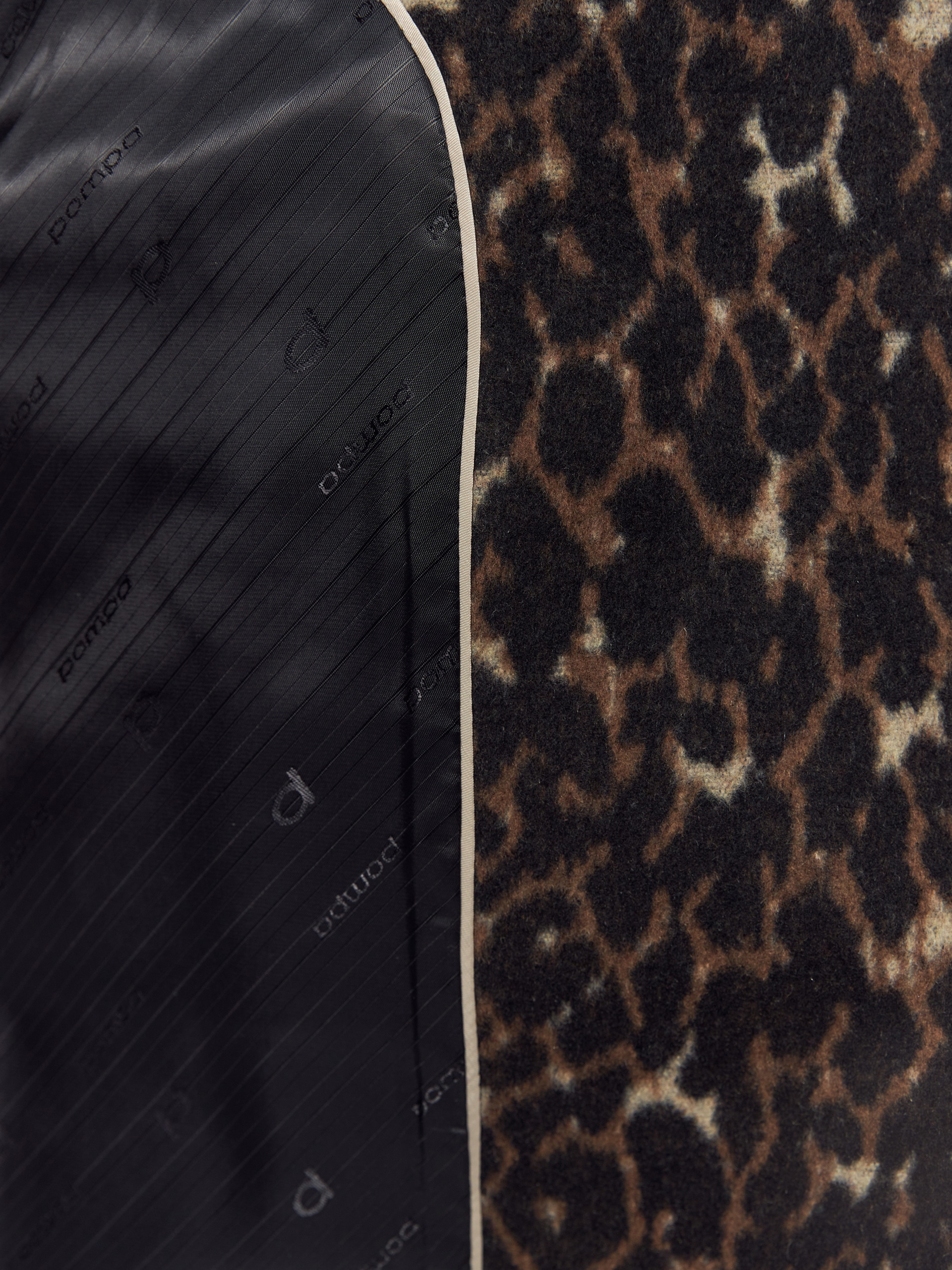 Короткая современная куртка-жакет из пальтовой ткани в трендовом анималистичном принте "леопард". Изделие выполнено из ворсовой ткани с высоким содержанием натуральной шерсти, за счёт чего хорошо сохраняет тепло - жакет можно носить в качестве верхнего слоя до первых холодов. Изделие однобортное, с втачным рукавом и английским воротником. На груди декоративная листочка, спереди два вместительных кармана с клапанами. Застёжка на ряд крупных пуговиц. Стойка воротника из отделочной ткани чёрного цвета декорирована тесьмой. Куртка на подкладке, внутри отделана кантом, в среднем шве спинки шлица. Произведено в Санкт-Петербурге.