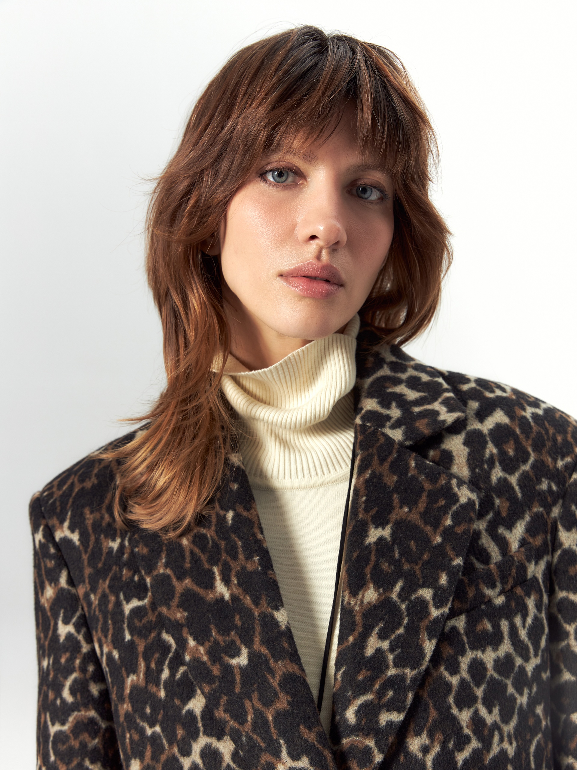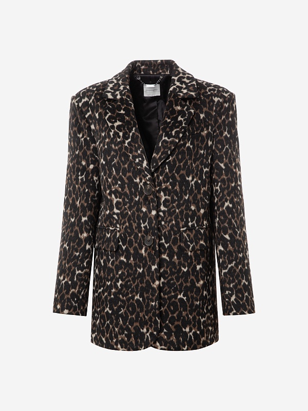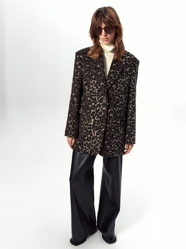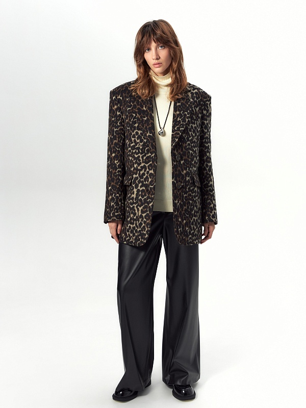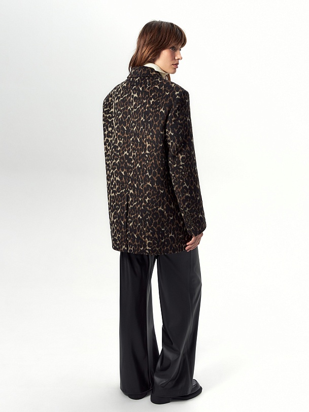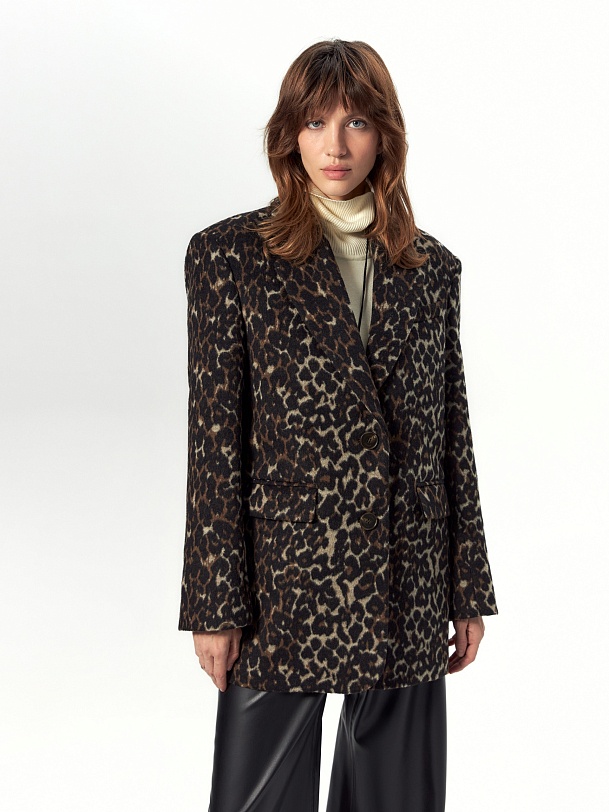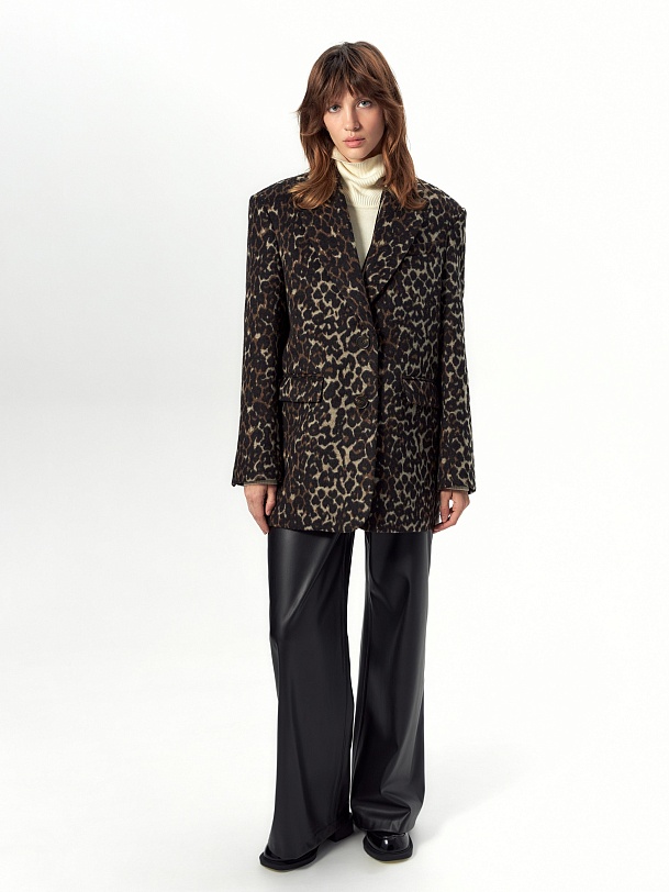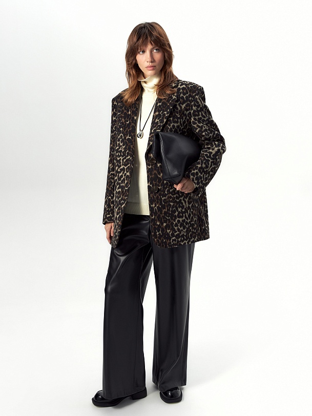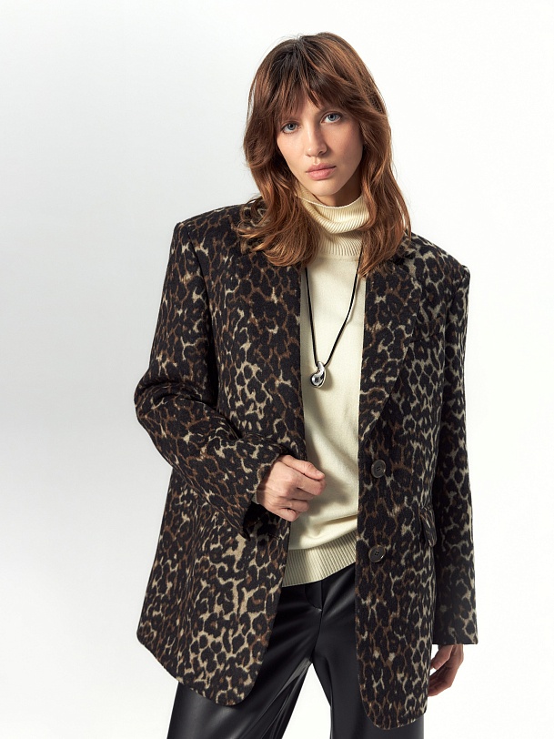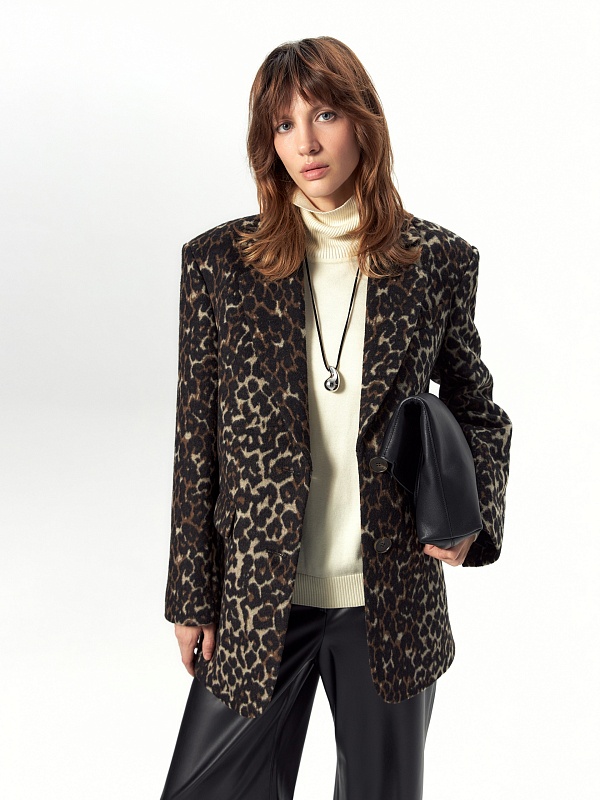 Короткая современная куртка-жакет из пальтовой ткани в трендовом анималистичном принте "леопард". Изделие выполнено из ворсовой ткани с высоким содержанием натуральной шерсти, за счёт чего хорошо сохраняет тепло - жакет можно носить в качестве верхнего слоя до первых холодов. Изделие однобортное, с втачным рукавом и английским воротником. На груди декоративная листочка, спереди два вместительных кармана с клапанами. Застёжка на ряд крупных пуговиц. Стойка воротника из отделочной ткани чёрного цвета декорирована тесьмой. Куртка на подкладке, внутри отделана кантом, в среднем шве спинки шлица. Произведено в Санкт-Петербурге.