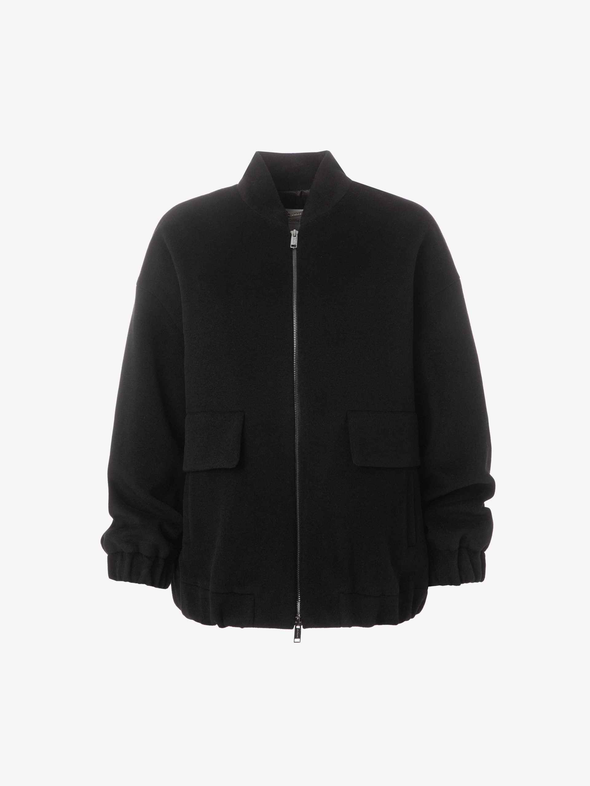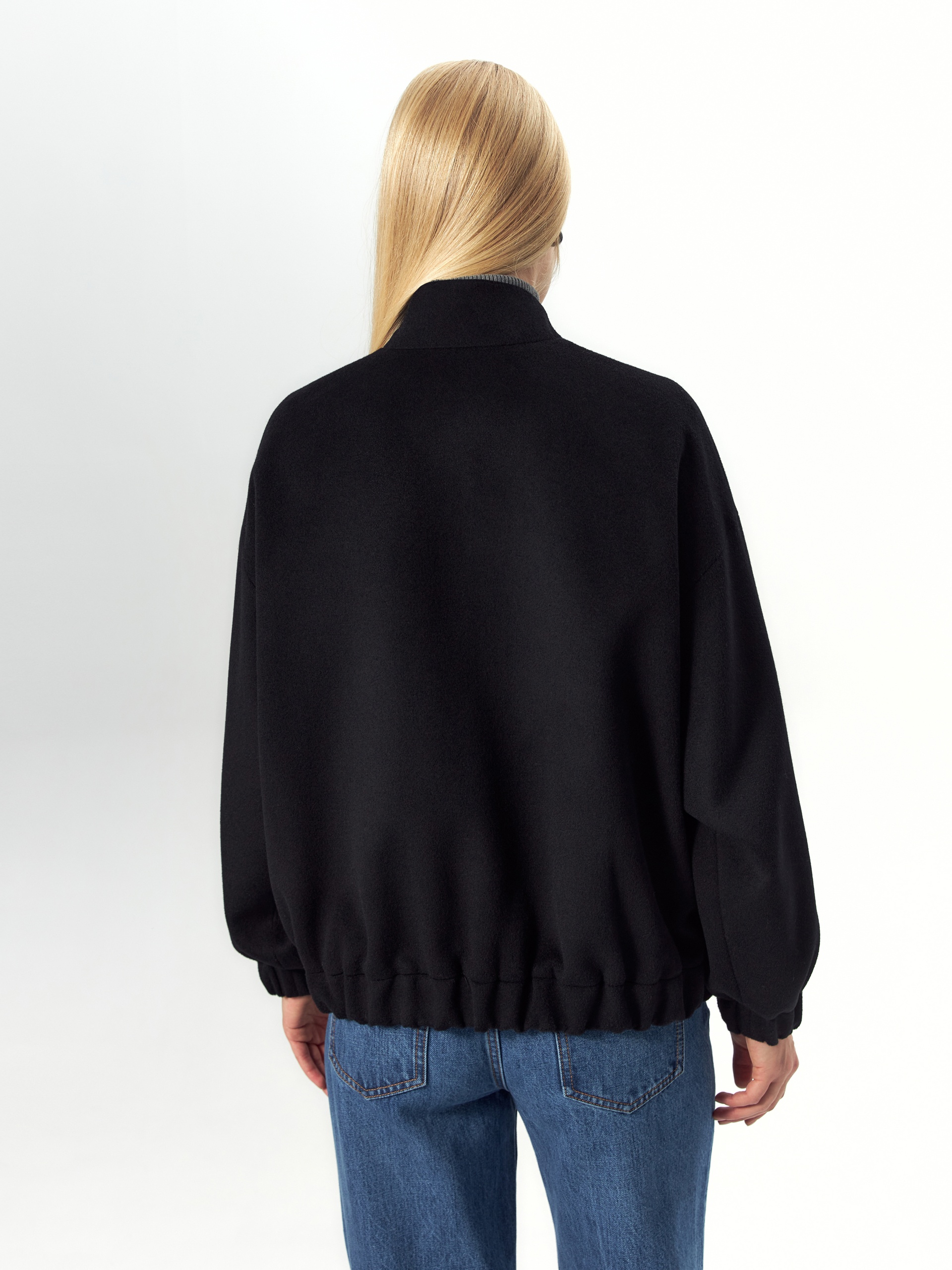 Лаконичная куртка-бомбер из премиальной шерстяной ткани с содержанием натуральной шерсти 95% глубокого чёрного цвета. Свободный рубашечный рукав не стесняет движений. Низ рукава и низ изделия для наибольшего комфорта собраны на широкую резинку. Куртка имеет аккуратный воротник-стойку и вместительные карманы с широкими клапанами. Листочки карманов выполнены из эко-кожи. Застёжка на молнию, края борта окантованы эко-кожей. Изделие на подкладке. Произведено в Санкт-Петербурге.