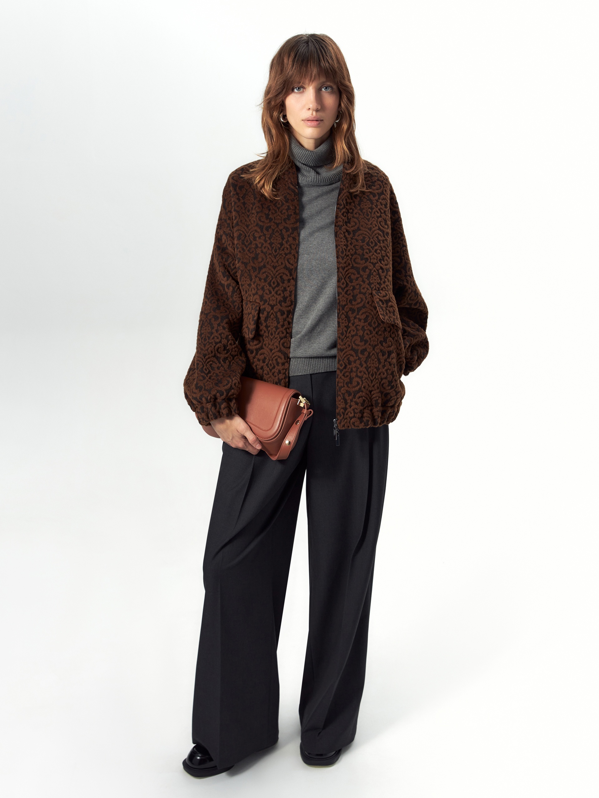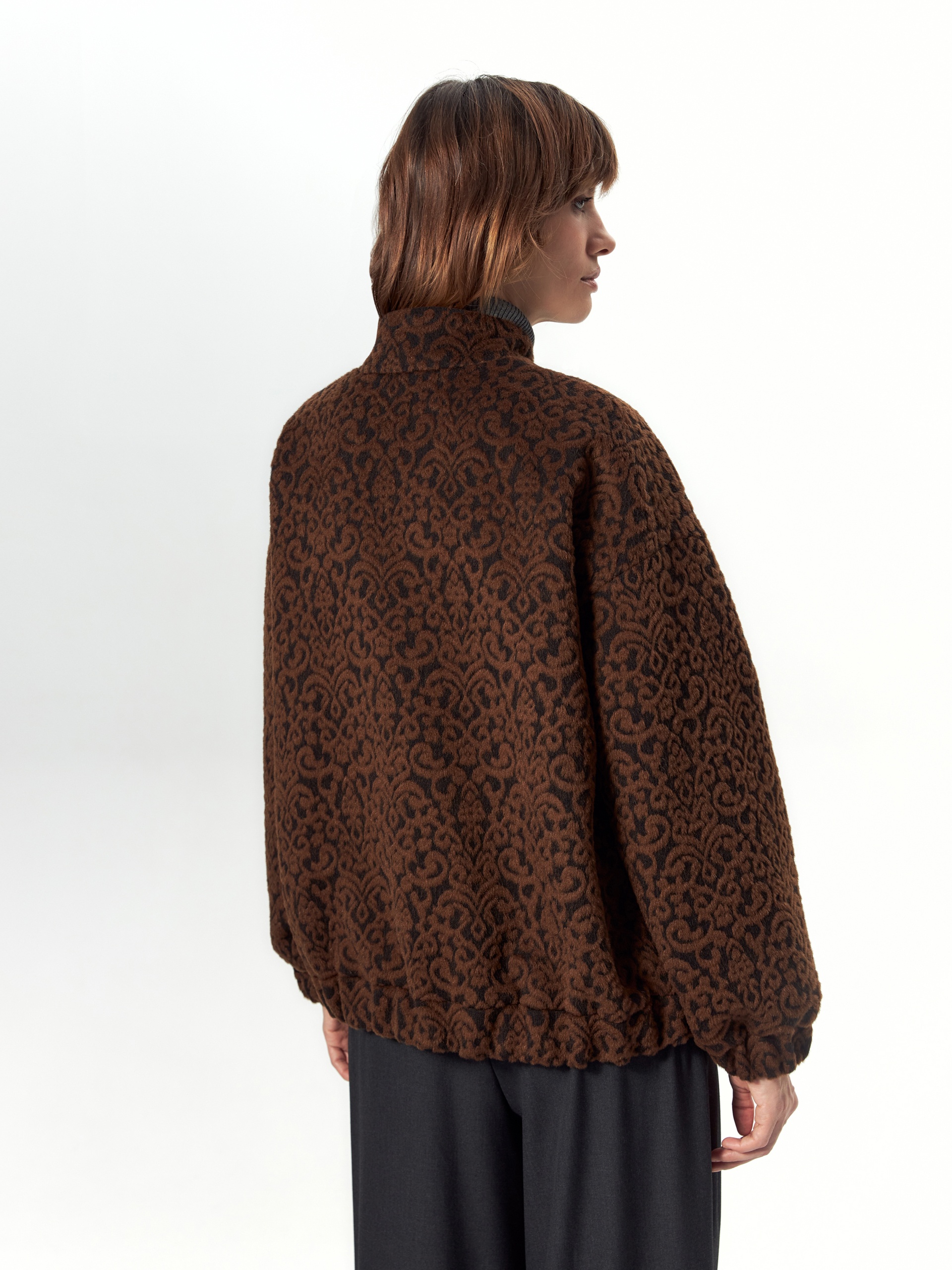 Лаконичная куртка-бомбер из премиальной натуральной шерстяной ворсовой ткани, состоящей из нежной шерсти альпаки, с вытканным на ней модным этно-узором. Свободный рубашечный рукав не стесняет движений. Низ рукава и низ изделия для наибольшего комфорта собраны на широкую резинку. Куртка имеет аккуратный воротник-стойку и вместительные карманы с широкими клапанами. Листочки карманов выполнены из эко-замши. Застёжка на молнию, края борта окантованы эко-замшей. Изделие на подкладке. Произведено в Санкт-Петербурге.