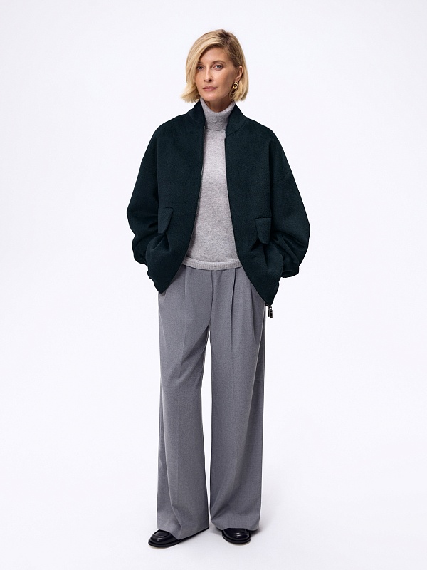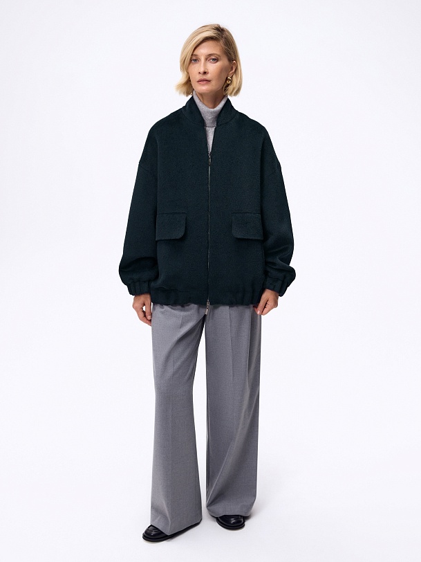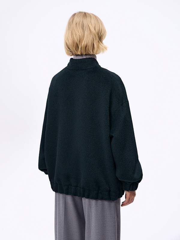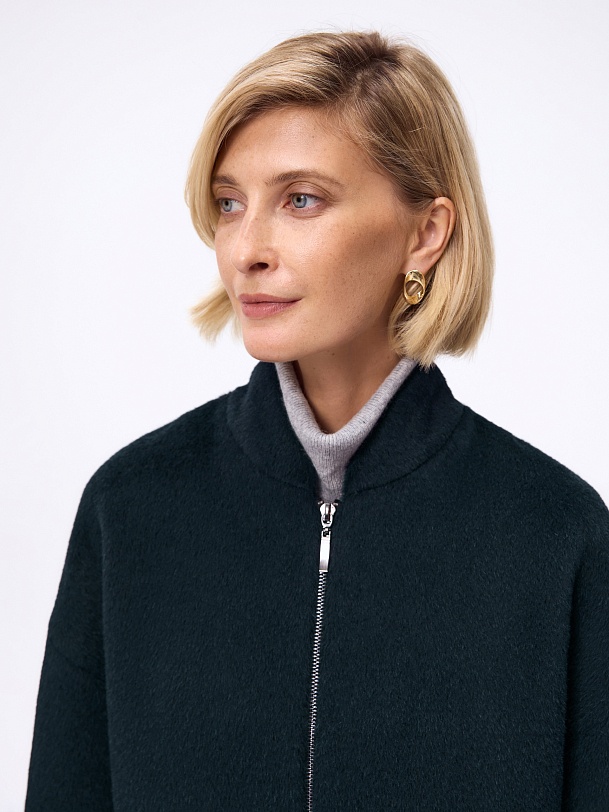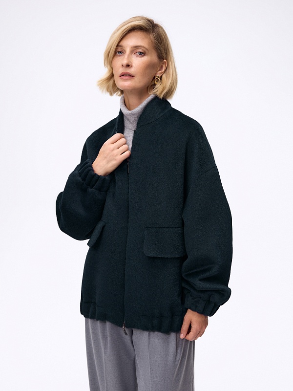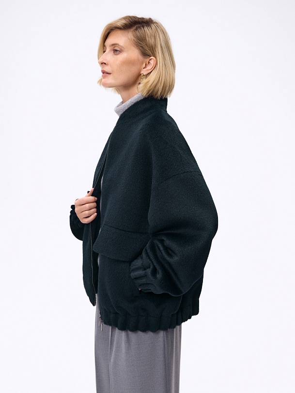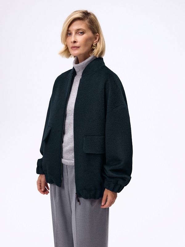 Лаконичная куртка-бомбер мягкого малахитового оттенка из премиальной ткани альпака бэби сури. Свободный рубашечный рукав не стесняет движений. Низ рукава и низ изделия для наибольшего комфорта собраны на широкую резинку. Куртка имеет аккуратный воротник-стойку и вместительные карманы с широкими клапанами. Застежка на молнию. Изделие на подкладке. Произведено в Санкт-Петербурге.