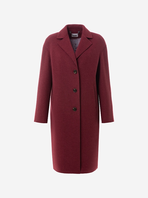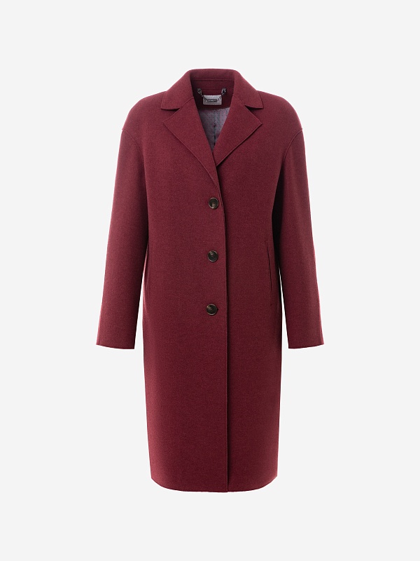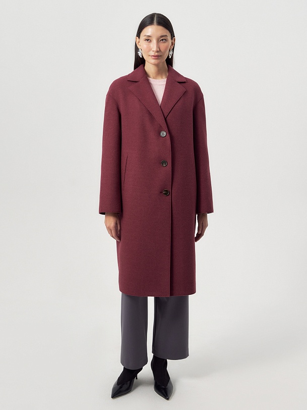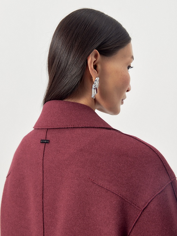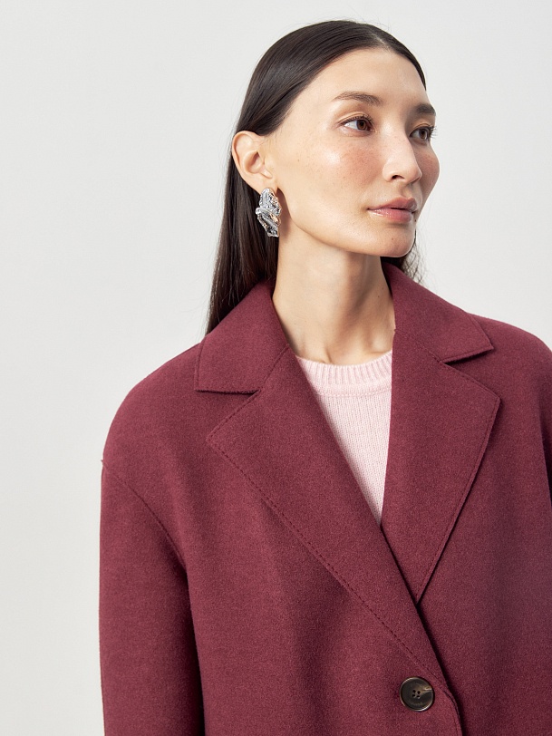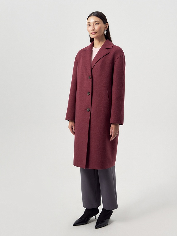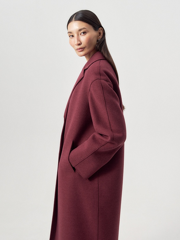 Однобортное лаконичное пальто-кокон из шерстяной ткани с эффектом "вареная шерсть" в благородном вишнёвом оттенке. Английский воротник с зауженным лацканом и втачной спущенный рукав делают пальто стильным и удобным. По бокам расположены прорезные карманы-щели. Длина пальто закрывает колено. Застегивается изделие на ряд крупных пуговиц. Уникальным декоративным элементом являются открытые срезы и тонкие отделочные строчки. Изготовлено с использованием мембраны RaftPro, которая надежно и бережно защитит от любой непогоды. Произведено в Санкт-Петербурге.