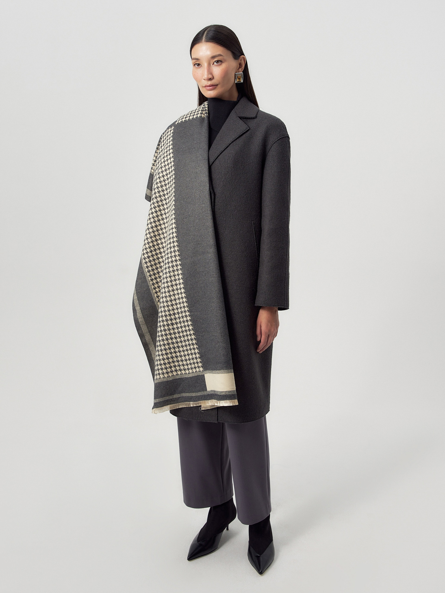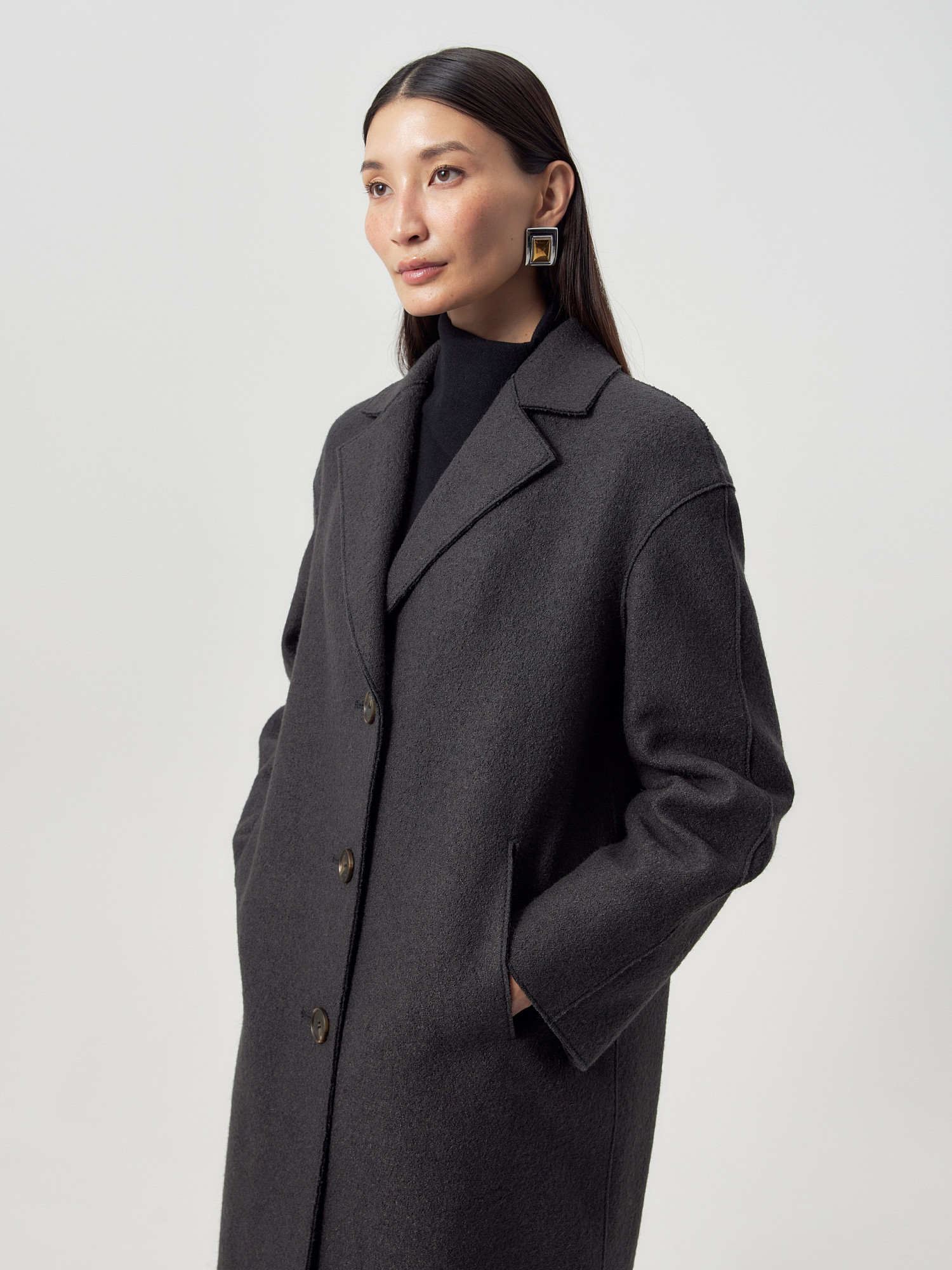 Однобортное лаконичное пальто-кокон из шерстяной ткани с эффектом "вареная шерсть" в универсальном тёмно-сером оттенке. Английский воротник с зауженным лацканом и втачной спущенный рукав делают пальто стильным и удобным. По бокам расположены прорезные карманы-щели. Длина пальто закрывает колено. Застегивается изделие на ряд крупных пуговиц. Уникальным декоративным элементом являются открытые срезы и тонкие отделочные строчки. Изготовлено с использованием мембраны RaftPro, которая надежно и бережно защитит от любой непогоды. Произведено в Санкт-Петербурге.