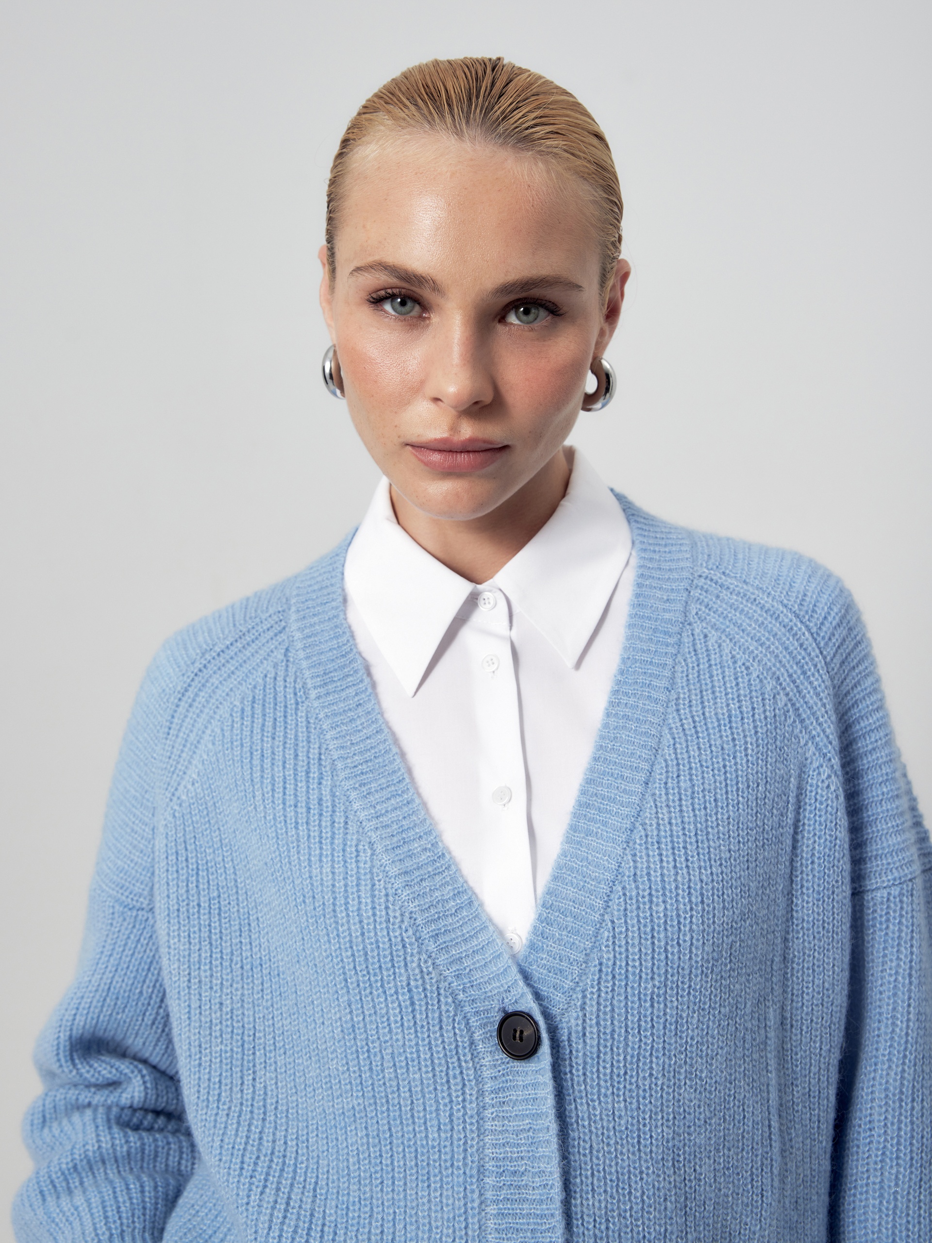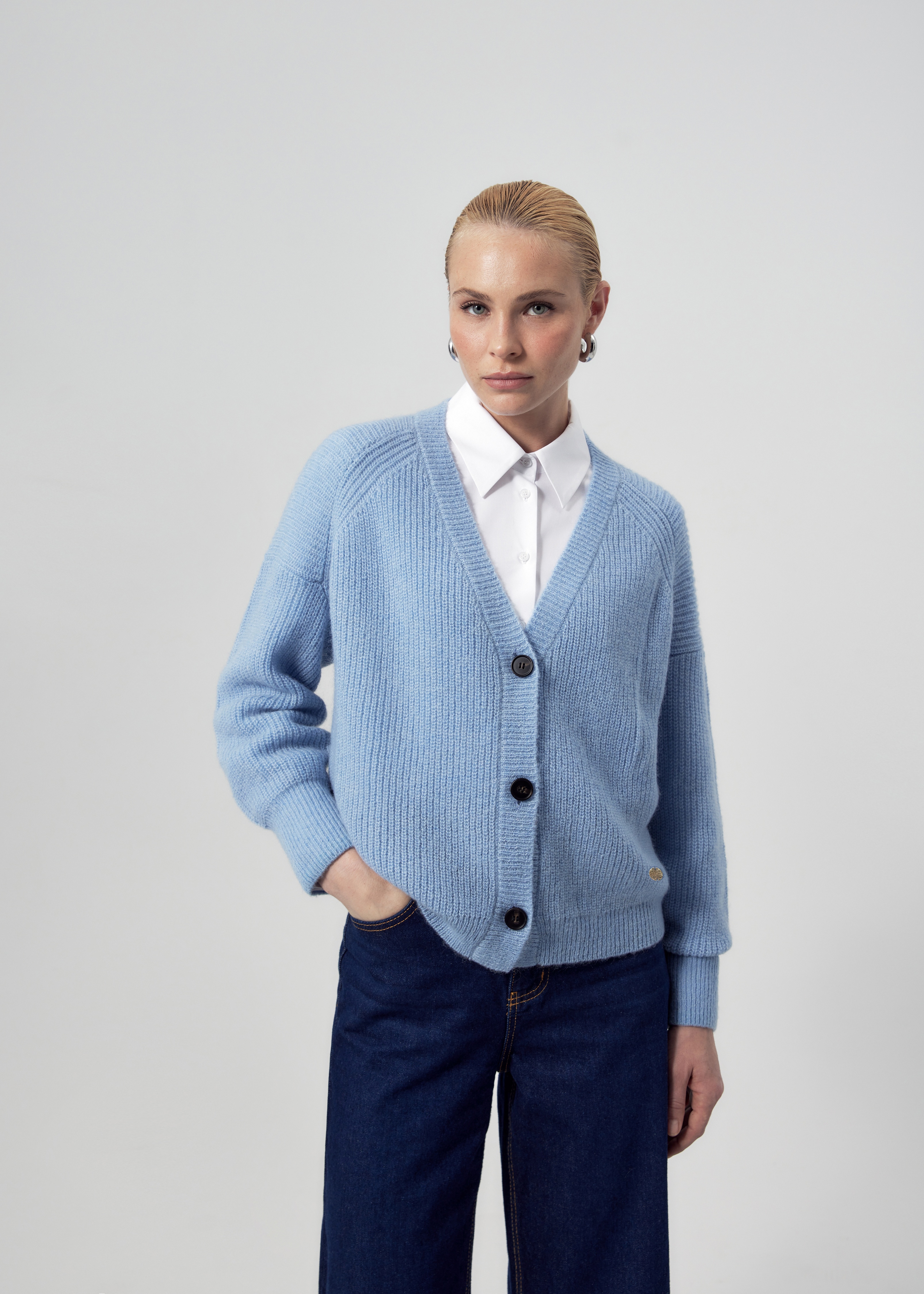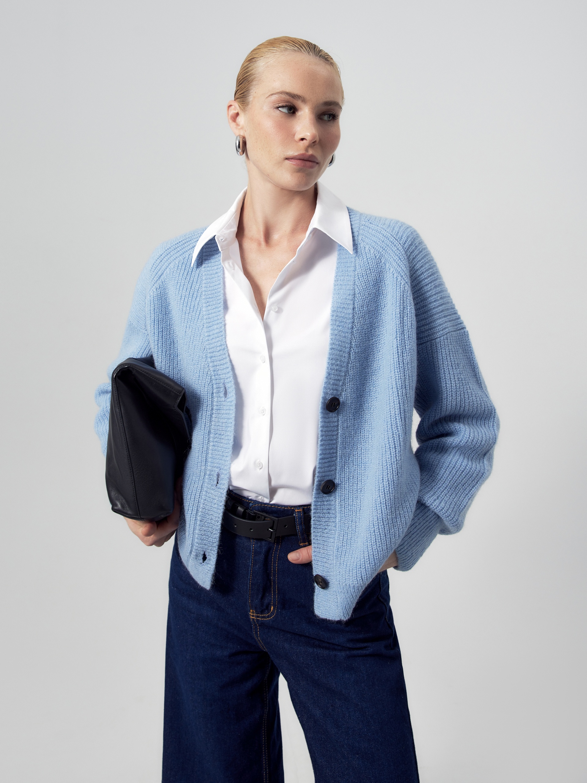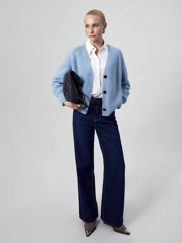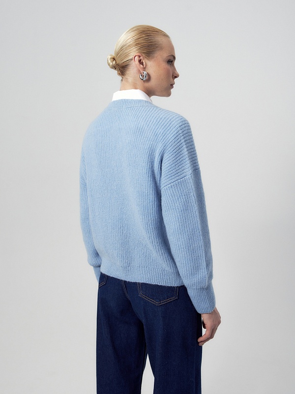Свободный мягкий кардиган небесно-голубого цвета. Горловина V-образной формы, рукав немного спущенный полной длины с манжетой. Спереди застежка на пуговицы. Эта модель - универсальный второй слой для создания утепленных повседневных образов.