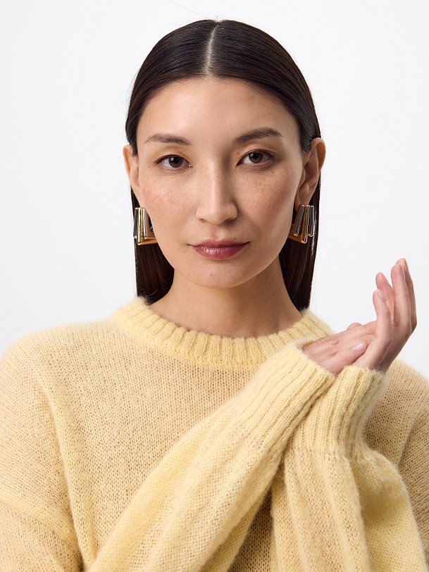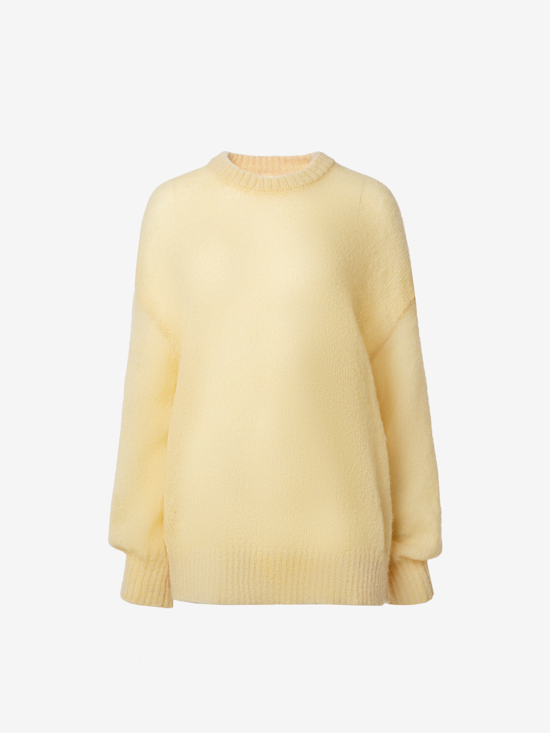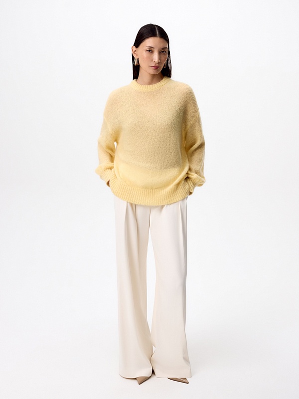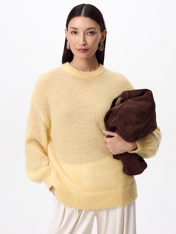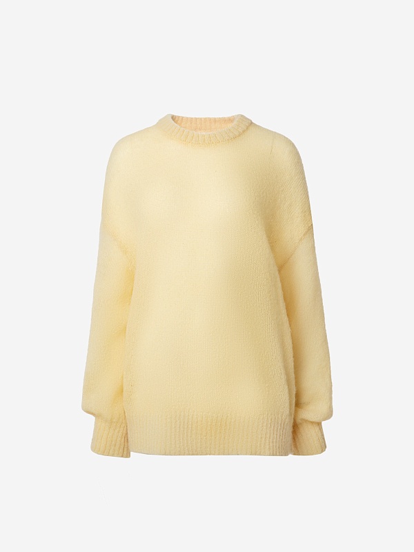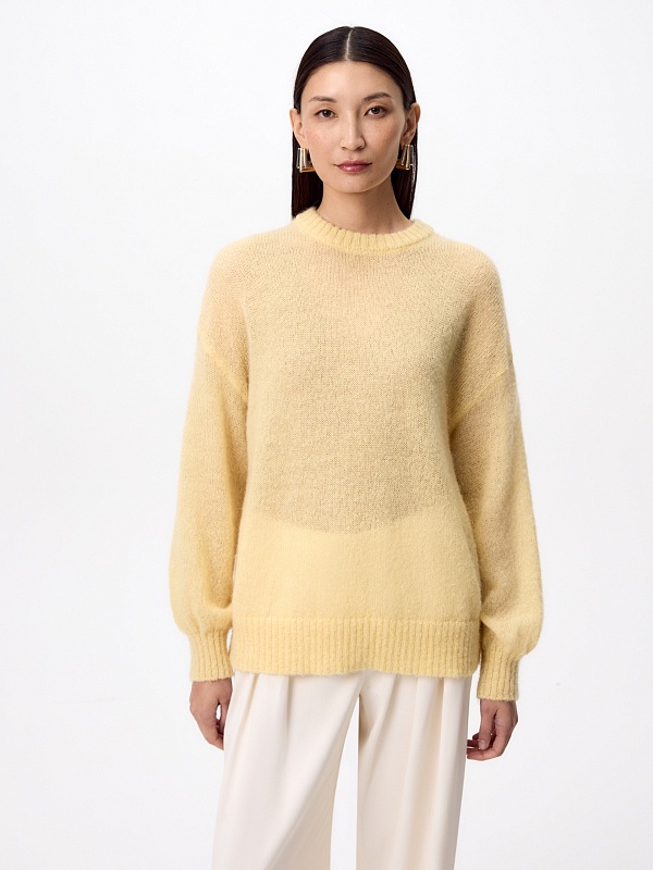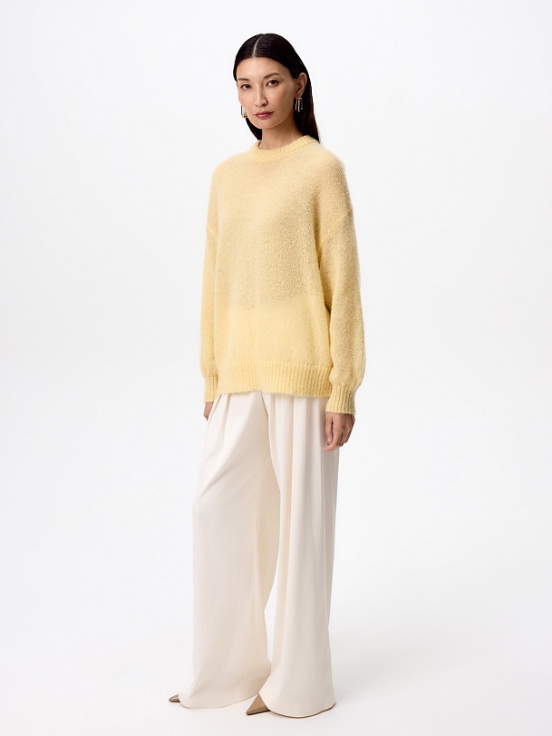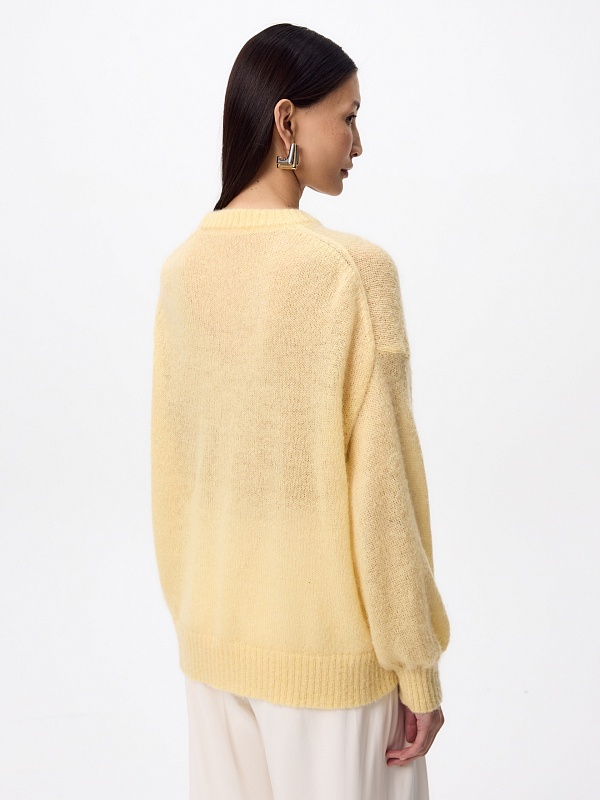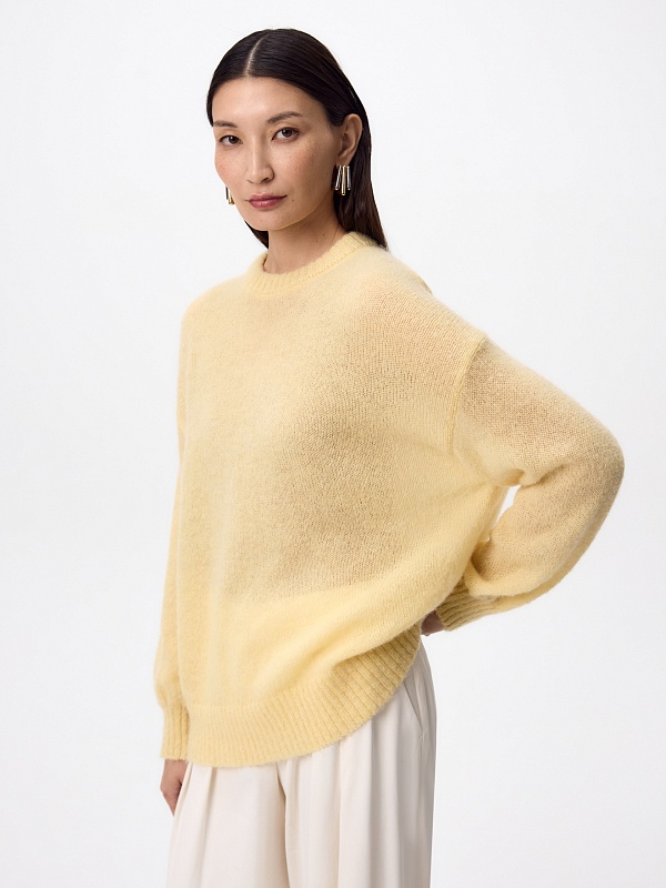 Свободный мягкий джемпер лимонного цвета. У джемпера круглая горловина, втачной рукав со спущенным плечом и смещунным плечевым швом.