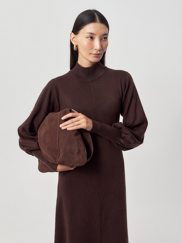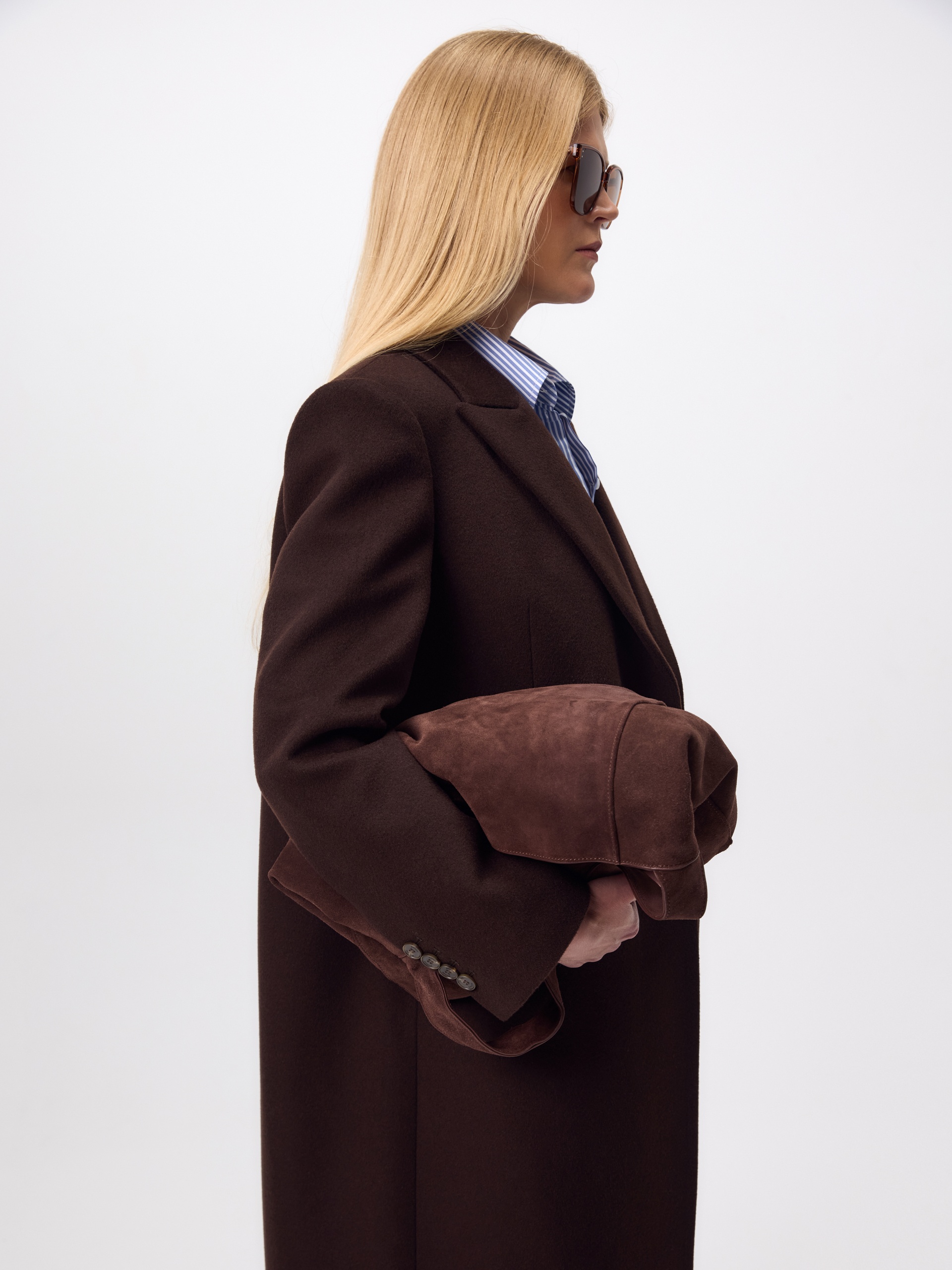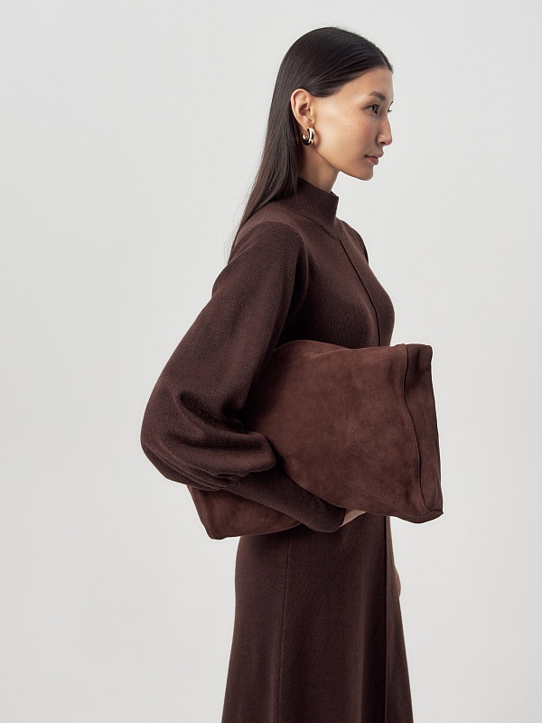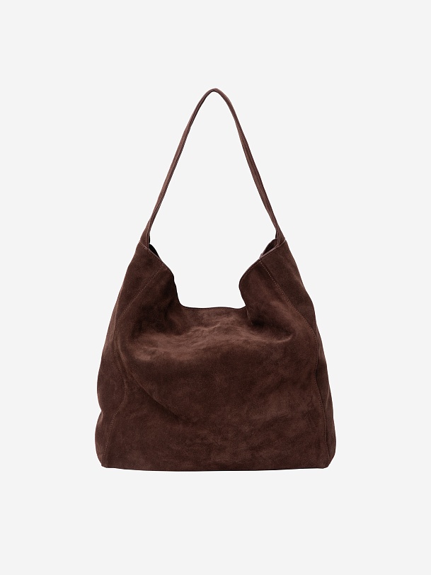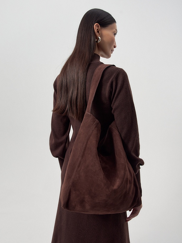 Замшевая сумка шоппер в цвете горький шоколад. Совмещает в себе лаконичность дизайна и вместительность. Внутри кармашек на молнии и один большой раздел для всего самого необходимого.