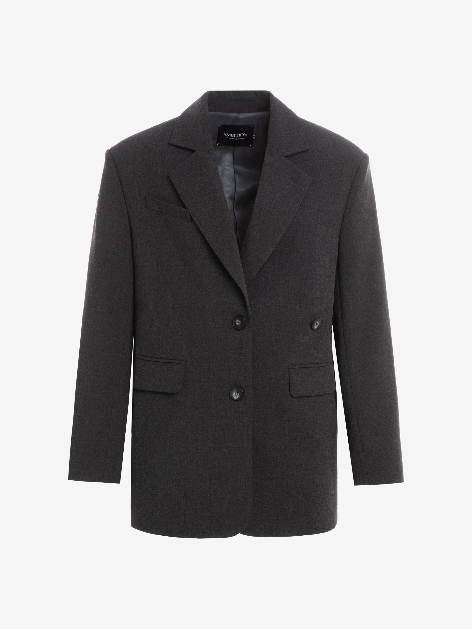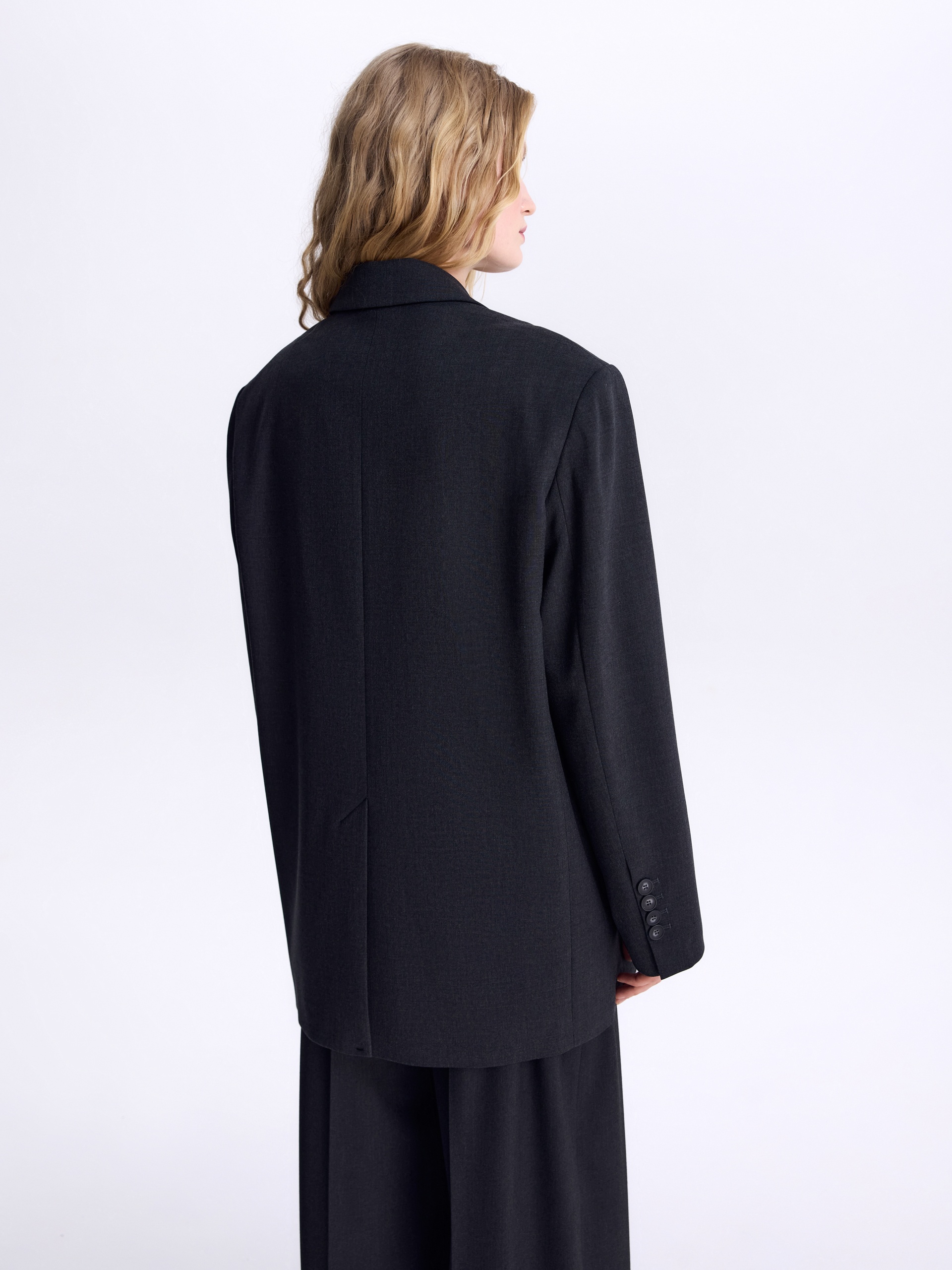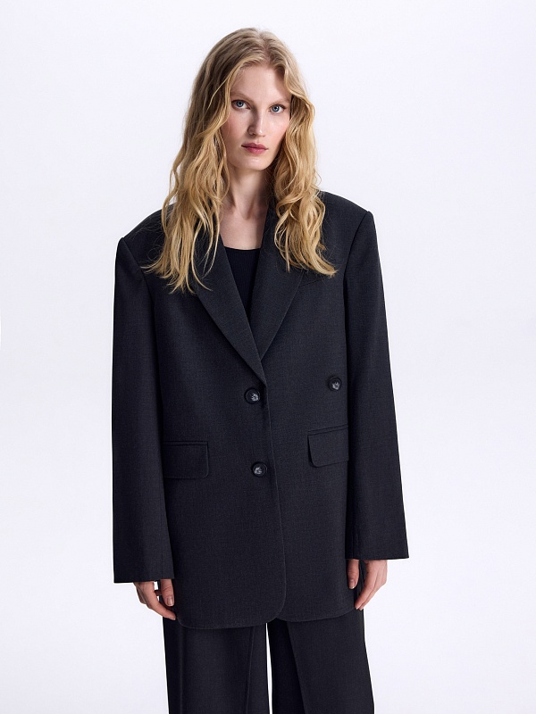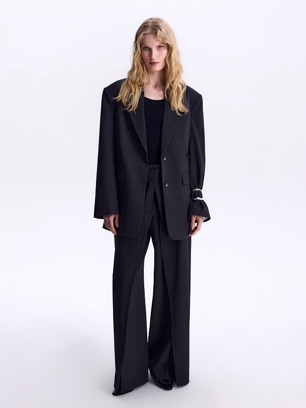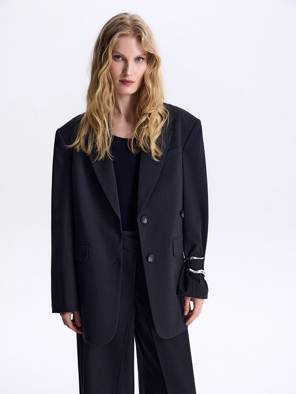 Свободный однобортный жакет из костюмной ткани в глубоком сером цвете. Линия плеча расширена, рукав втачной, свободный. На рукавах контрастная подкладка в полоску, можно красиво и стильно подвернуть рукав, что создаст небольшой интересный акцент. У жакета английский воротник. Жакет отлично сочетается с моделями из этой же капсулы.