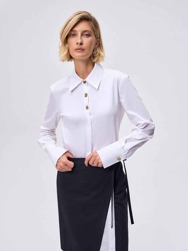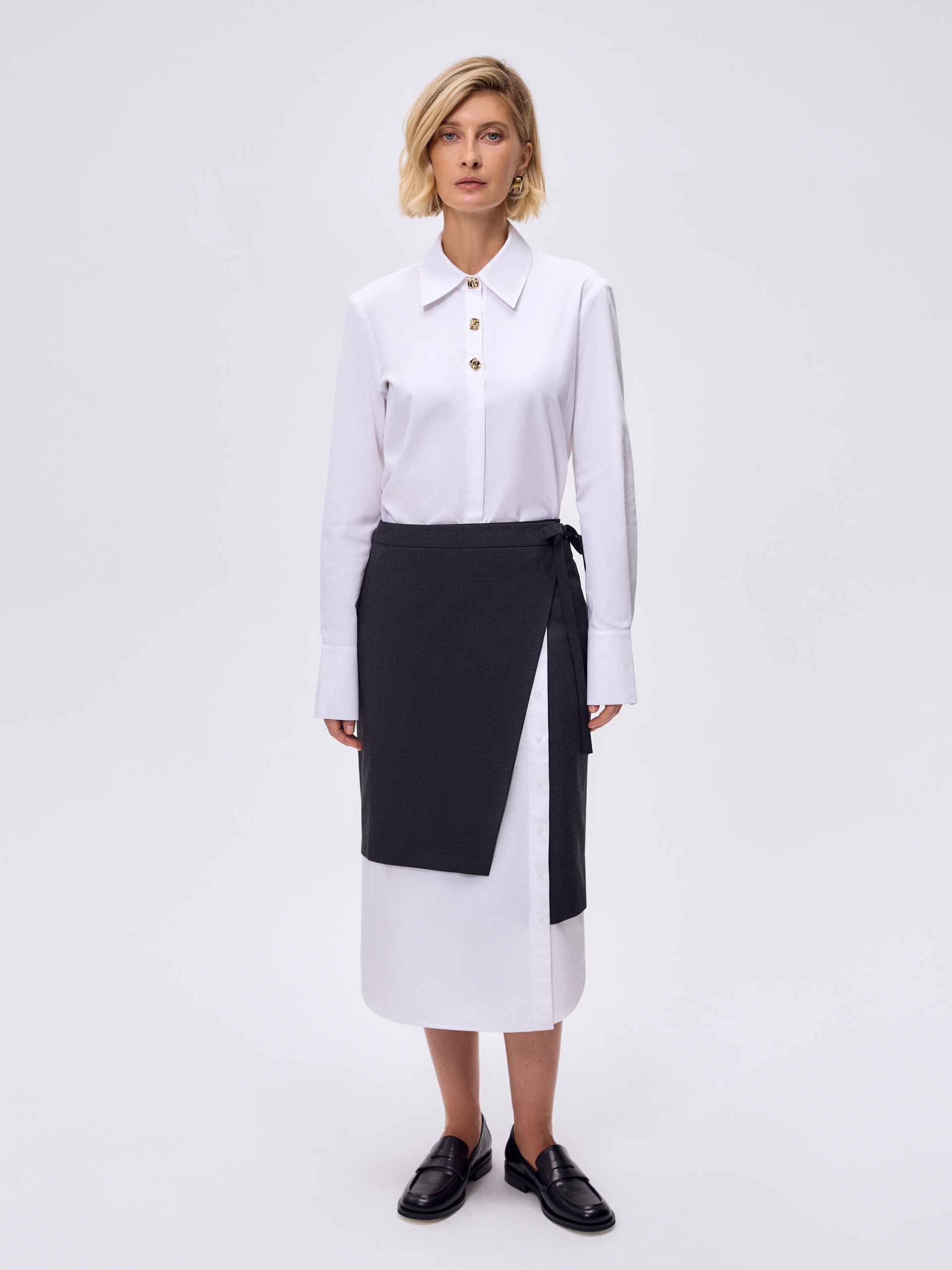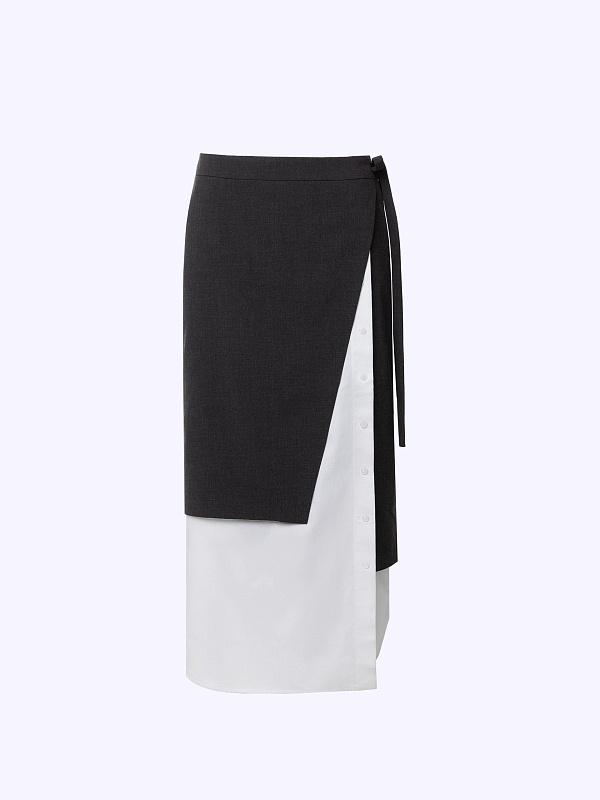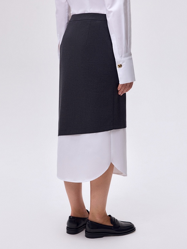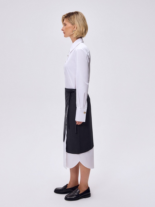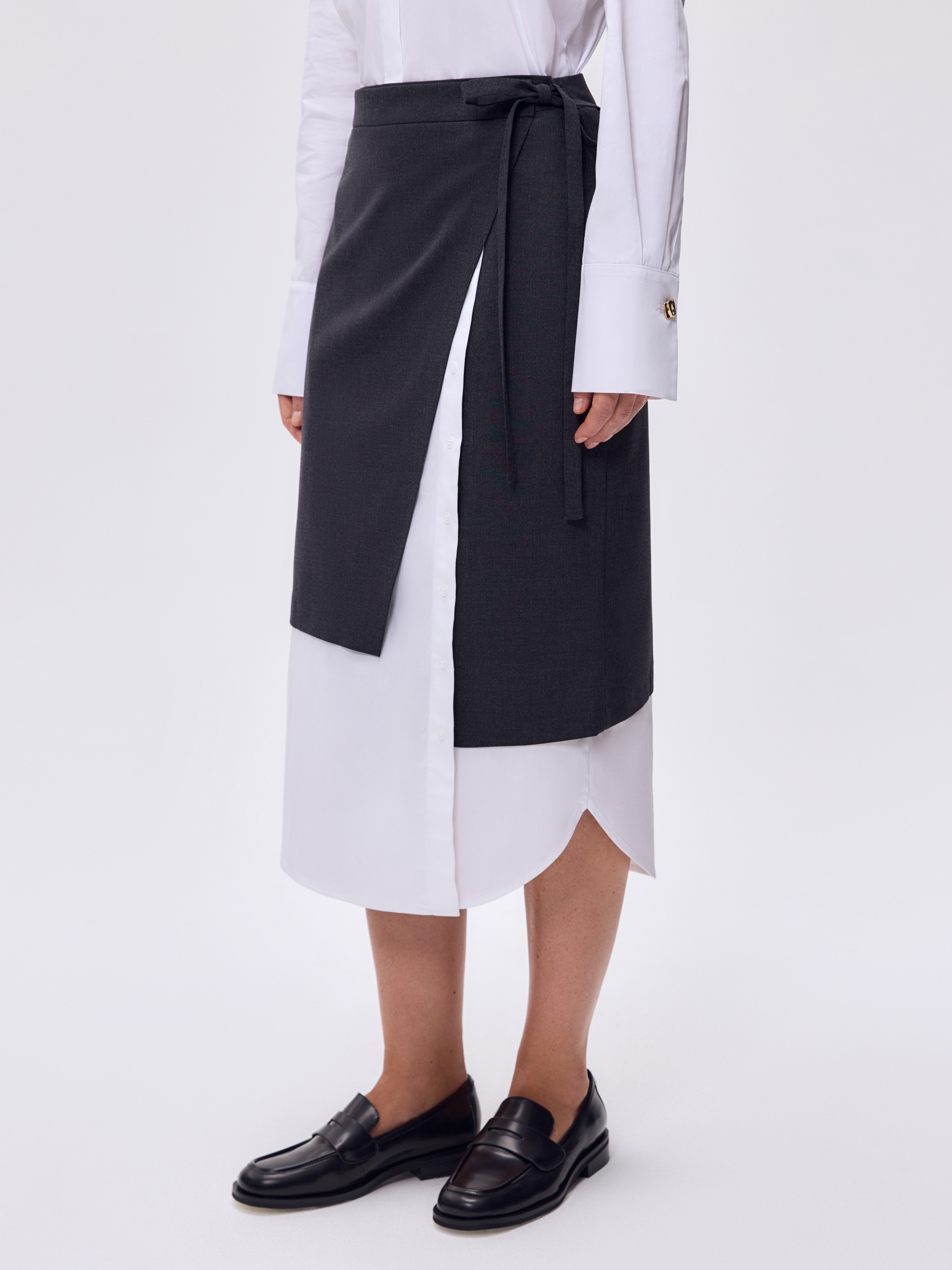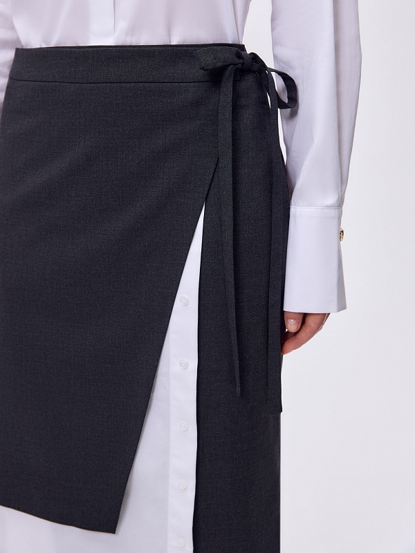 Юбка прямая на средней посадке из костюмной ткани в глубоком сером цвете. Юбка носится на запах, имеет съемный декоративный элемент, имитирующий "выглядывающую" снизу рубашку. За счет активной асиметрии юбка смотрится интересно и может разнообразить повседневный образ. Юбку можно носить без декоративной рубашки в качестве фартучка поверх брюк или джинс. Юбка имеет удобный длинный поясок и вытачки на спинке, благодаря чему можно носить юбку на разной посадке.