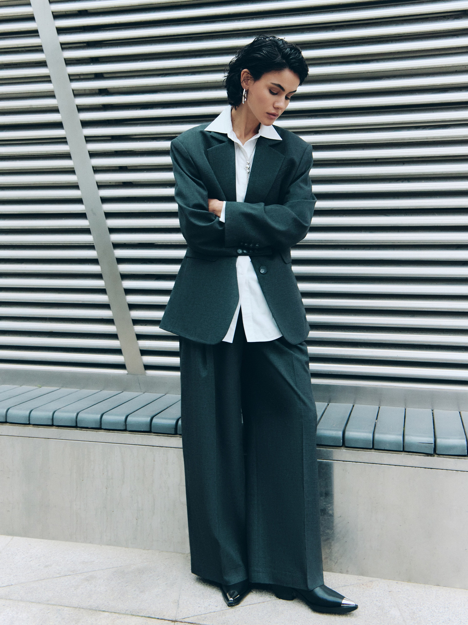 Широкие брюки со складками на высокой посадке из костюмной ткани в глубоком сером цвете. Брюки на притачном поясе со шлевками. Спереди глубокие складки, на спинке талиевые вытачки и декоратичные листочки. Главная особенность данных брюк - спрятанные в складках спереди карманы.