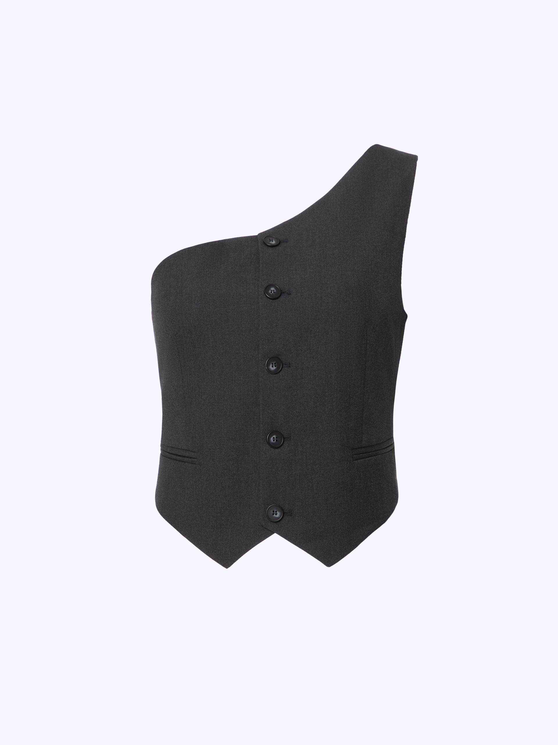 Асимметричный прилегающий жилет на одно плечо в костюмной ткани в глубоком сером цвете. Жилет однобортный на ряд пуговиц, с рельефами и вытачками для лучшей посадки по фигуре. Спереди есть декоративные листочки. За счет асимметрии смотрится стильно как поверх чего-то, так и как самостоятельная вещь.