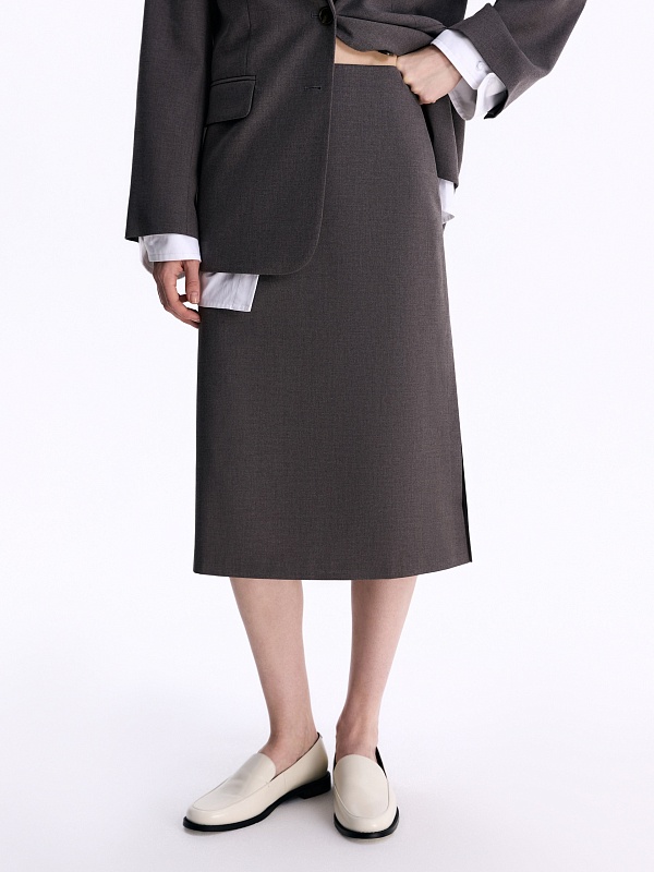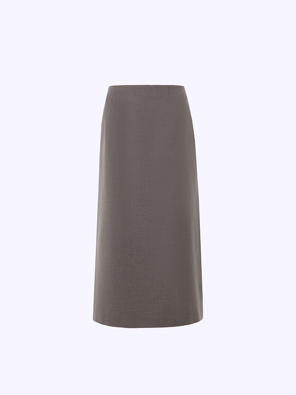 Юбка из костюмной ткани в цвете вулканический песок. Юбка на средней посадке, прямая с небольшим расширением книзу. По боковым швам юбки внизу высокие разрезы.