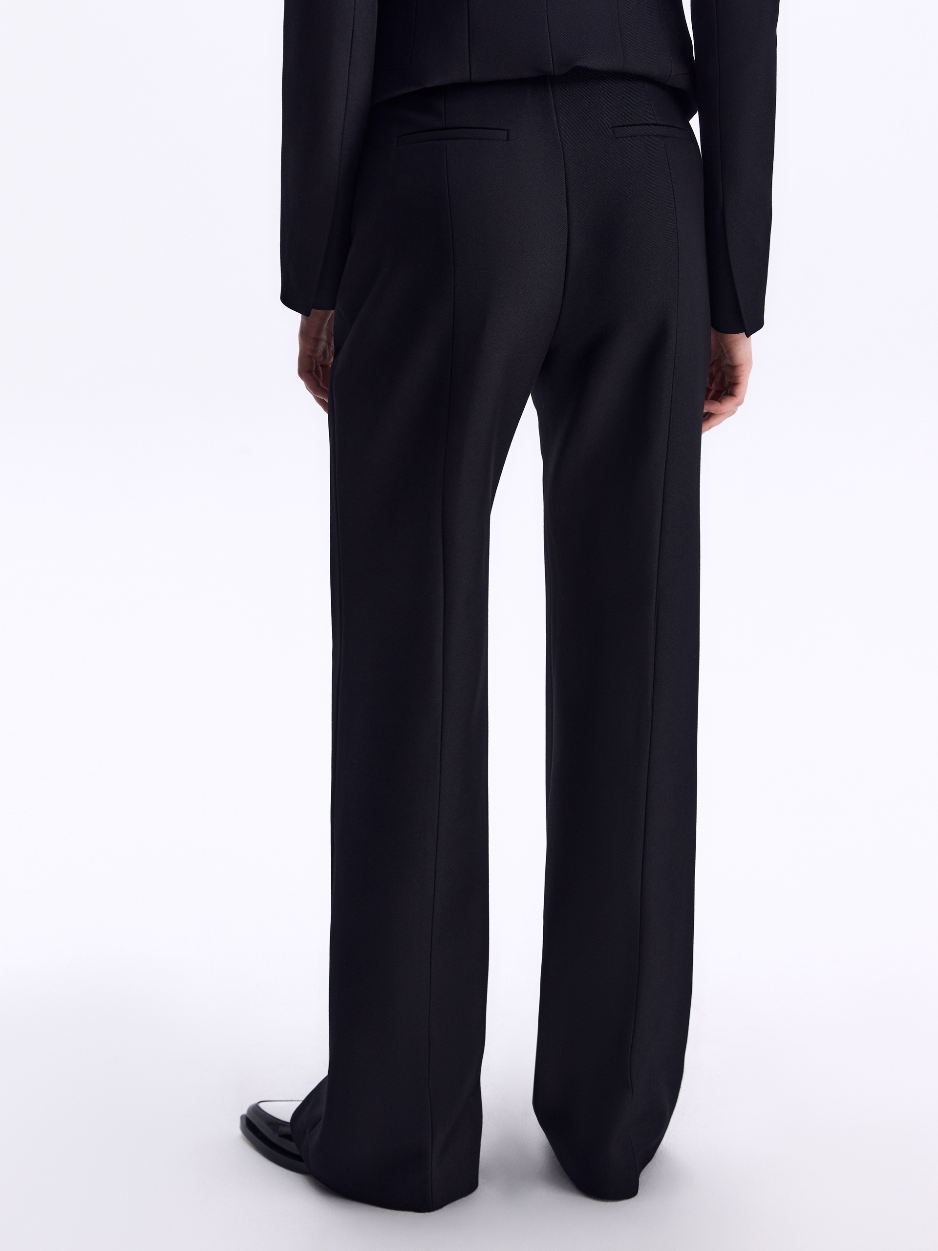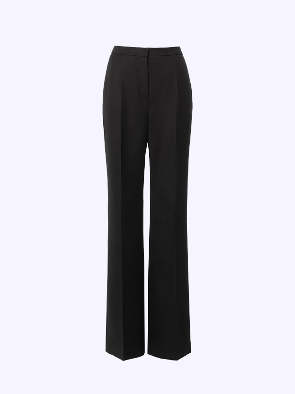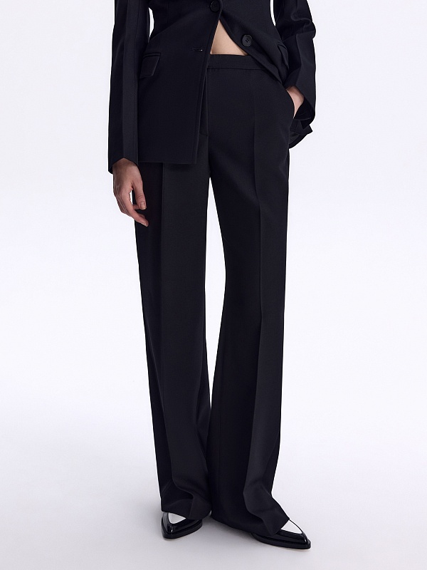 Не просто брюки — идеальная база для сотни образов. Полуприлегающий крой подчёркивает фигуру, стрелки удлиняют силуэт, лёгкий клёш даёт ощущение свободы, а костюмная ткань диагональ в насыщенном черном цвете добавляет статусности, давая пространство для экспериментов.